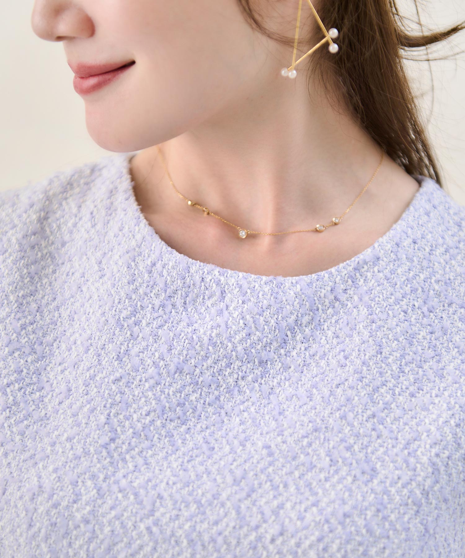 シンプルながらきらっとしたビジューが着映える一枚。アクセサリーいらずで着るだけでお洒落が決まるお手軽アイテムです。ビジューはアイボリーとブラックの2色をランダムに使用することで奥行が生まれ、表情豊かに仕上げました。パンツとスカートどちらにも合わせやすいよう着丈はやや短めに設定。デートの場所や相手の好みに合わせてスタイリングできます。