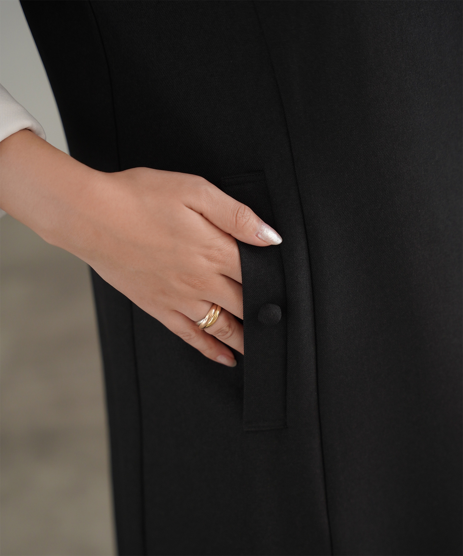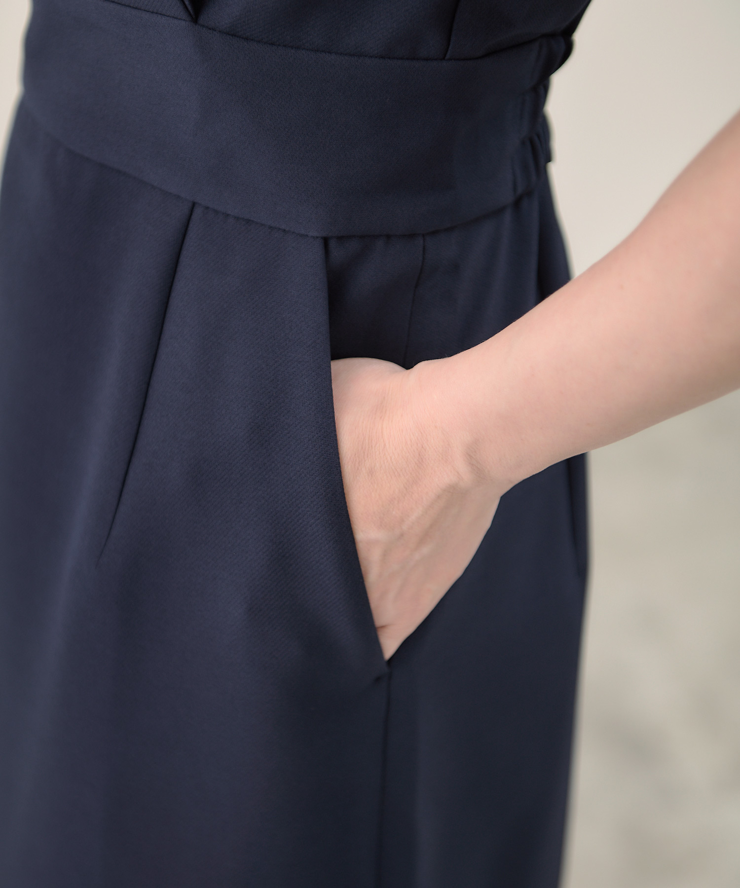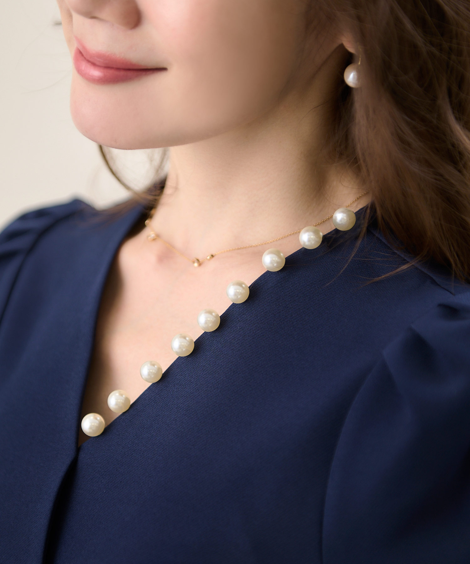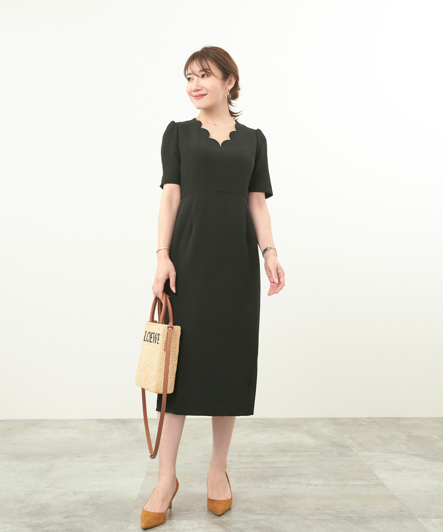 パーティー感のあるイミテーションパールを首元にあしらったシンプルなワンピース。張り切り過ぎず、でも大人のセンスが光る好感度の高いワンピースです。ミモレ丈のタイトスカートで縦のラインを強調したほっそりデザイン。