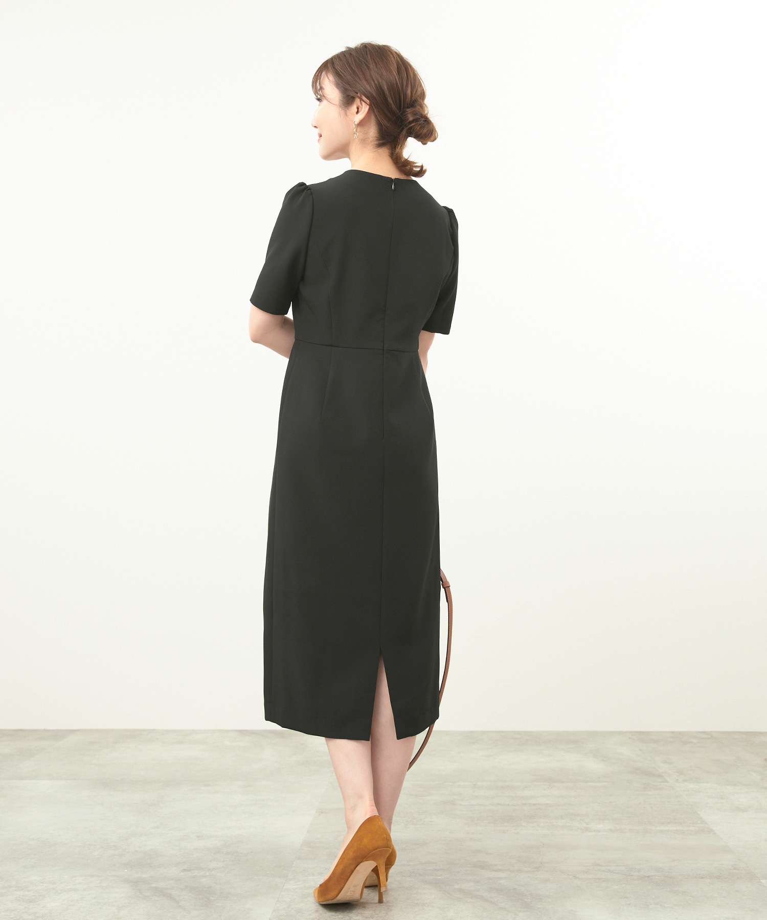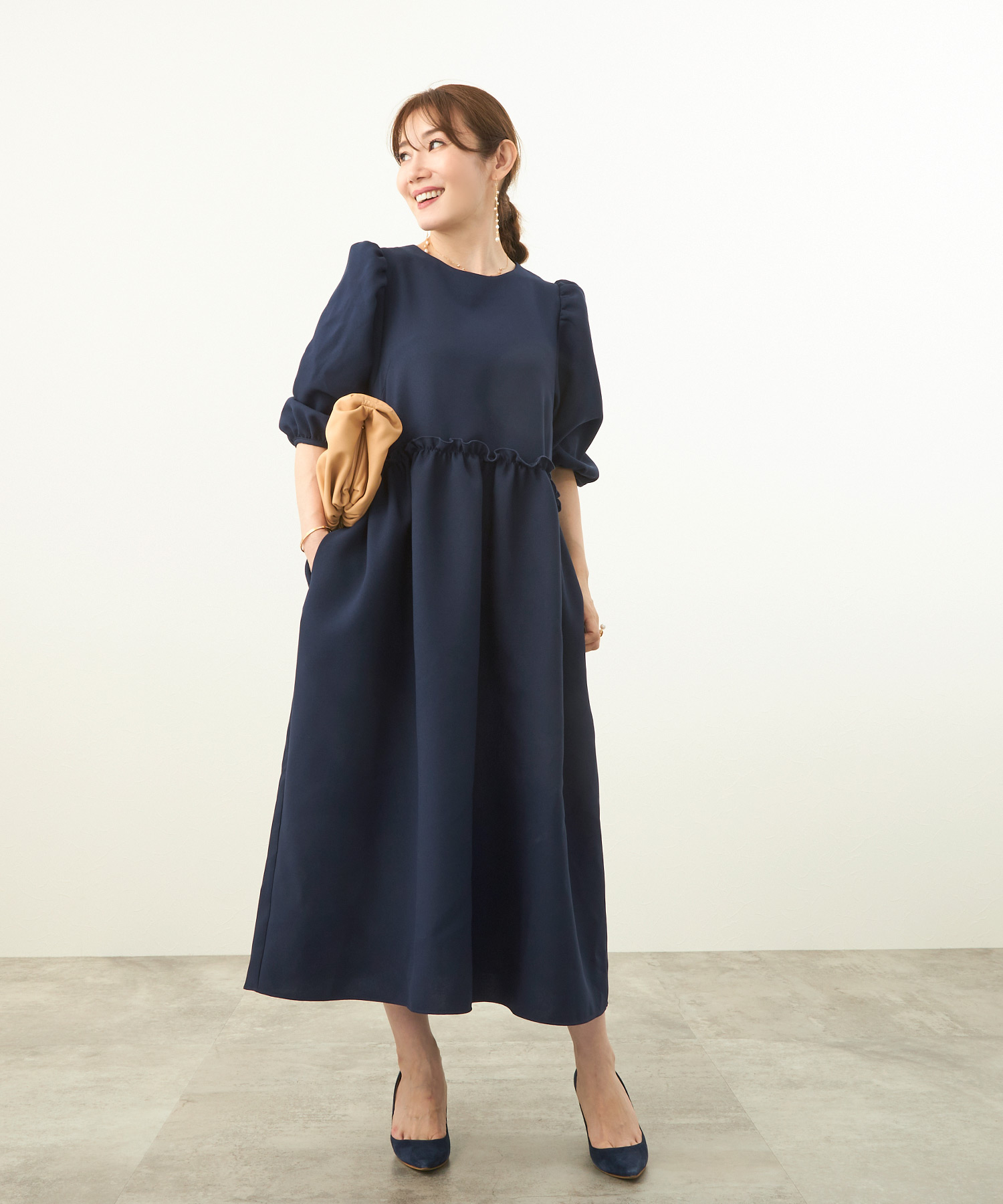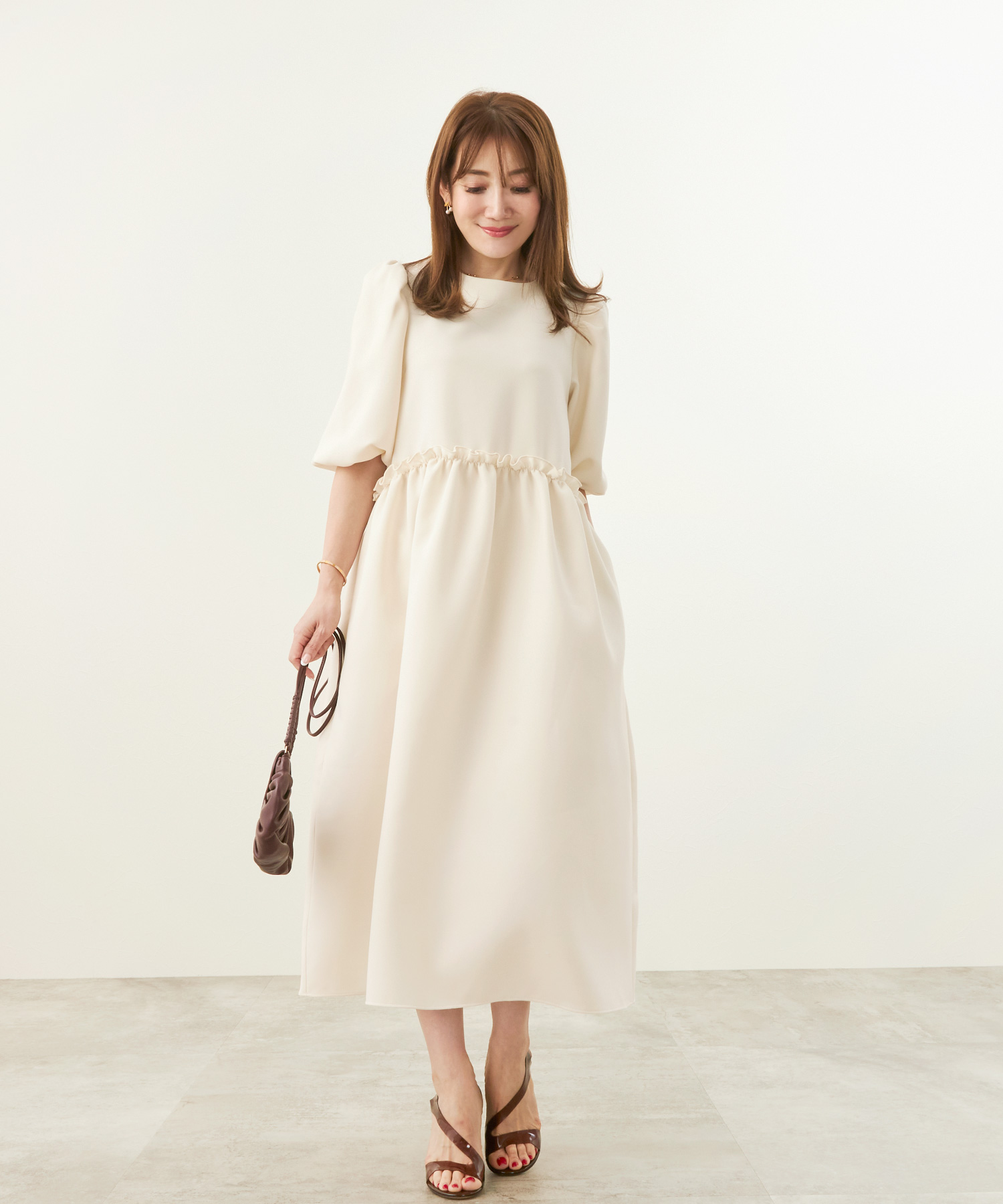 シンプルながらデザイン性があり、バックの小粒パールが上品で特別感のある一枚。タックを施したパフスリーブややや低めのウエスト切り替え位置は、大人らしく落ち着いた雰囲気を作り出します。着る場所を限定せず、フォーマルなシチュエーションでも活躍するのでコスパも◎。低身長の方にはXSサイズがおすすめです。