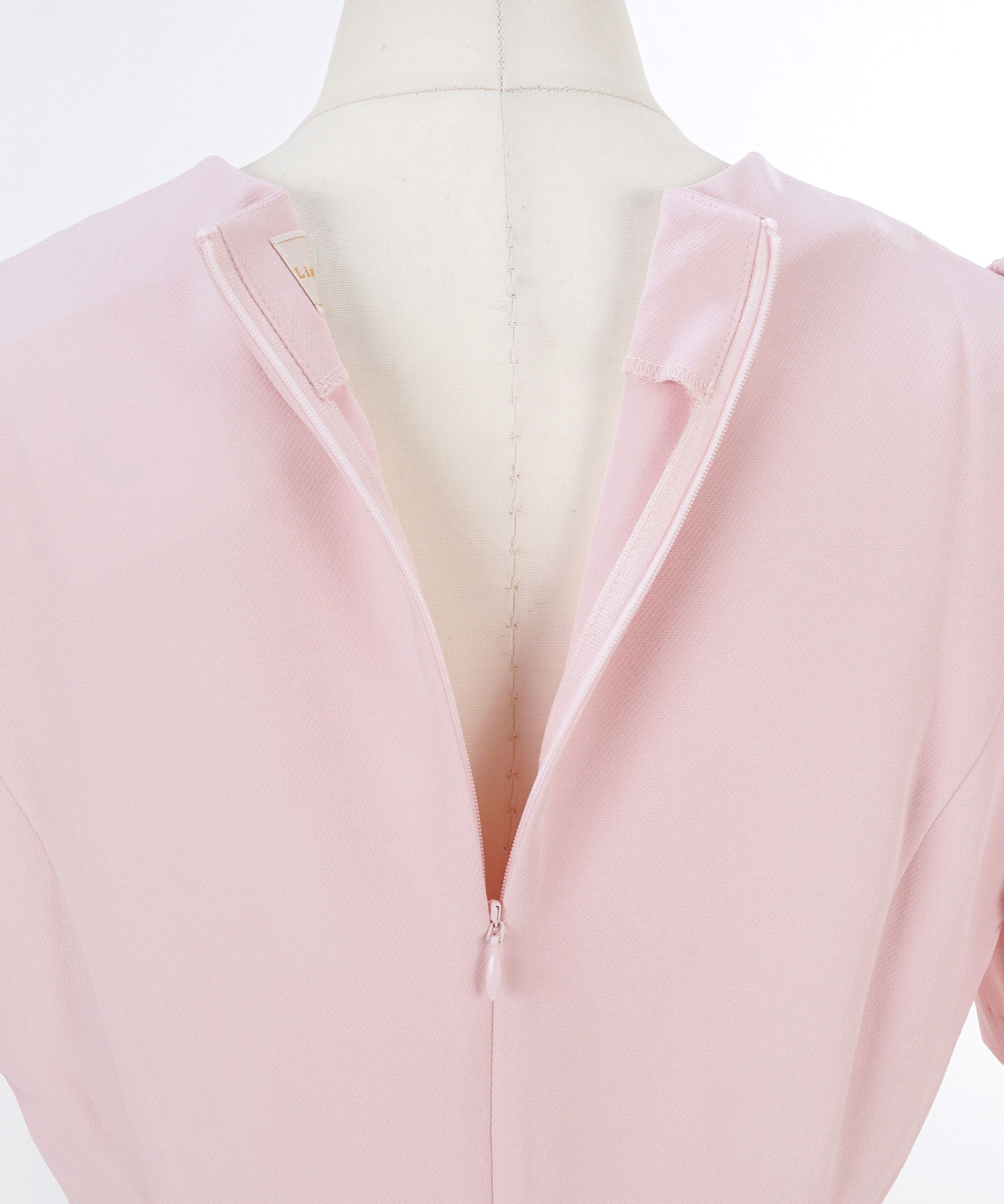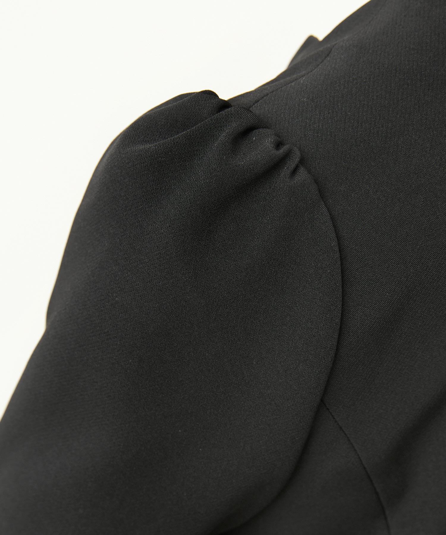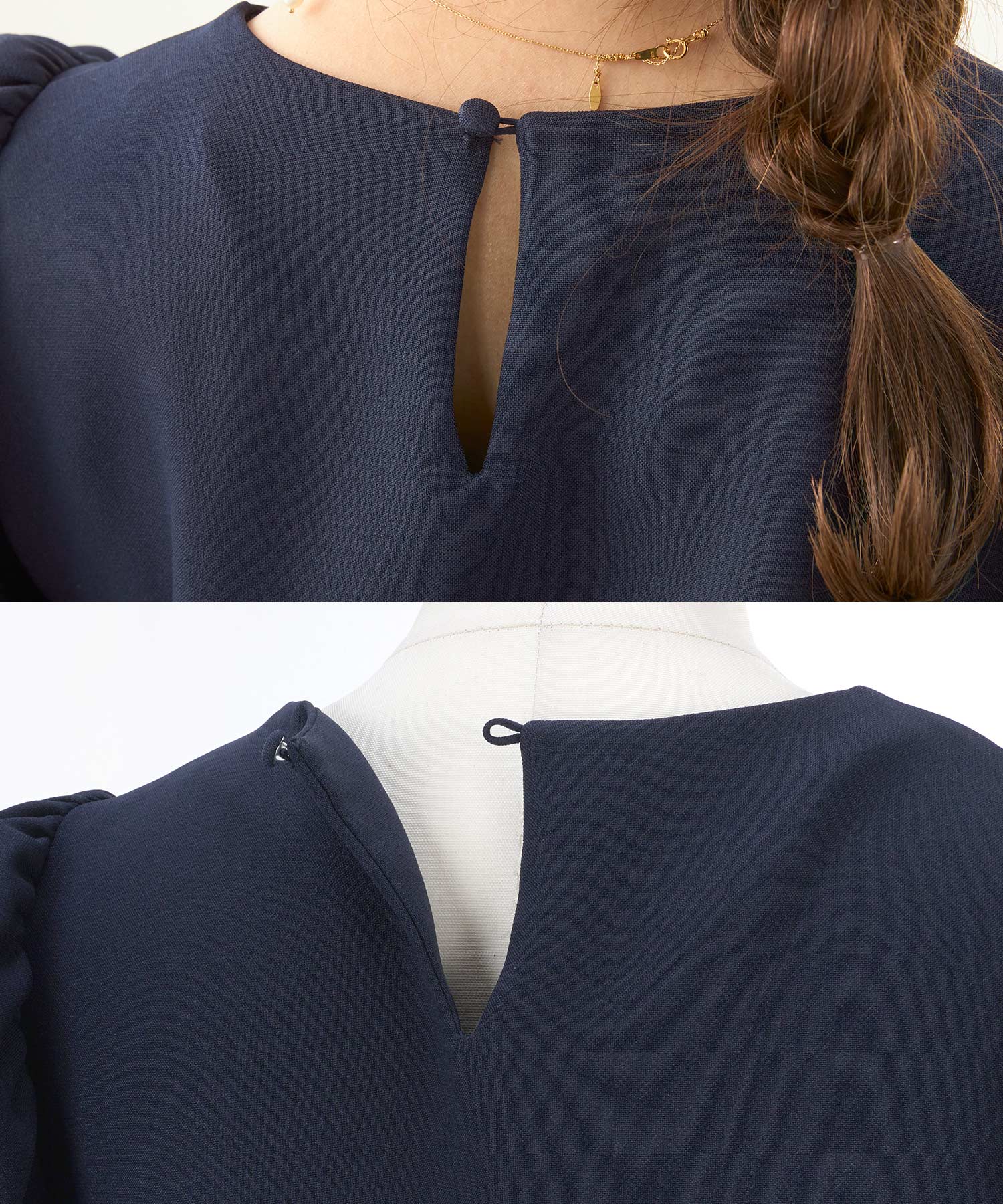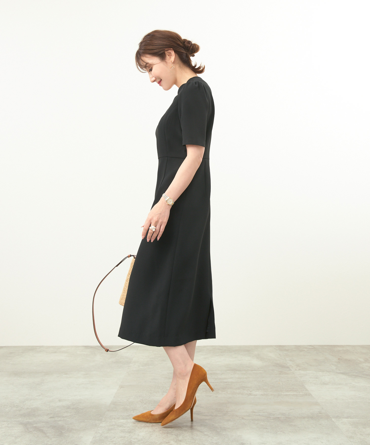 シンプルながらデザイン性があり、バックの小粒パールが上品で特別感のある一枚。タックを施したパフスリーブややや低めのウエスト切り替え位置は、大人らしく落ち着いた雰囲気を作り出します。着る場所を限定せず、フォーマルなシチュエーションでも活躍するのでコスパも◎。低身長の方にはXSサイズがおすすめです。