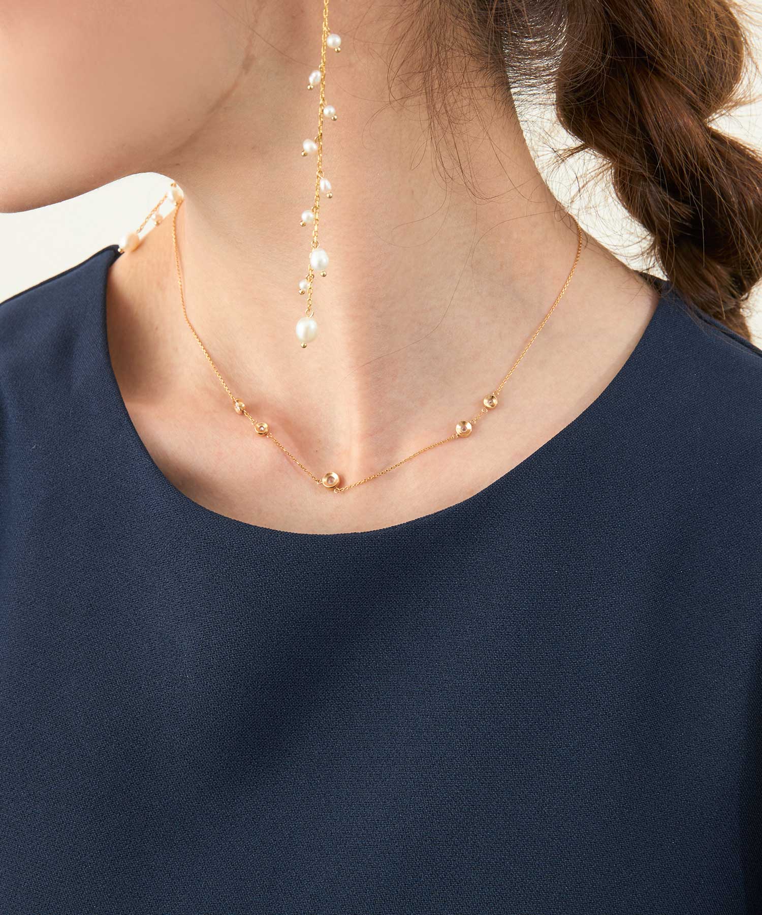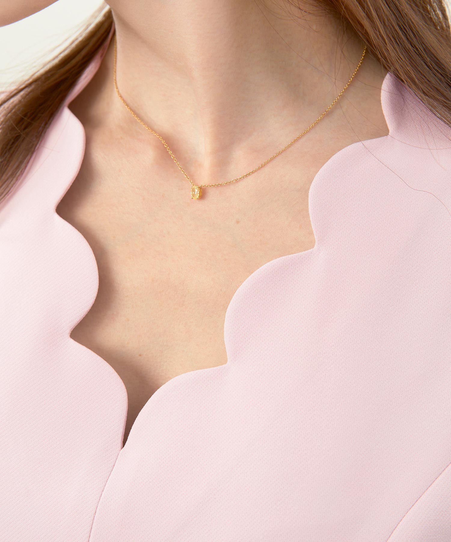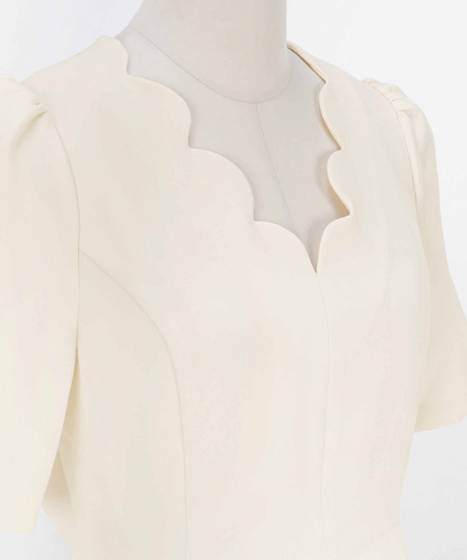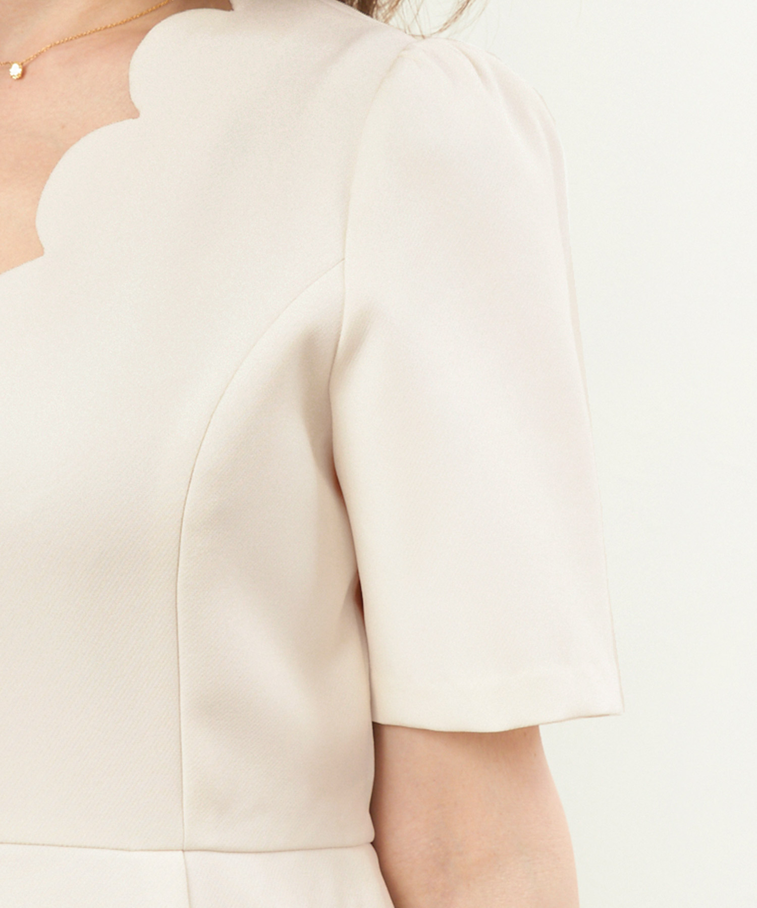 肌になじみやすく、大人の魅力があふれるベージュをチョイス。顔色を明るく見せてくれるカラーで男性からの好感度も手に入ります。首元はスカラップ仕様で華やぎをキープ。華奢なネックレスを合わせるとより上品さが際立ちます。