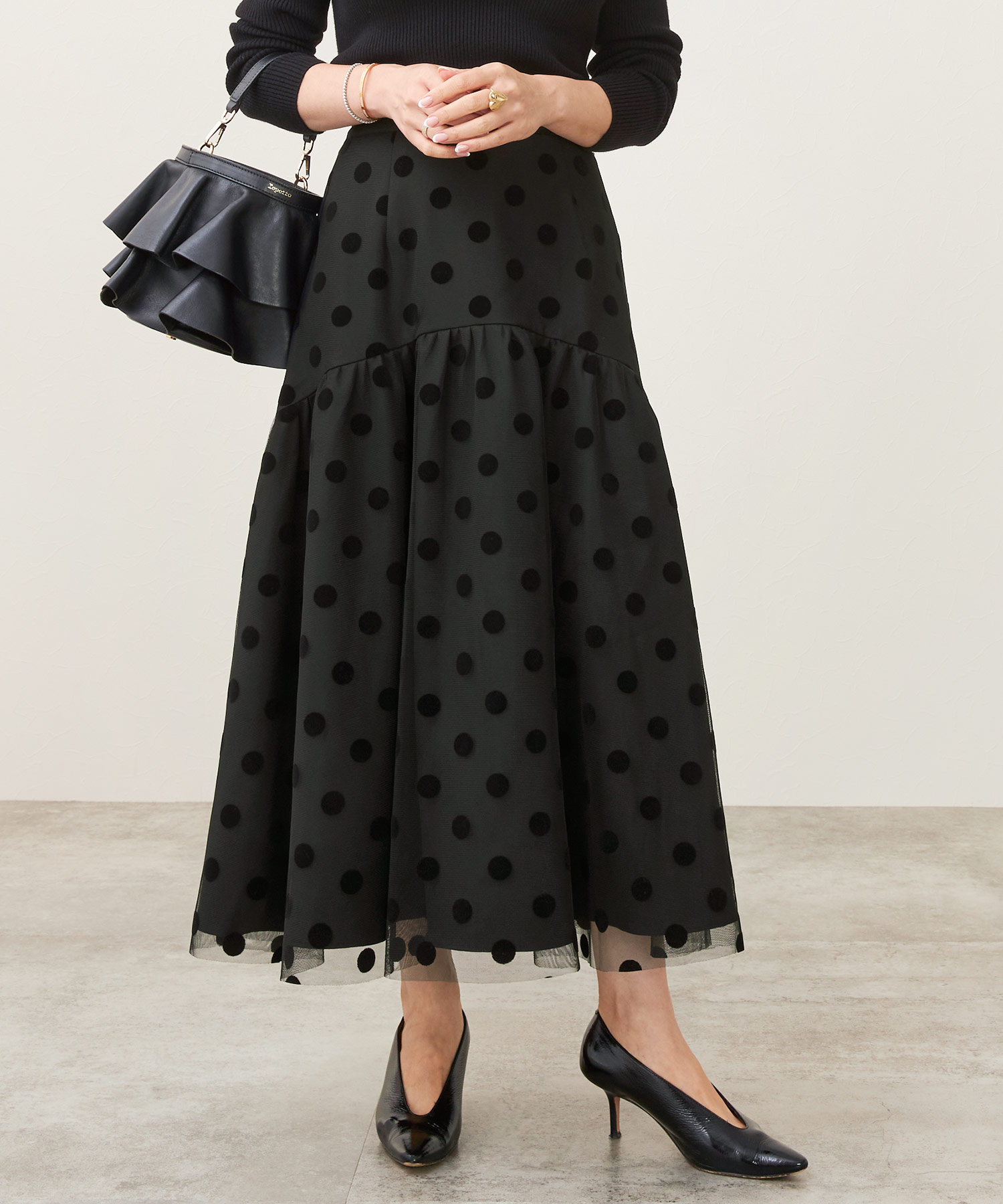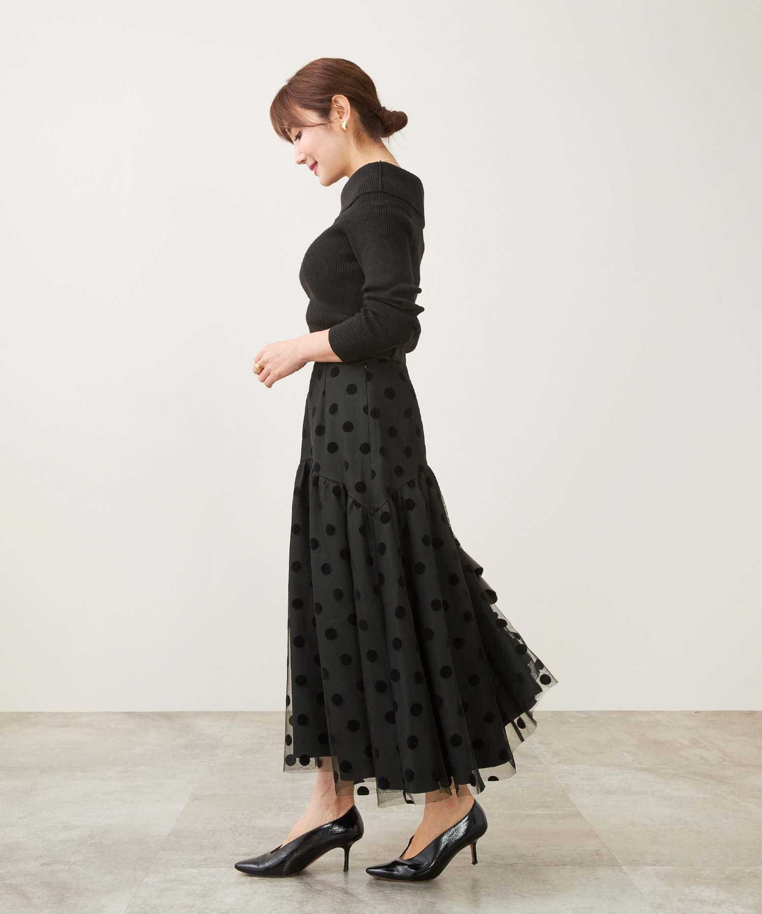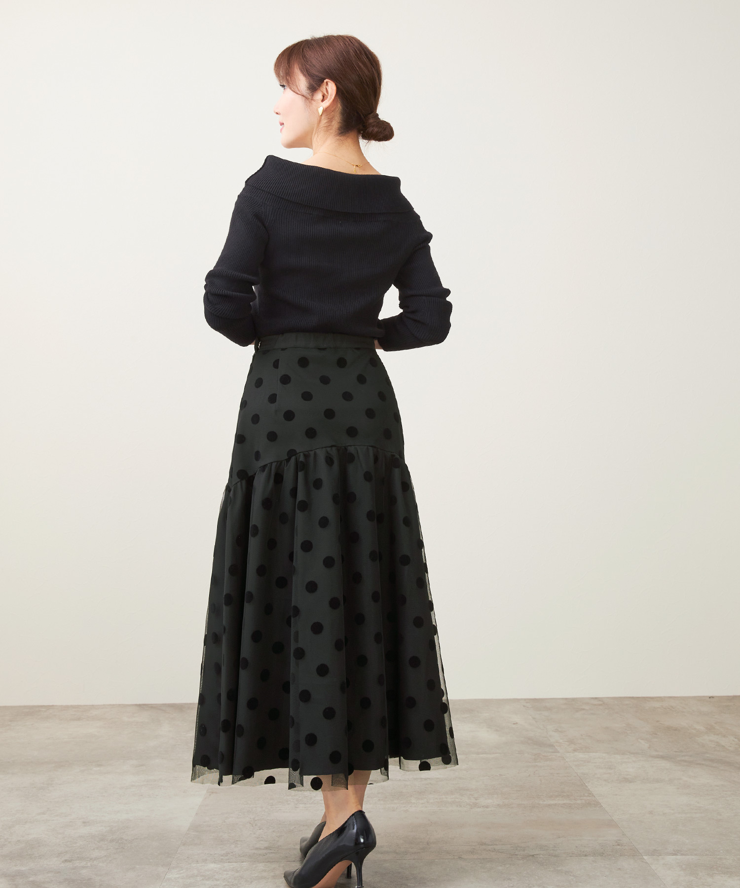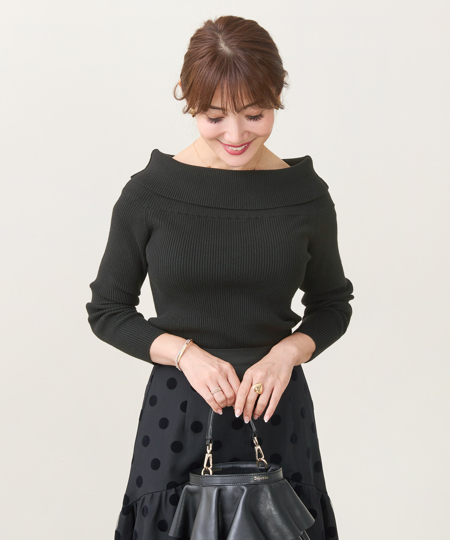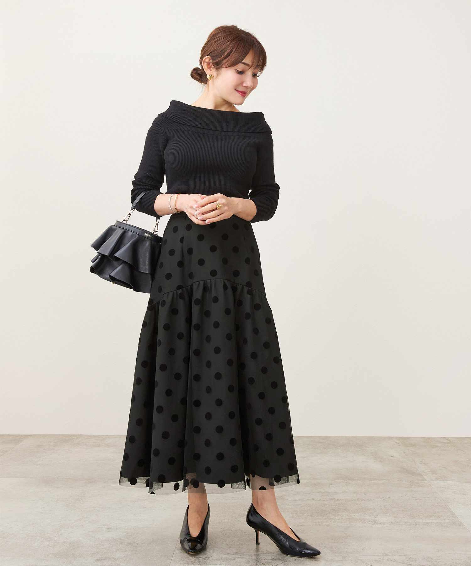 オフショルダーでデコルテをアピールしたさり気なく女っぽさを感じさせるコーディネート。体のラインを美しく見せつつ、温かみを感じさせるリブニットに、ボトムスはドット柄のスカートを選んで大人可愛く仕上げました。華やかさと程よいカジュアル感で親しみやいお姉さんスタイルの完成です。
