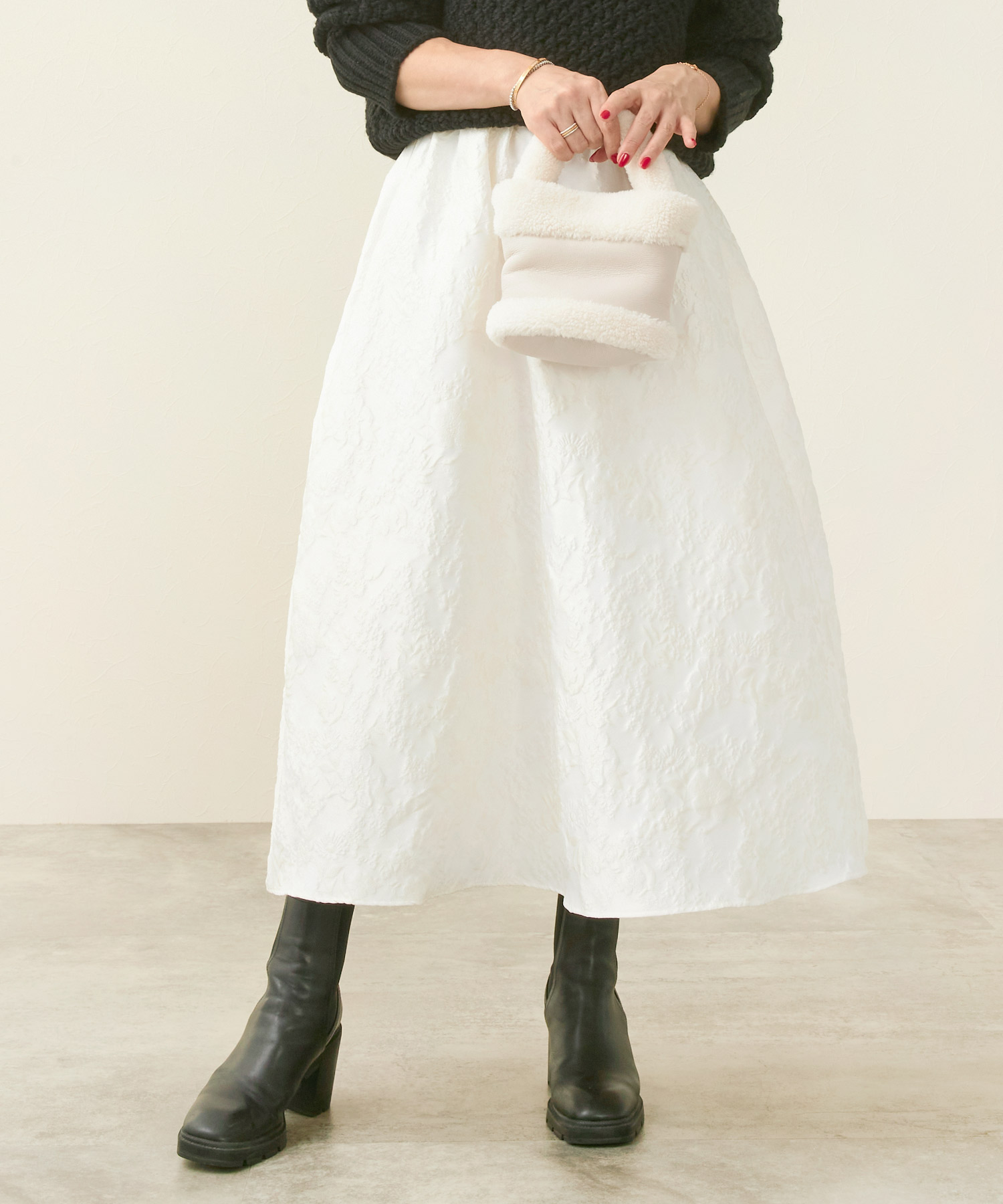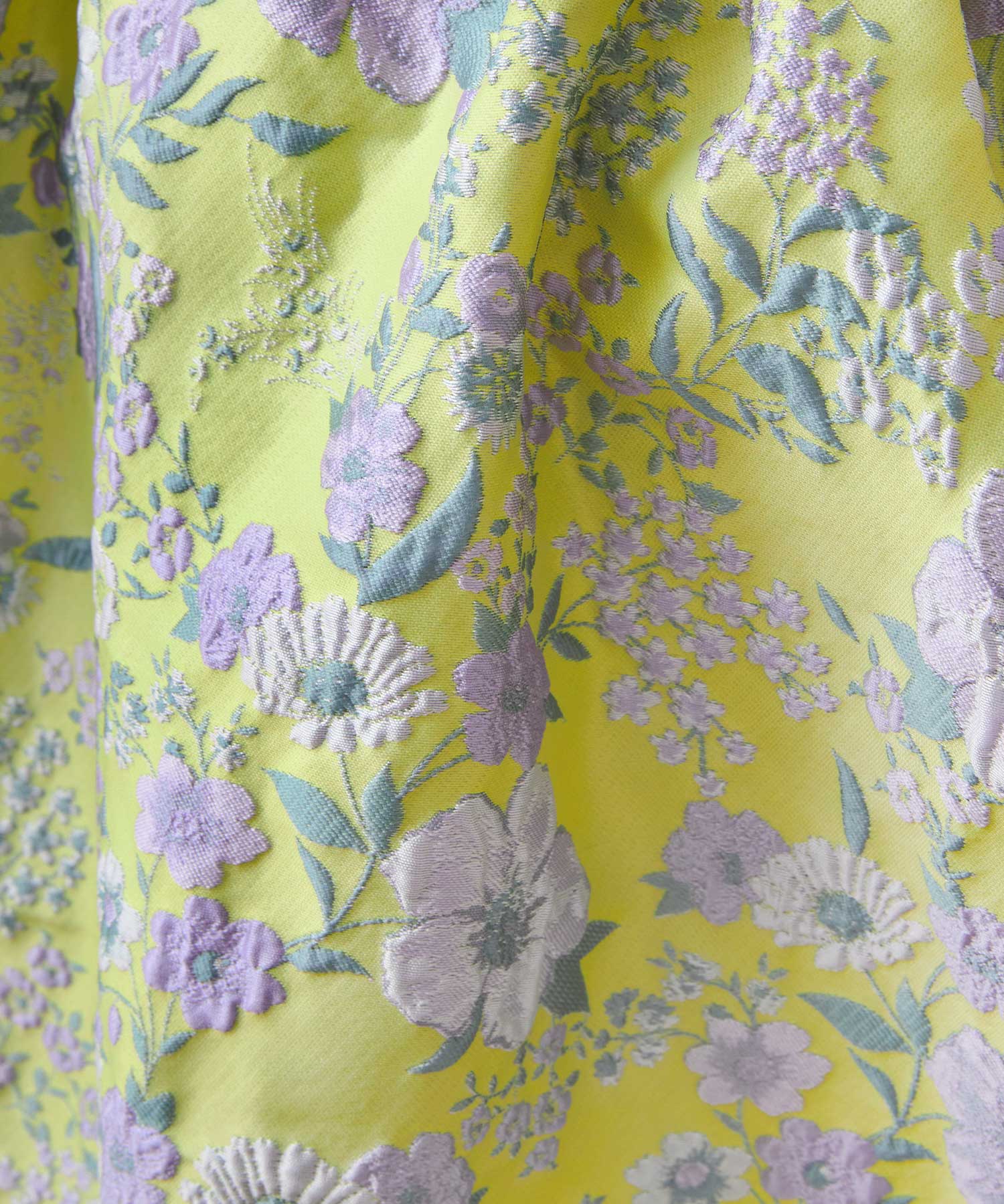華やかで上品な印象をあたえるフラワージャガード生地のスカート。ジャガード織ならではの凹凸感は高級感がありお嬢さん感を演出してくれます。イエロー×ラベンダーと単色アイボリーの2色展開でどちらも優雅で存在感のあるカラーですが、初デートならハッピー感のあるカラフルなイエロー×ラベンダーカラーがおすすめです。