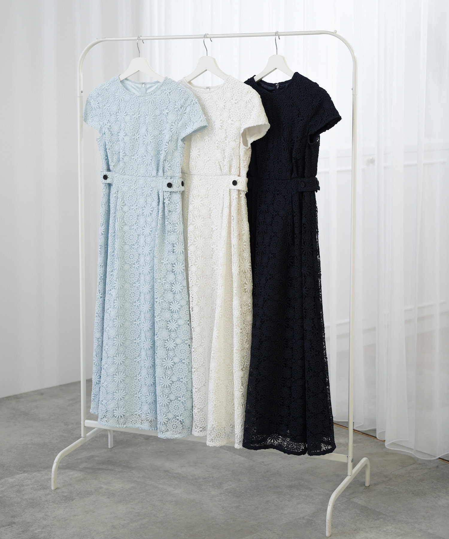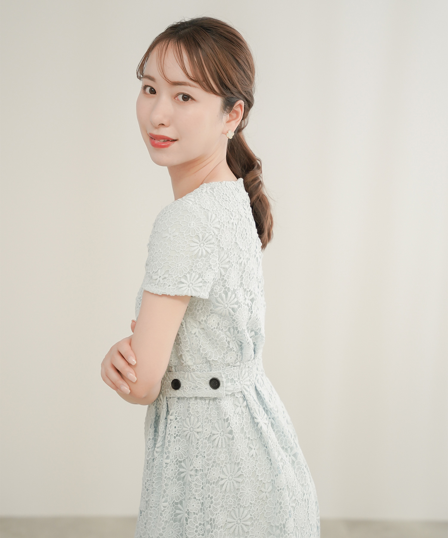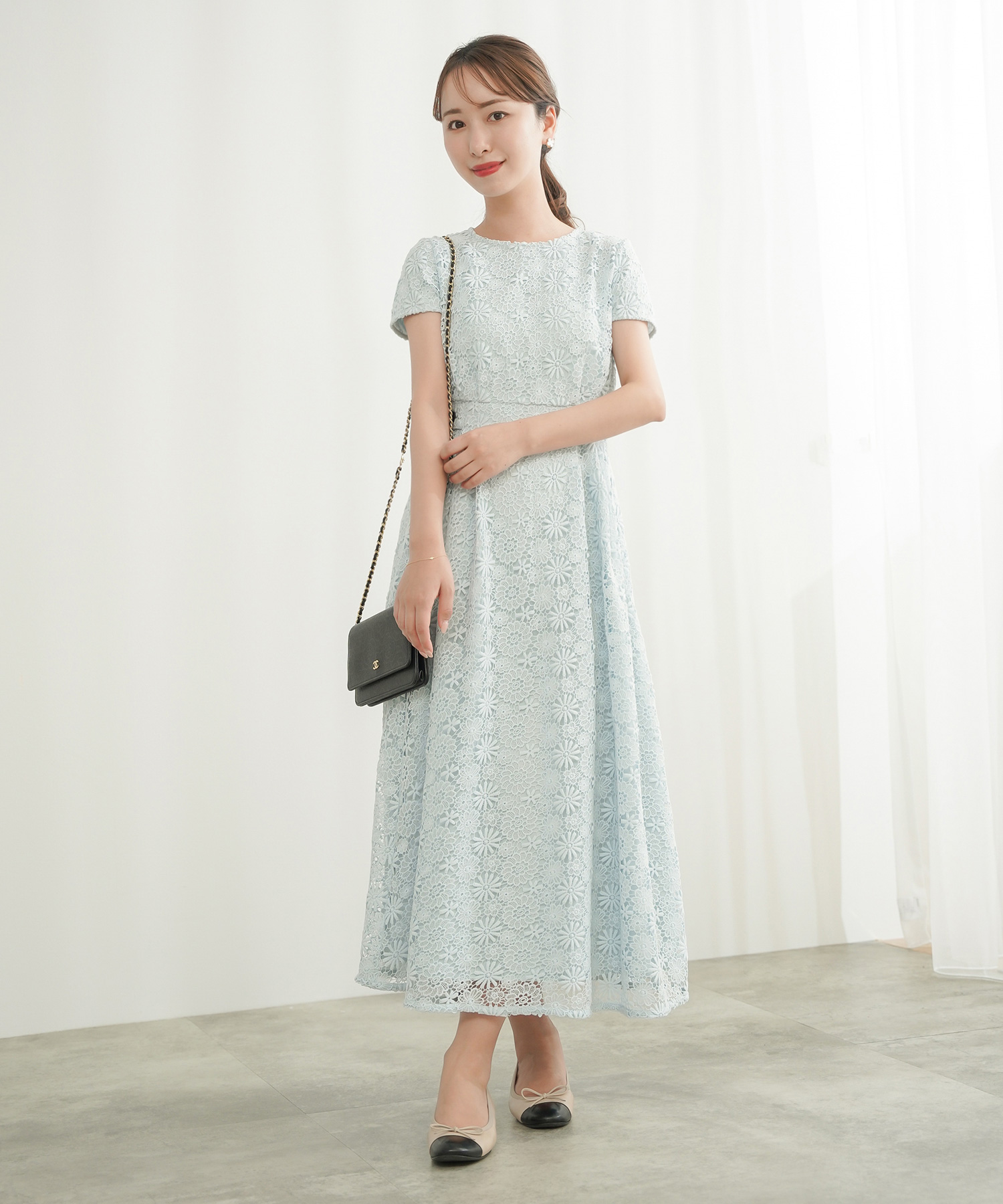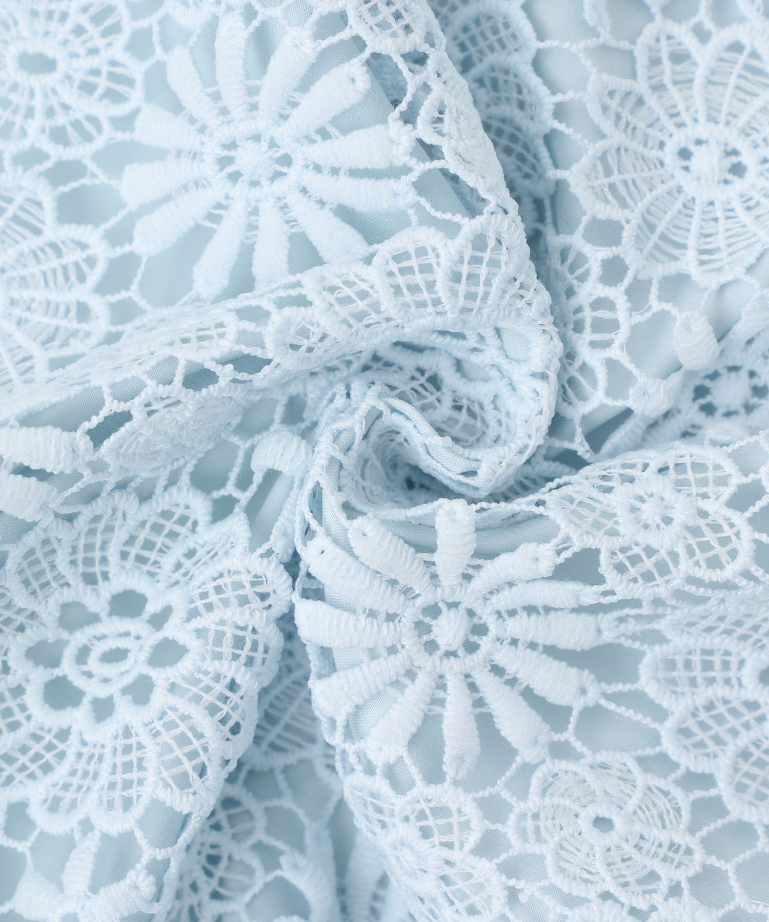 ■サックスカラーの総レースワンピースならヘルシー美人に