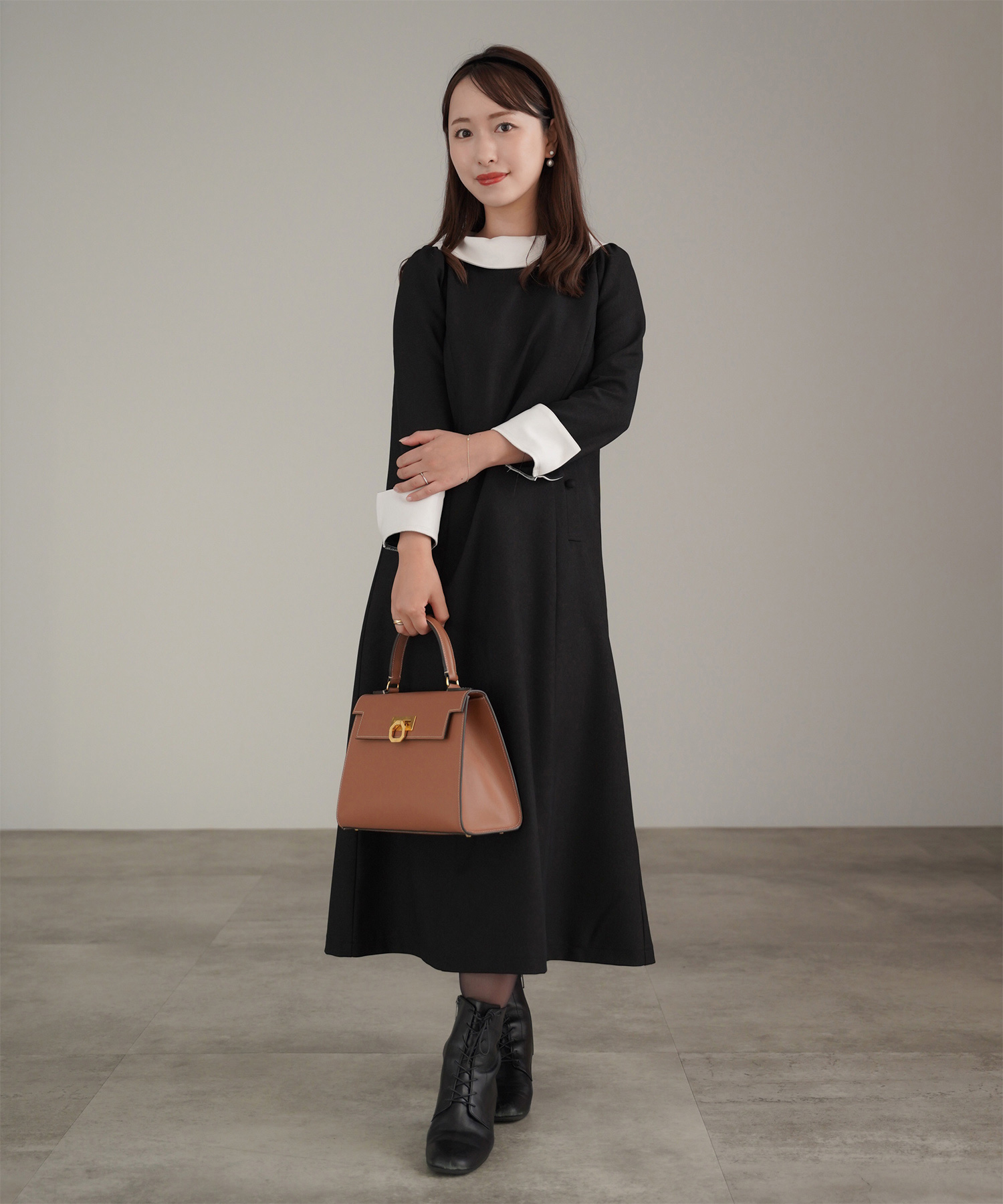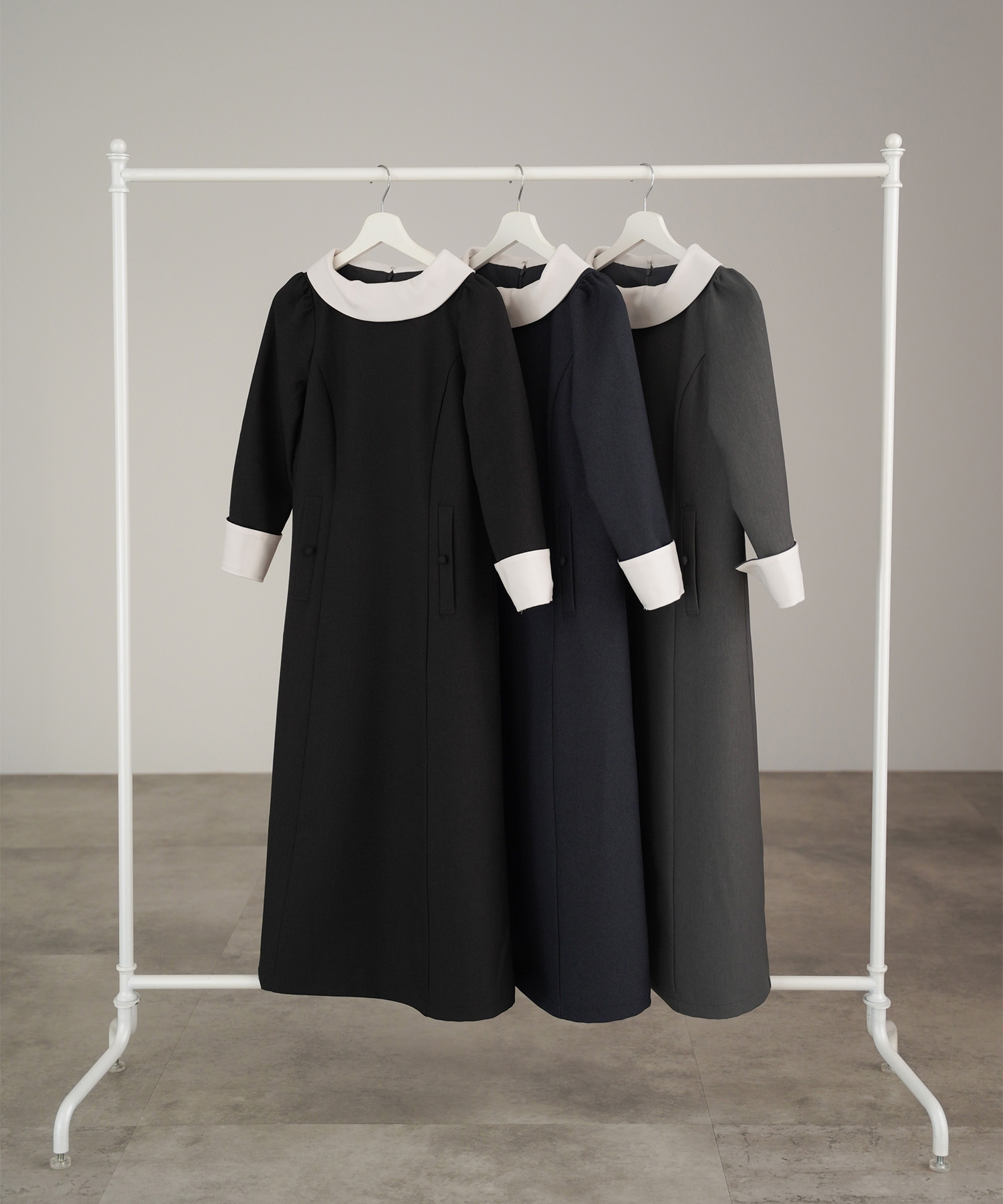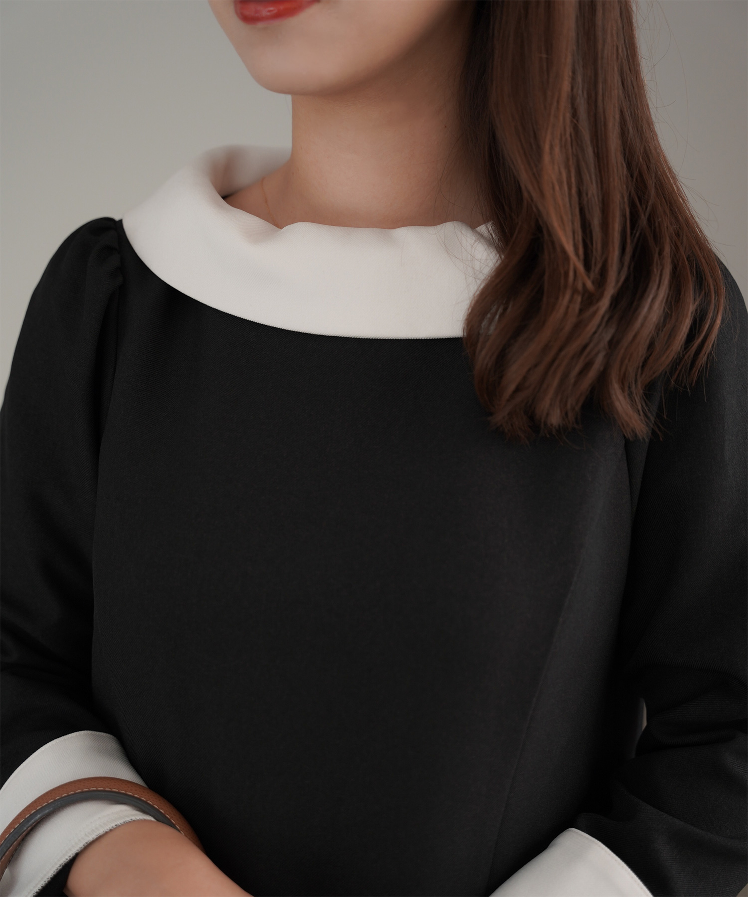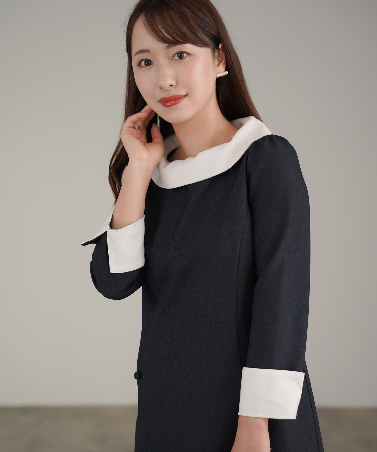 きちんと感と女性らしさを兼ね備えたロールカラーデザインのワンピース。シックな中にも襟や袖口を配色に仕上げたこだわりのデザインです。婚活はもちろん、会食やお呼ばれコーデにも使えるのでワードローブに一枚持っていると便利なアイテム。