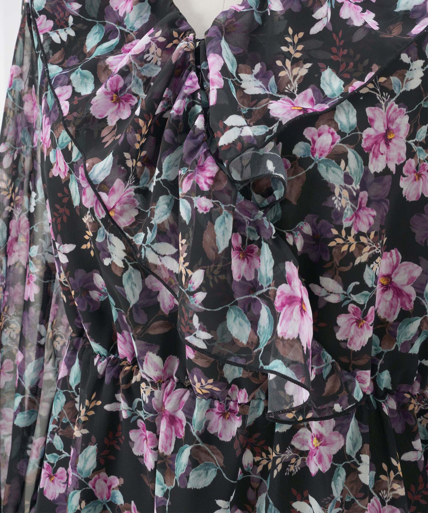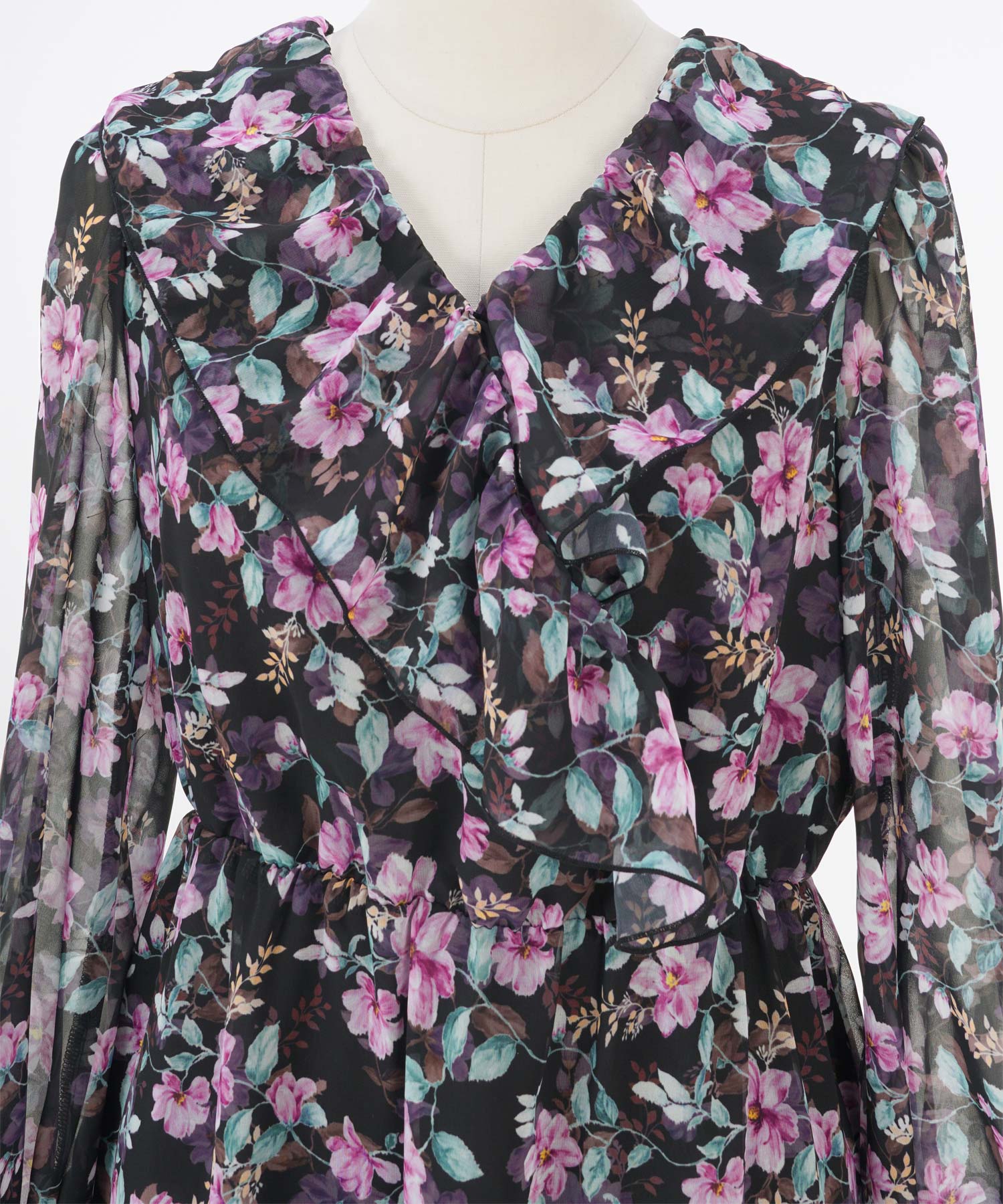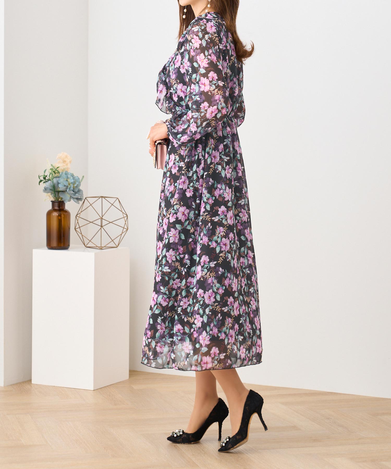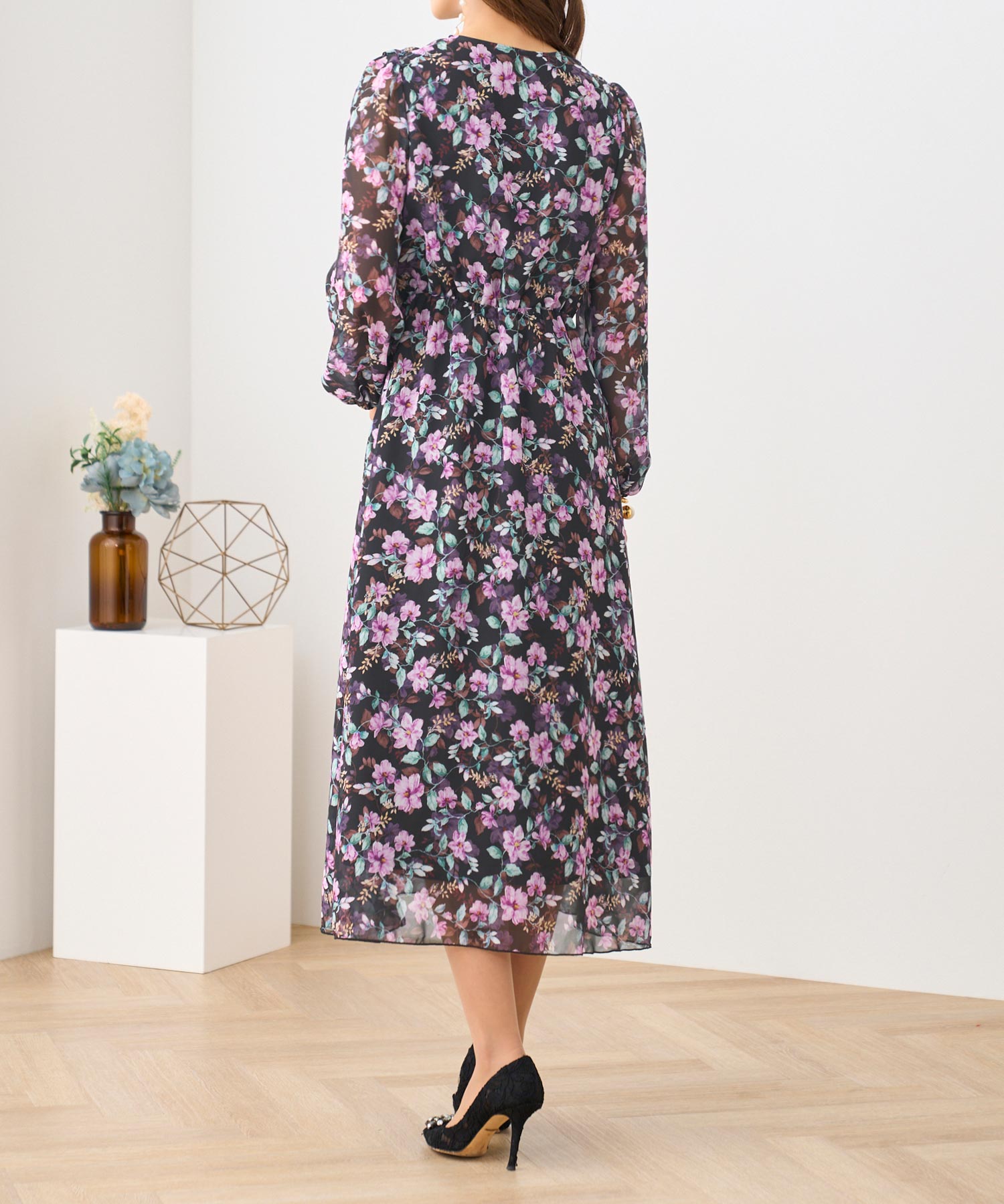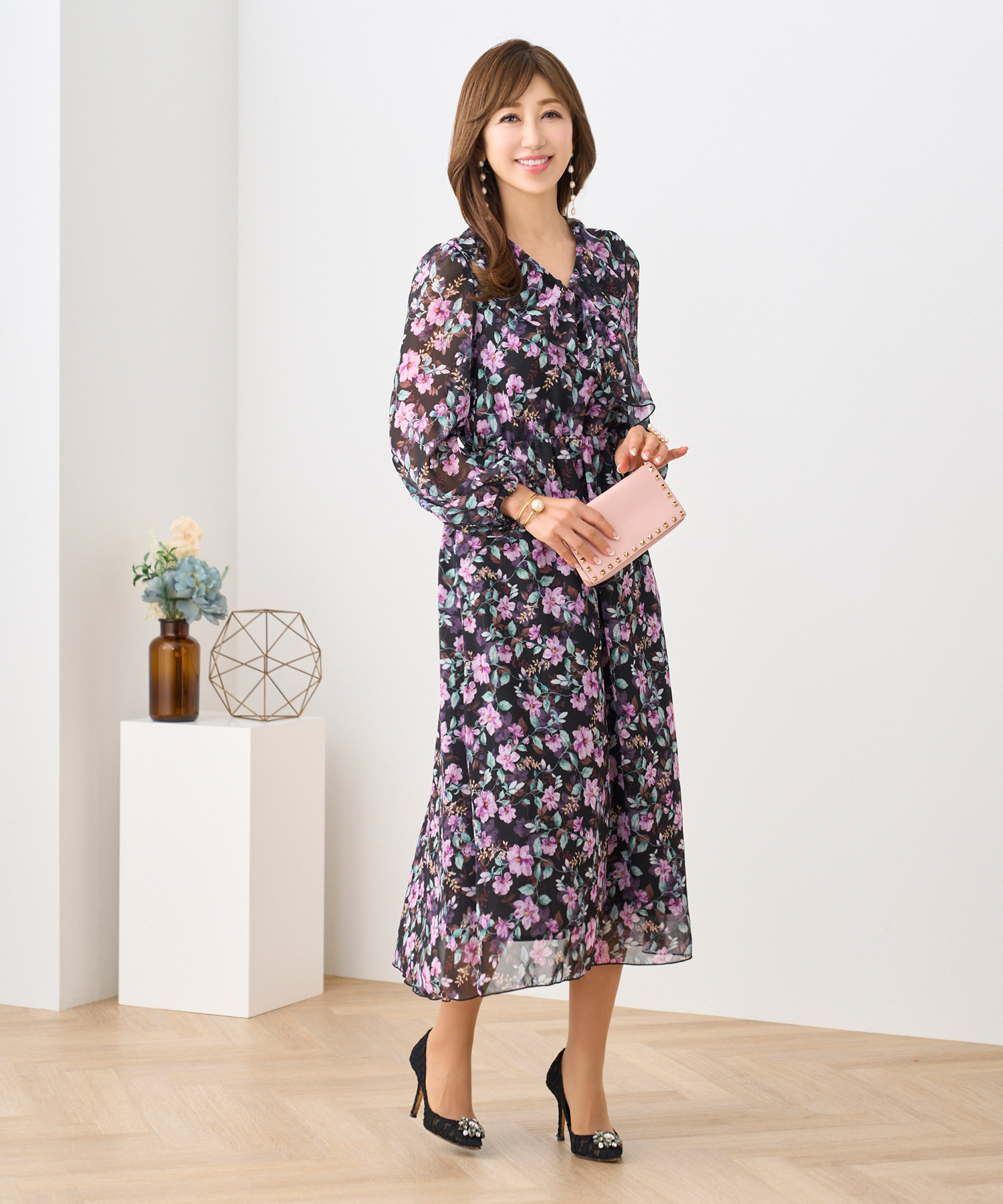 フロント部分に大きくあしらったフリルカシュクールにより胸元や顔周りの華やぎがアップ。アクセサリーが無くても十分着映えてくれます。ウエストの切り替えは通常の位置よりも高めに設定しているのでスタイルアップにもひと役。無地は上品で光沢があり、プリントは透け感ある素材で軽やかで長いシーズン着用いただけます。