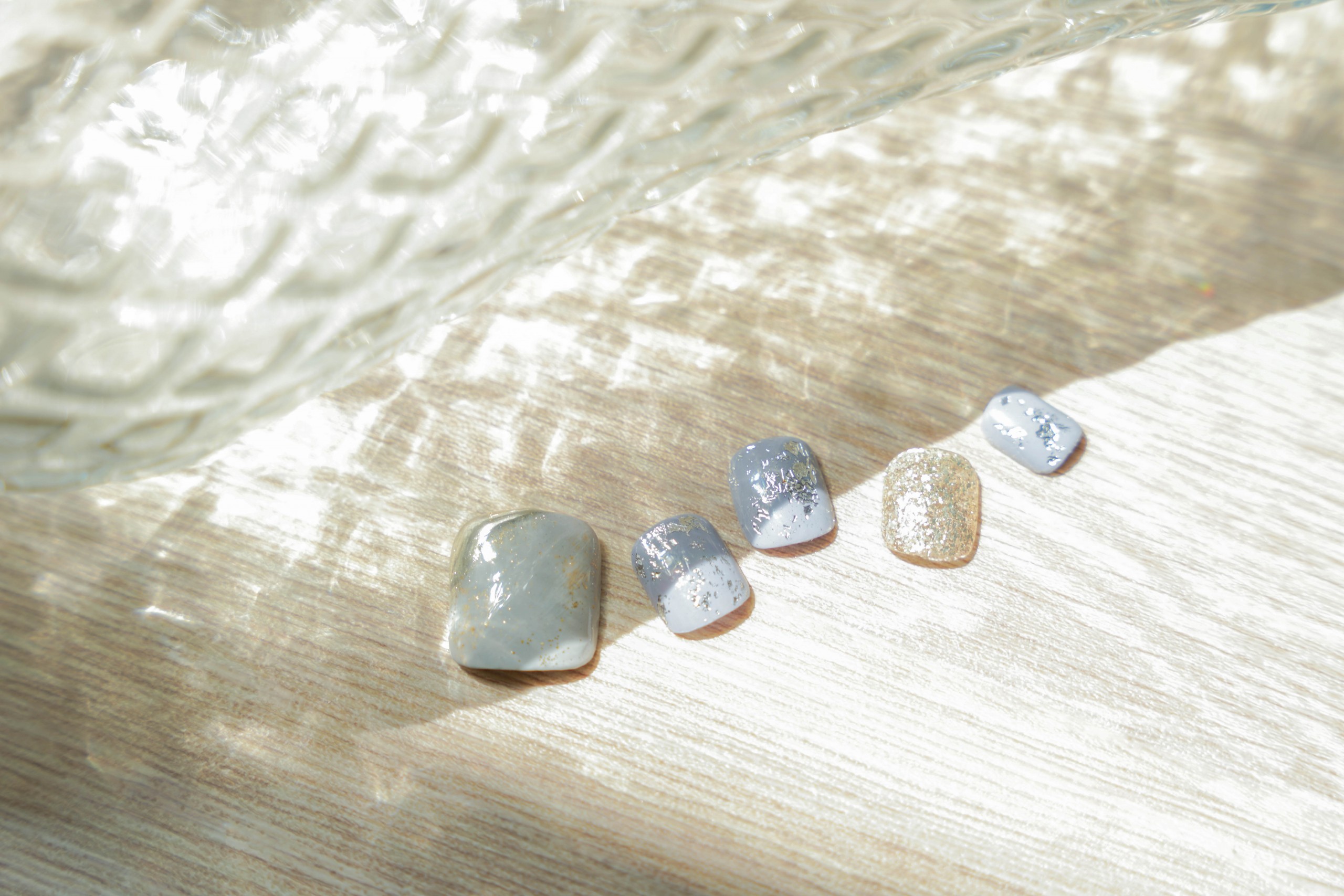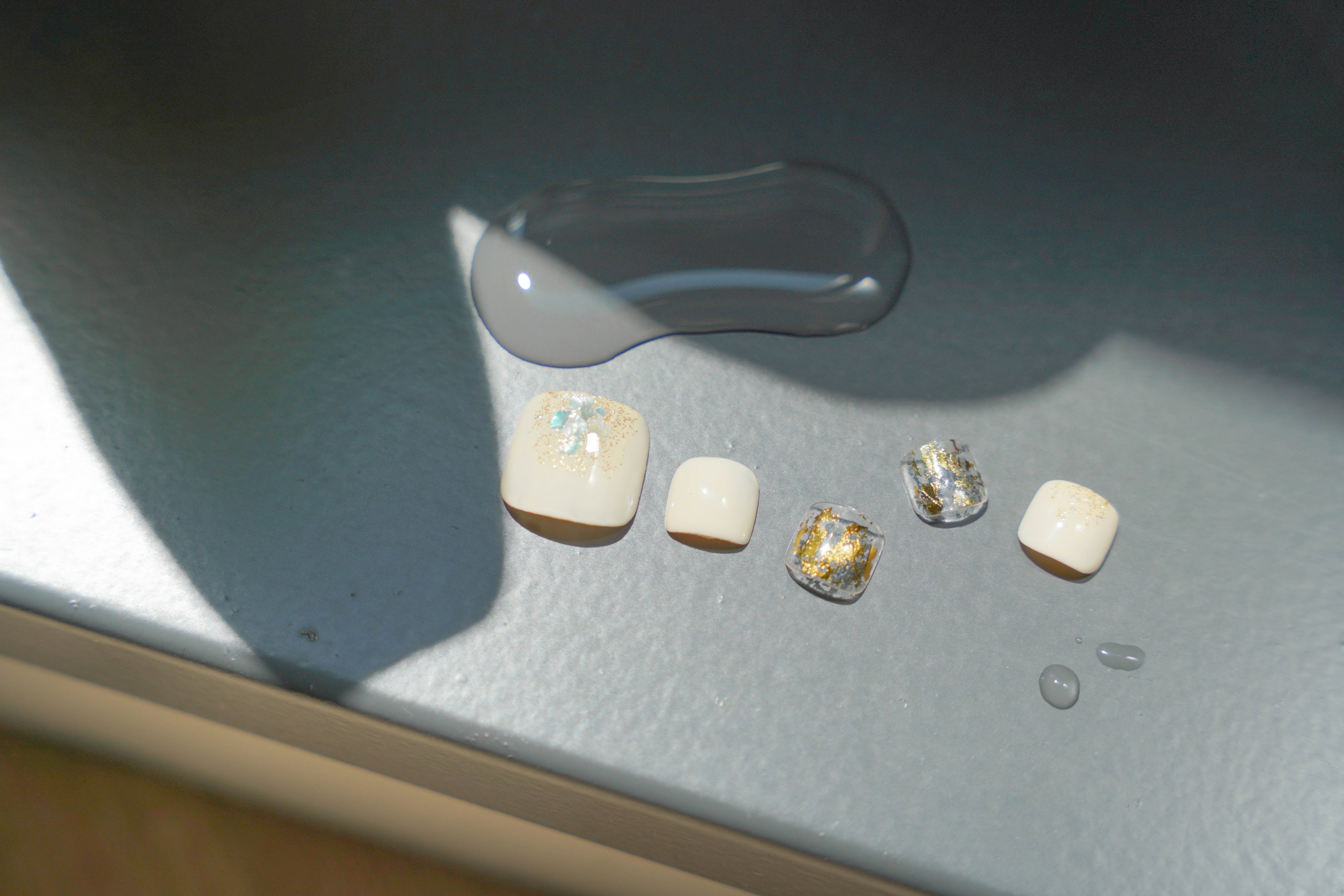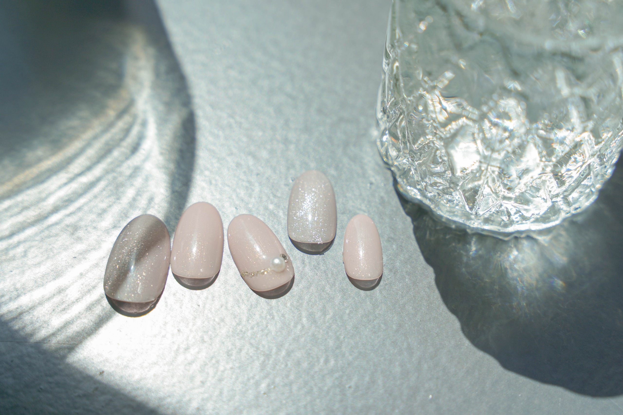 親指についたシェルとラメが夏のビーチを連想させつつも、梅雨の合間の陽に当たった水滴の輝きも感じるデザイン。