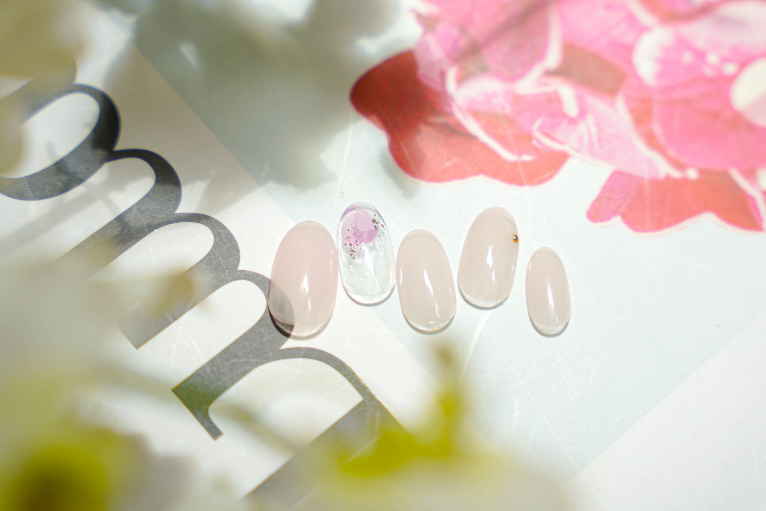 透け感のあるクリアピンクベージュに1本、クリアベースにピンクのインクをじゅわっと垂らしてポイントに。