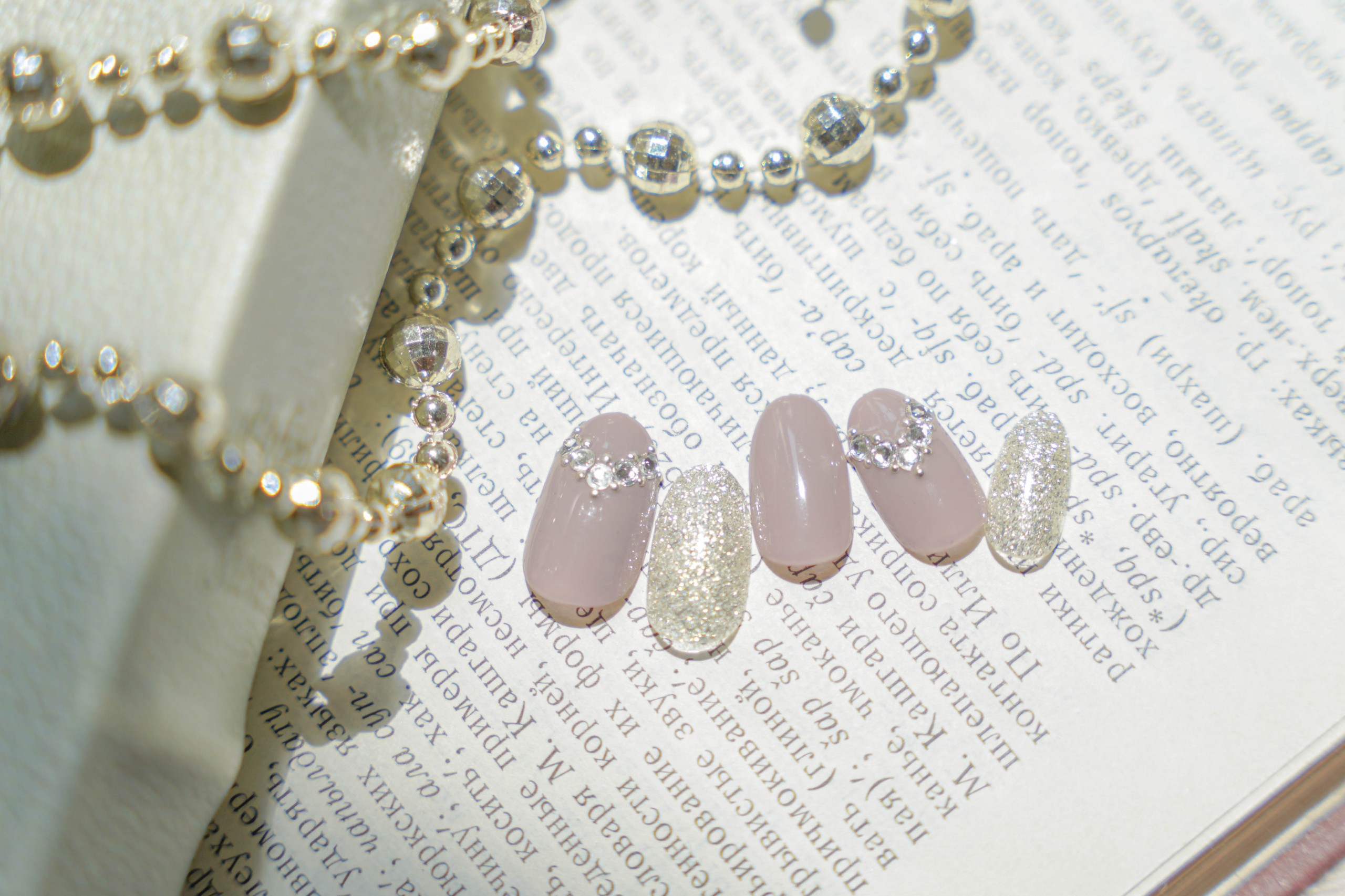グレージュとピンクベージュのラメベースの2色にまるで指輪のような薬指のデザイン。