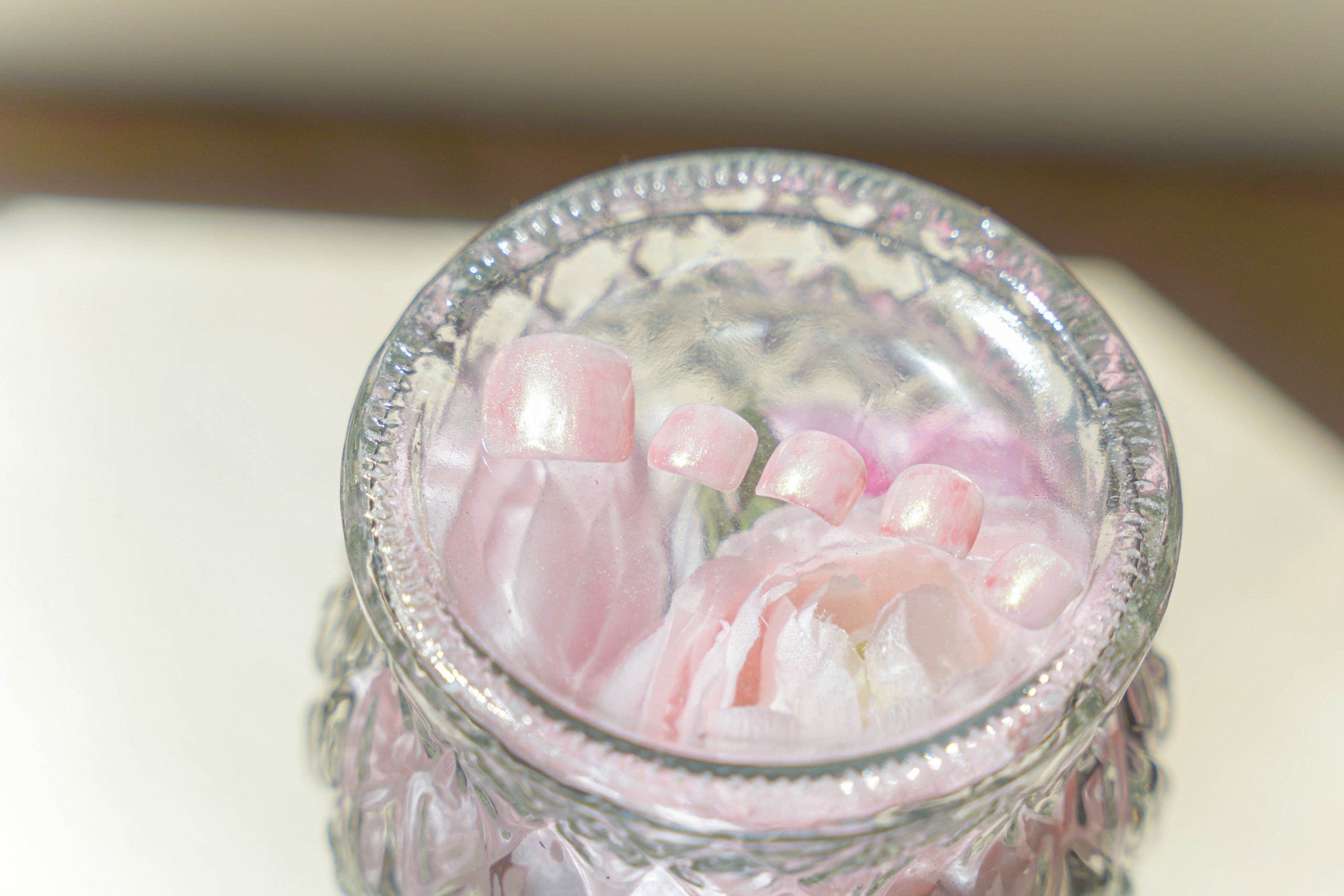 ピンクをメインに色んな色が混ざったニュアンスマーブルに、パウダーをかけて艶感をプラス。