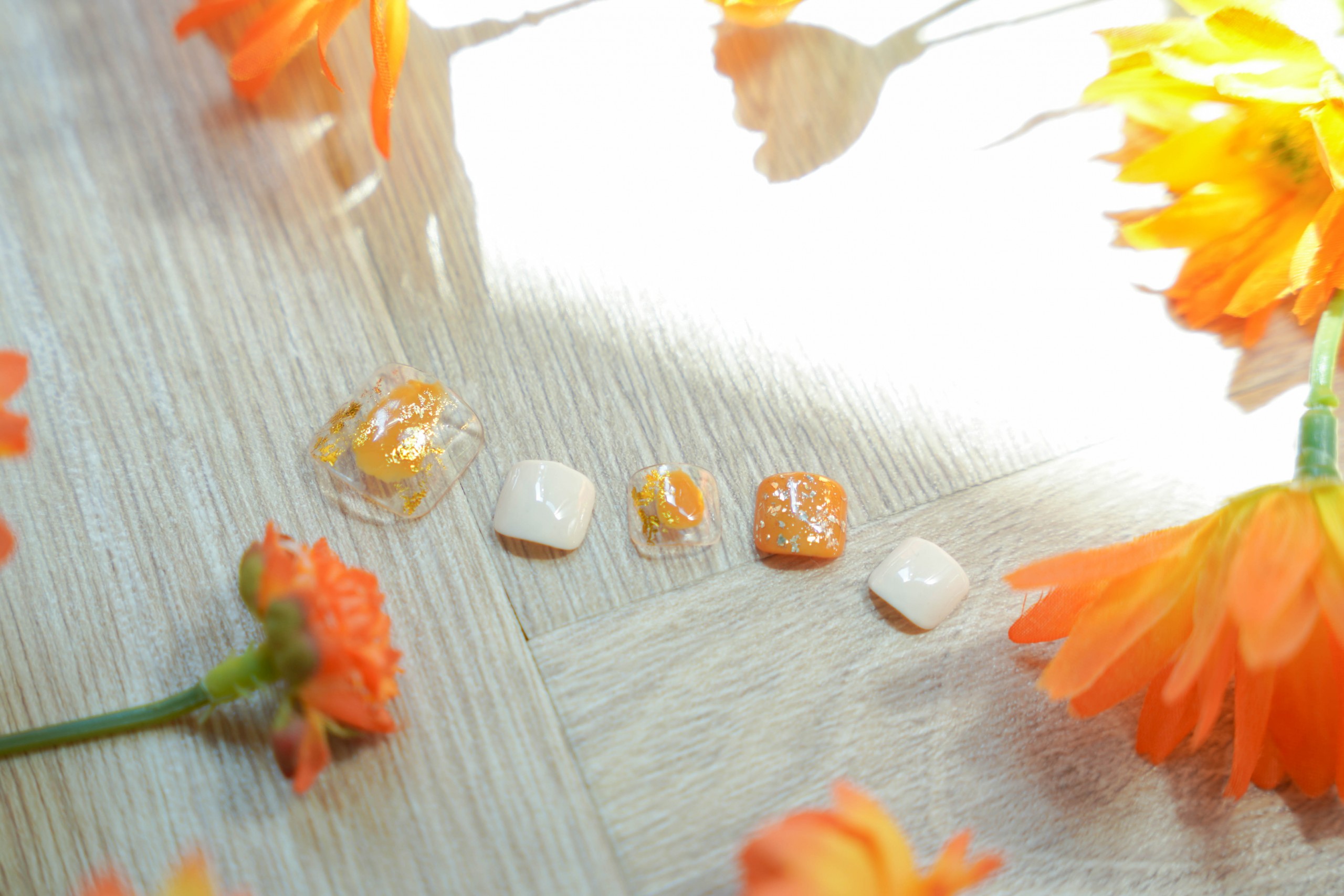 はじける太陽のようなオレンジに、キラキラと輝くゴールドやシルバーの箔がぴったり。