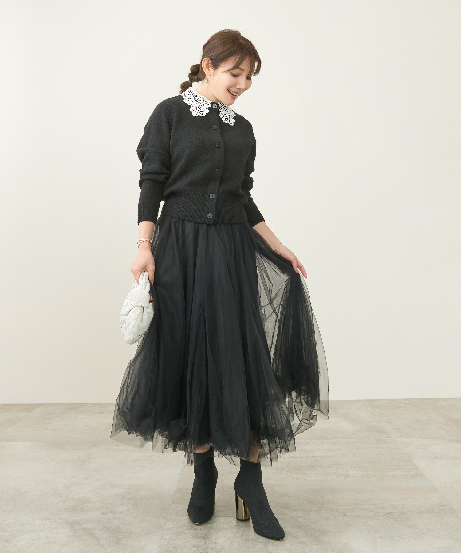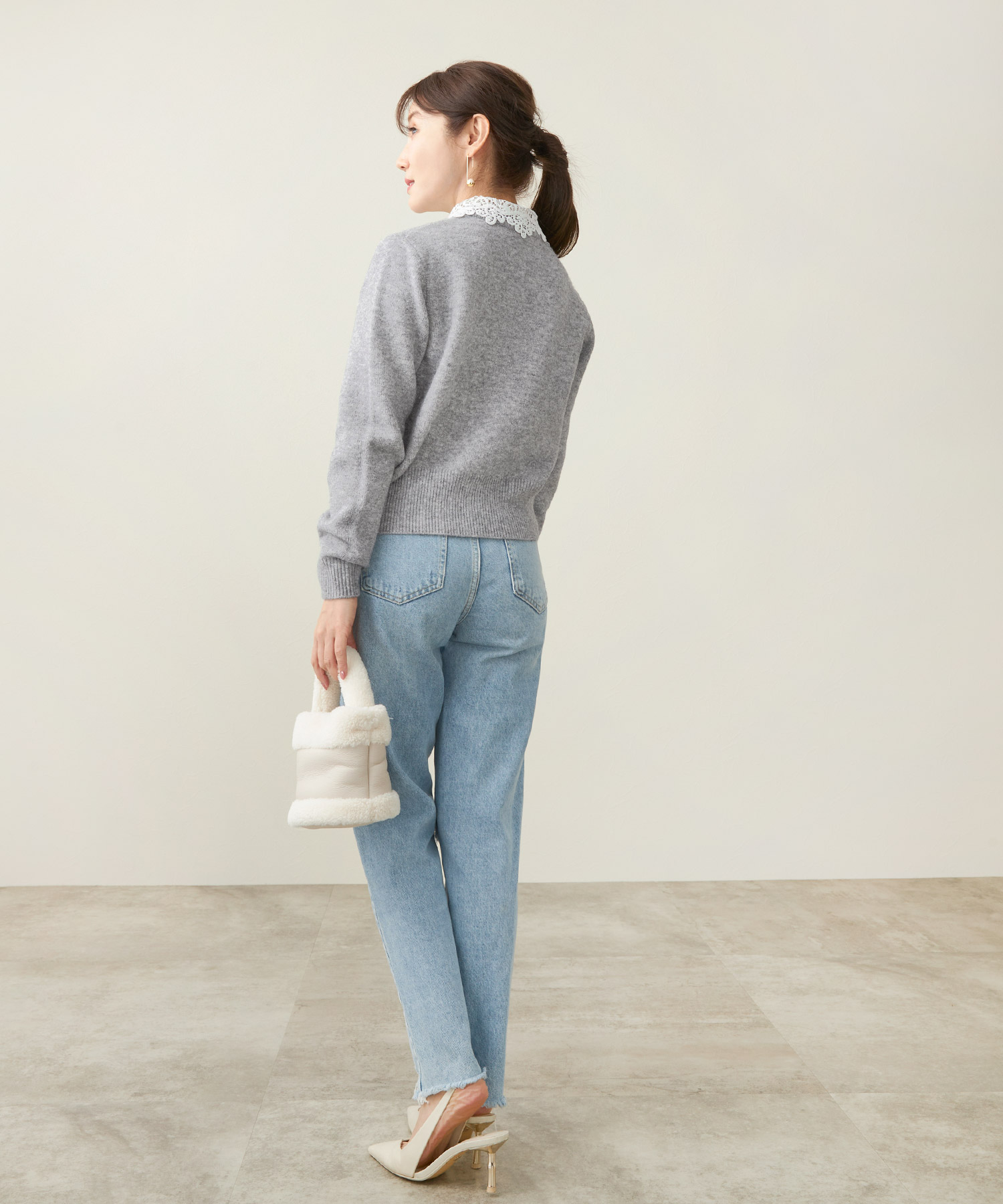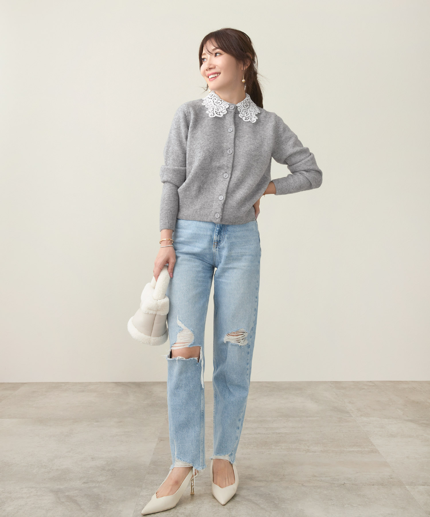 ウール混のふわりとした毛足が特徴のカーディガンは、寒さが残る春先にも最適です。取り外し可能なレース襟が華やかさを加え、女子会やレストランディナーなどの特別なシーンで、格上げされた印象を演出します。サテン地のサロペットやワンピースの上に肩掛けすると、さらにエレガントなスタイルに。デニムと合わせて甘辛ミックスを楽しむのもおすすめです。自宅で手洗い可能なため、気軽に着回しできる点も嬉しいポイント。多彩なシーンで活躍する、エレガントなカーディガンです。