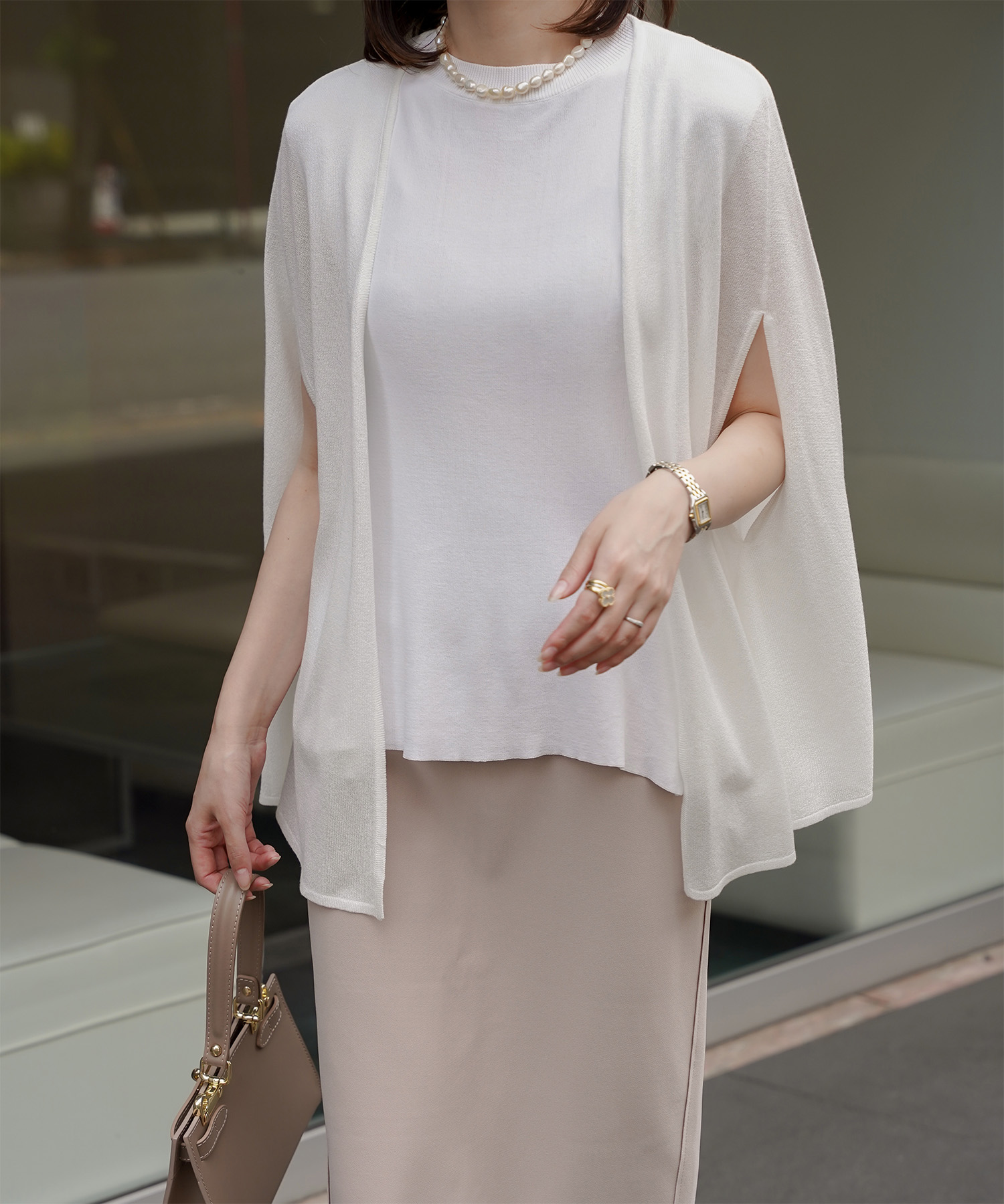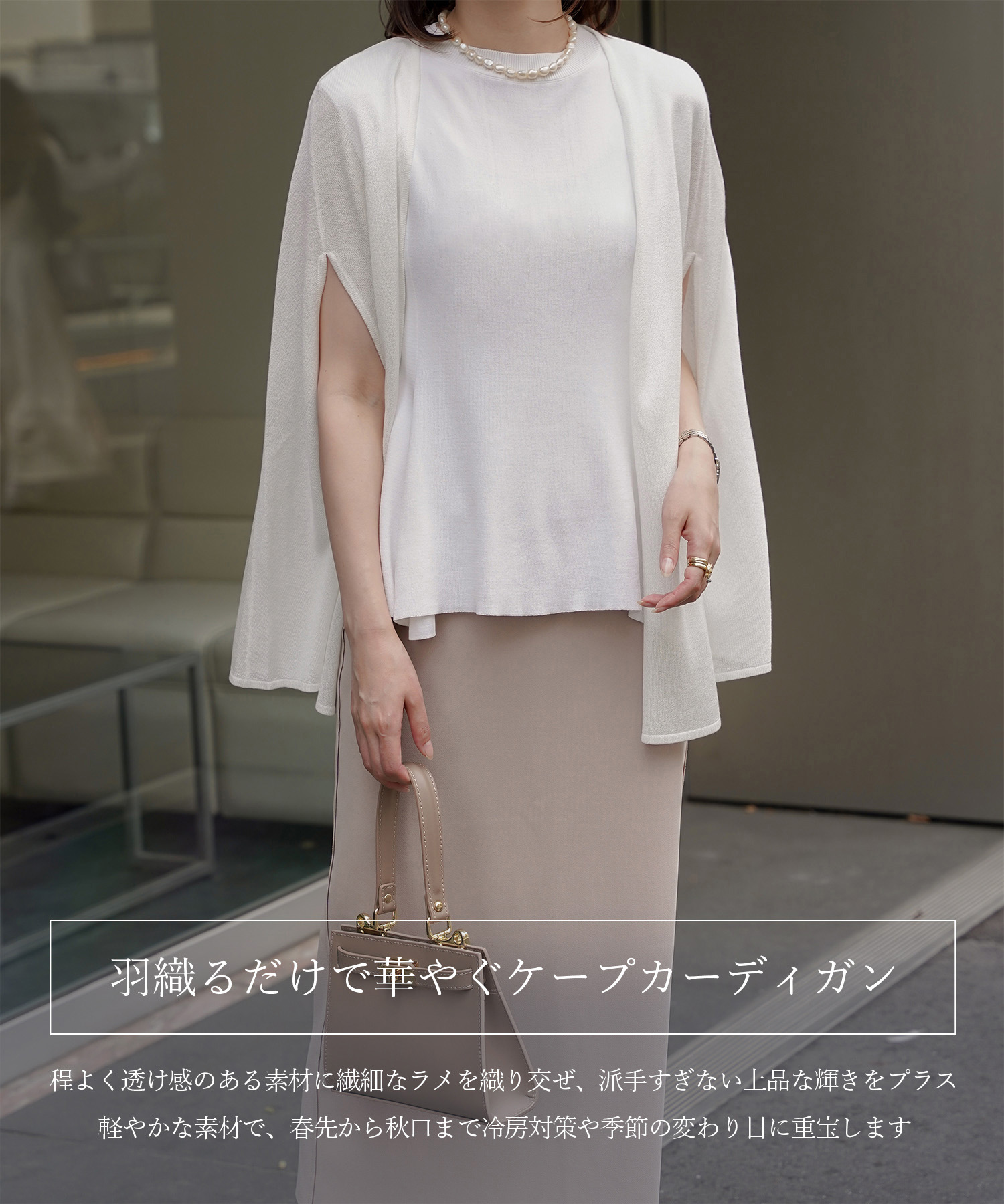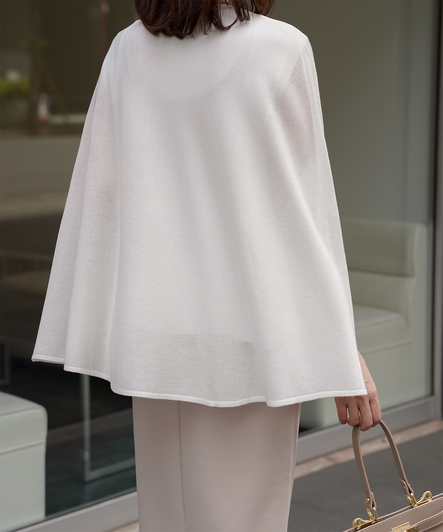 サッと羽織るだけで紫外線対策にも、冷房対策にもなるケープ型ニットカーディガン。上品なシルエットで、着るだけで女性らしい着こなしが楽しめます。タイトスカートやストレートパンツと合わせたスタイリングがおすすめ。