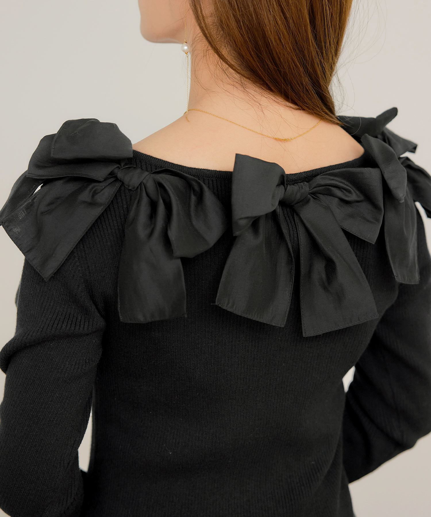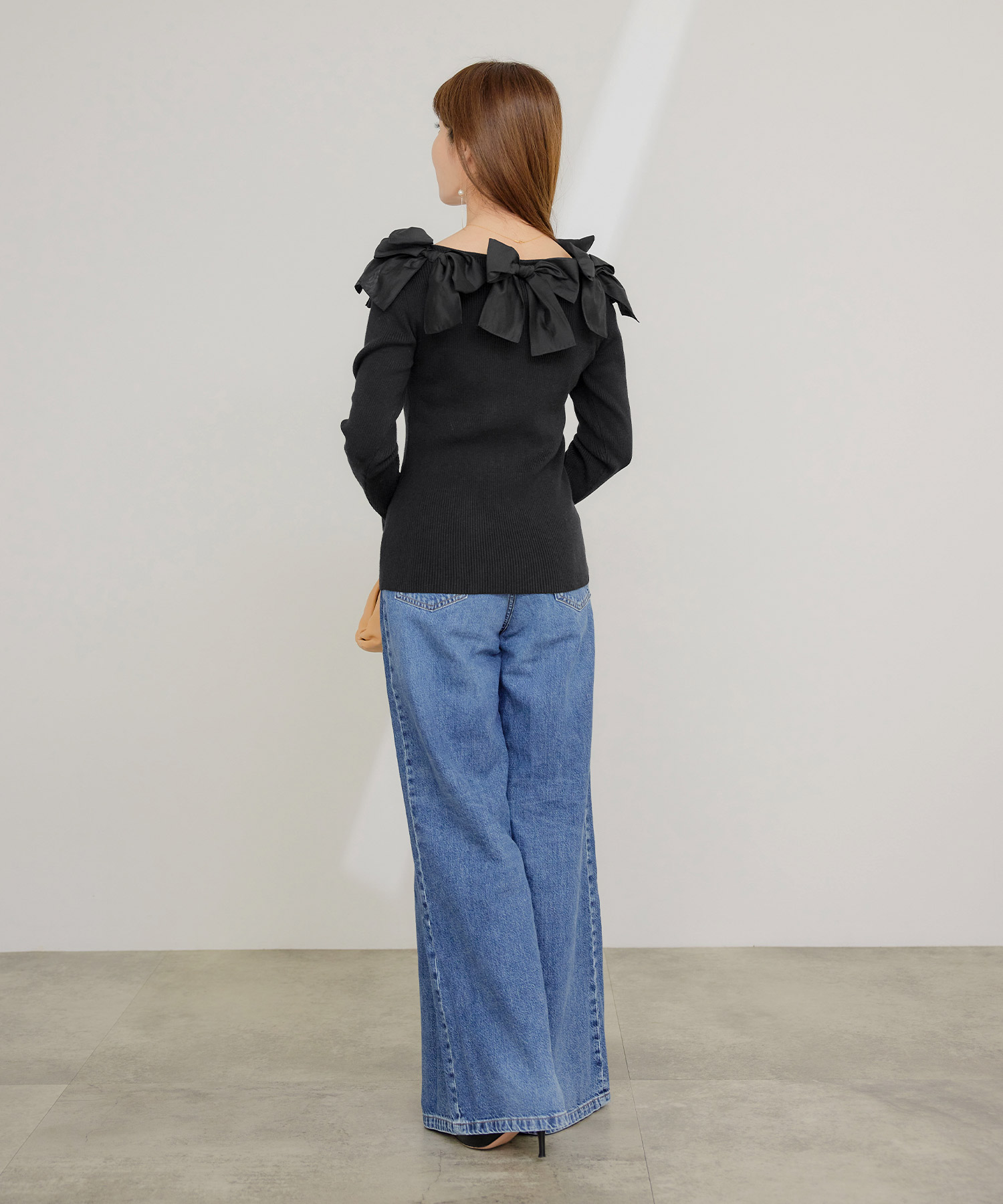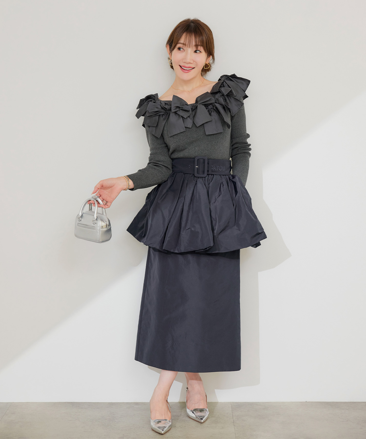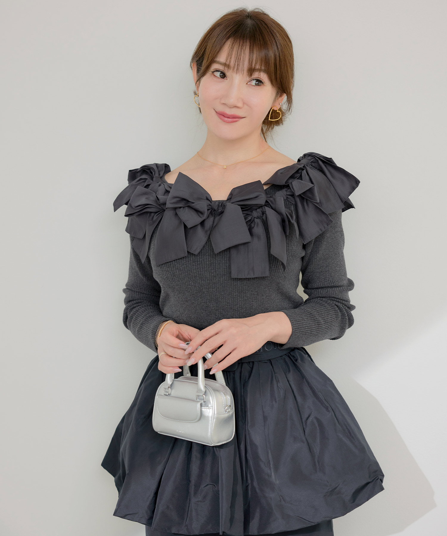 デコルテ部分をすっきりと見せてくれるワイドネックデザインで、光沢のあるリボンをあしらい、着映えするデザインです。全身モノトーンで揃えることで、甘すぎないモダンなシルエットを叶えます。