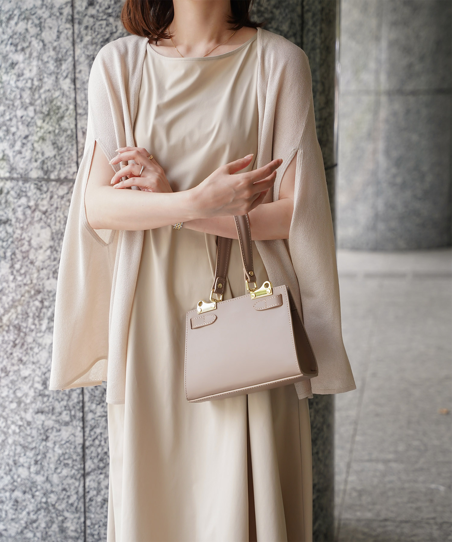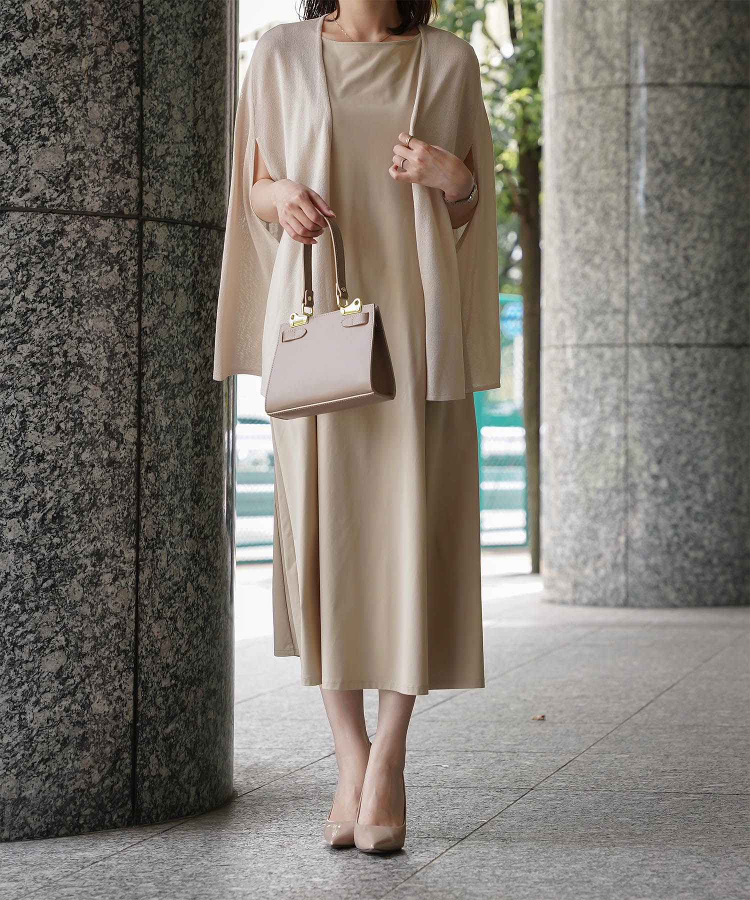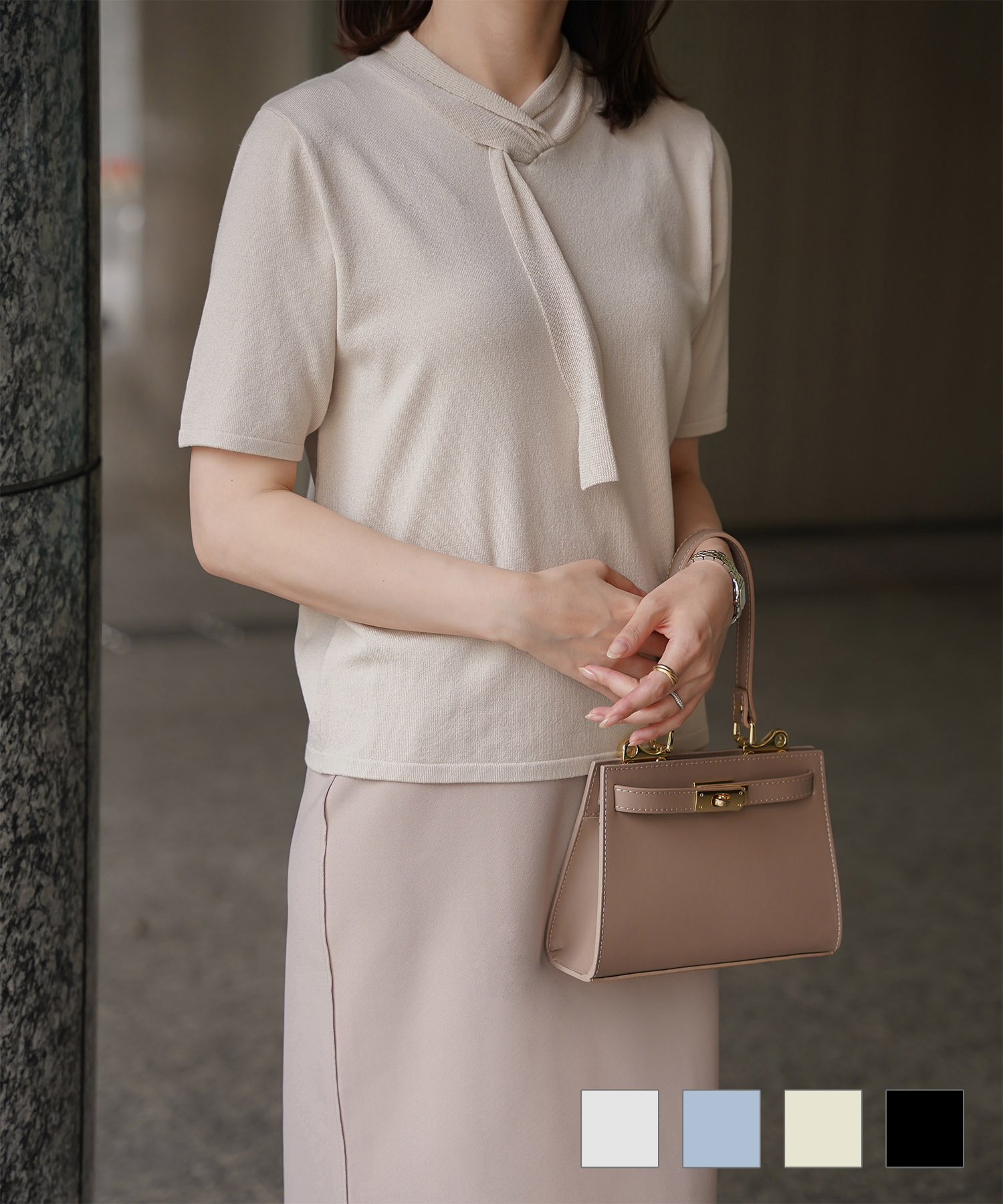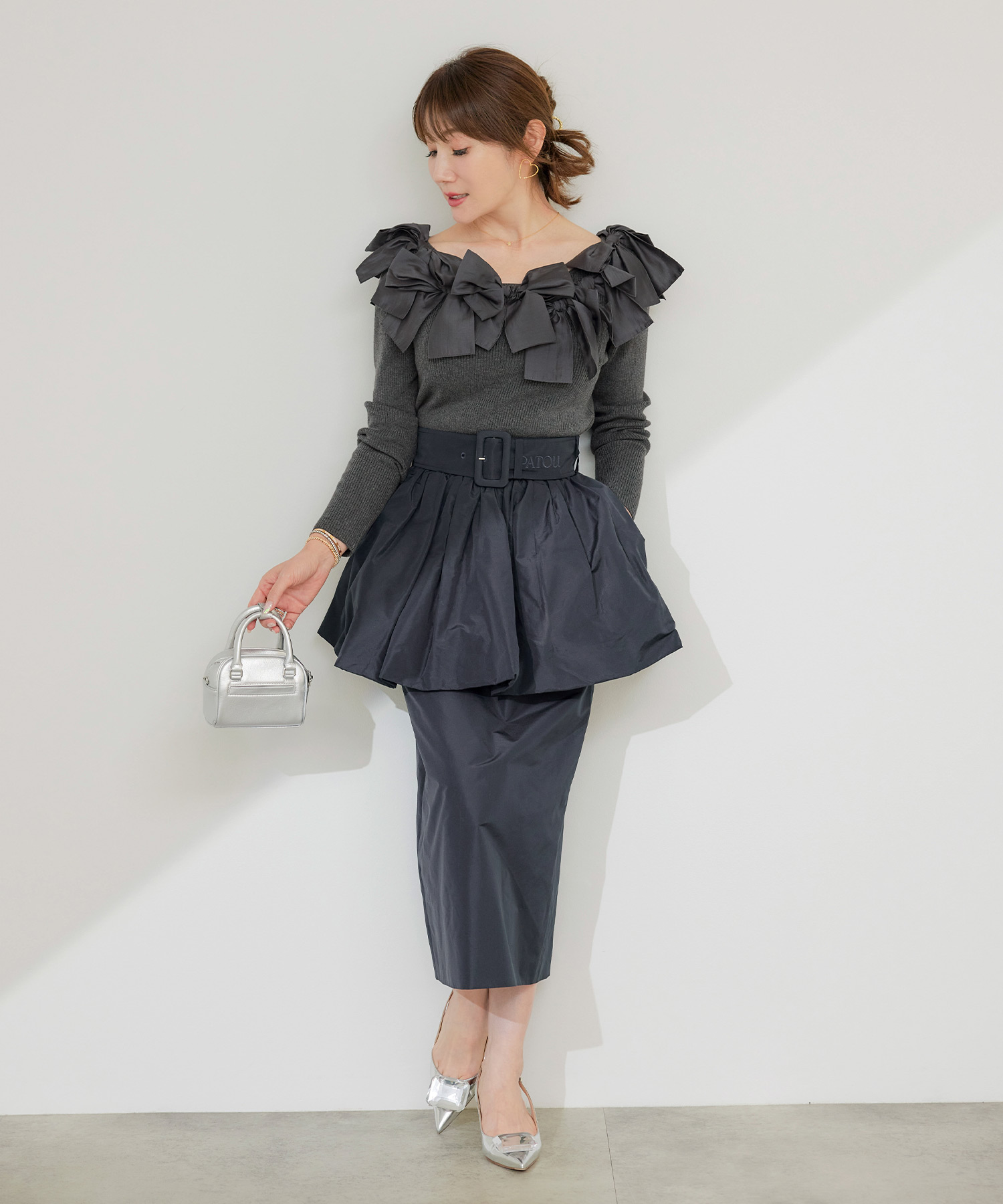 デコルテ部分をすっきりと見せてくれるワイドネックデザインで、光沢のあるリボンをあしらい、着映えするデザインです。全身モノトーンで揃えることで、甘すぎないモダンなシルエットを叶えます。