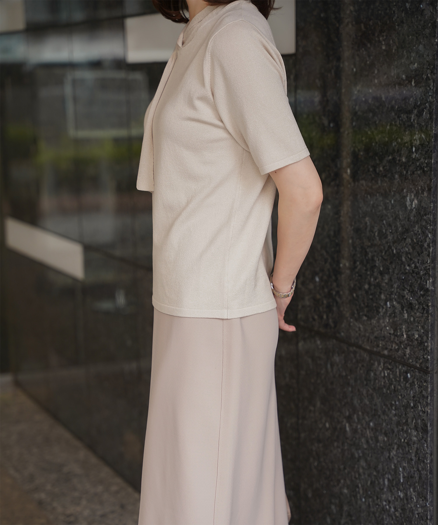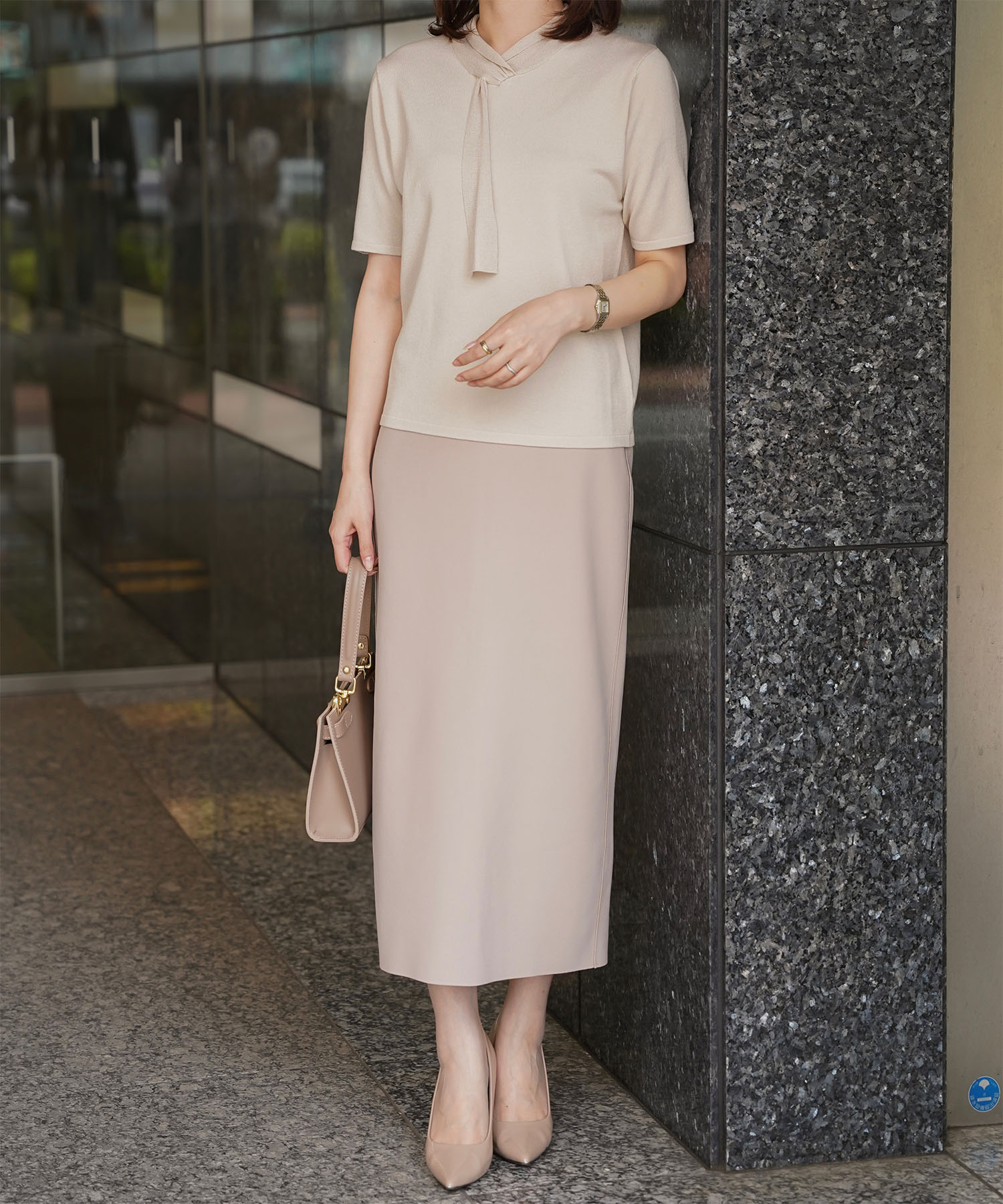 ラフになりやすい夏の装いを引き締めるボウタイトップス。ほんのりきらめくラメを織り込むことで、奥行きのある装いに。さらっとした肌触りのサマーニットで夏も快適に着用いただけます。