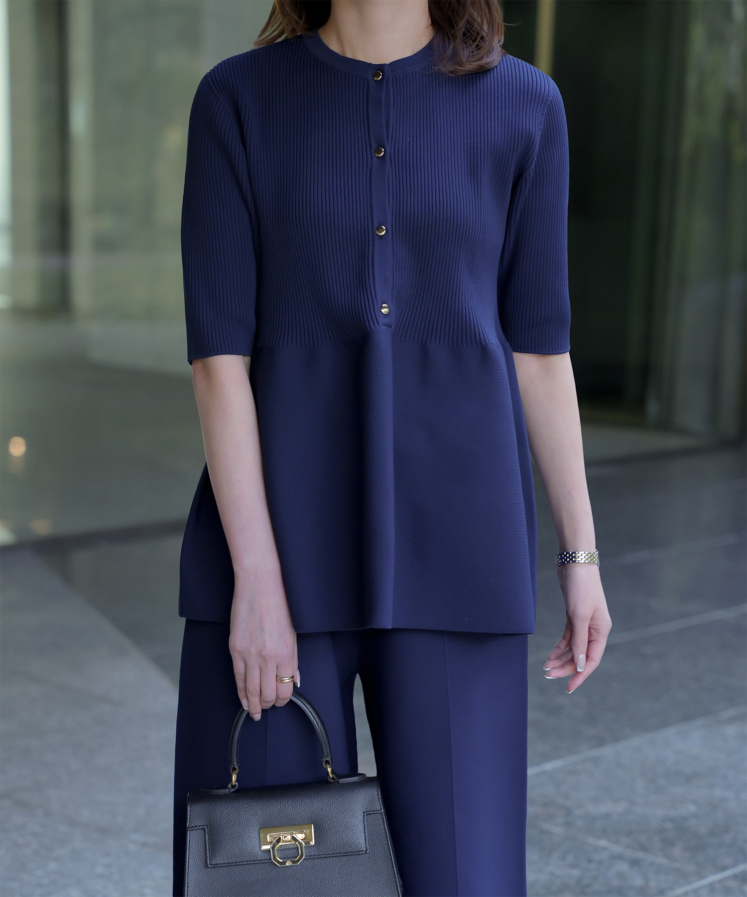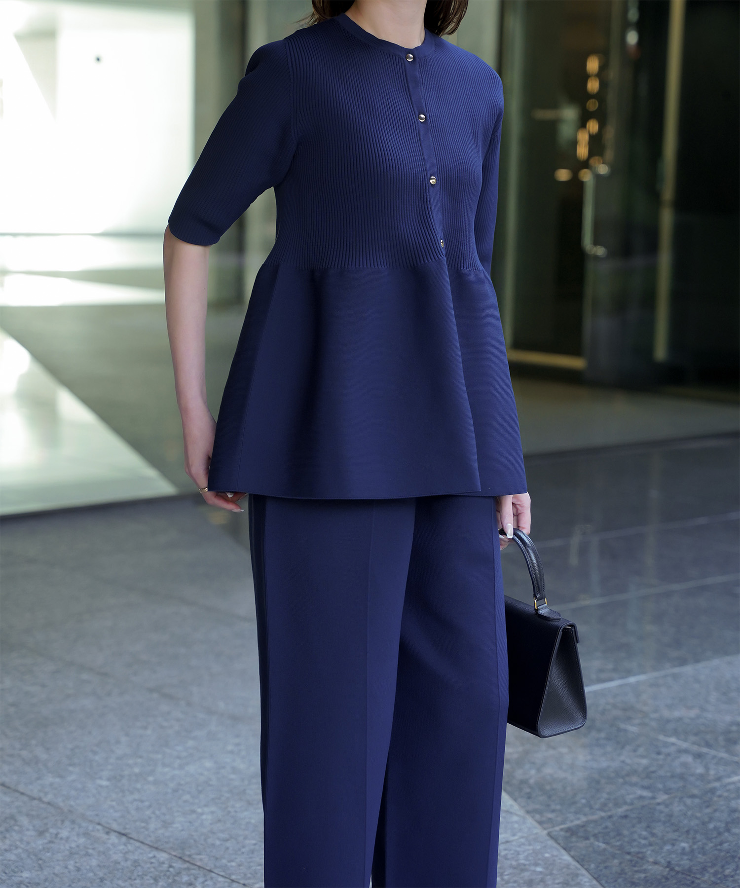 ホールガーメント(R)で編んだ立体的なシルエットが特徴のトップス。体から適度に離れたシルエットで、体のラインを拾い過ぎず、ペプラム形でスタイルアップを叶えます。
