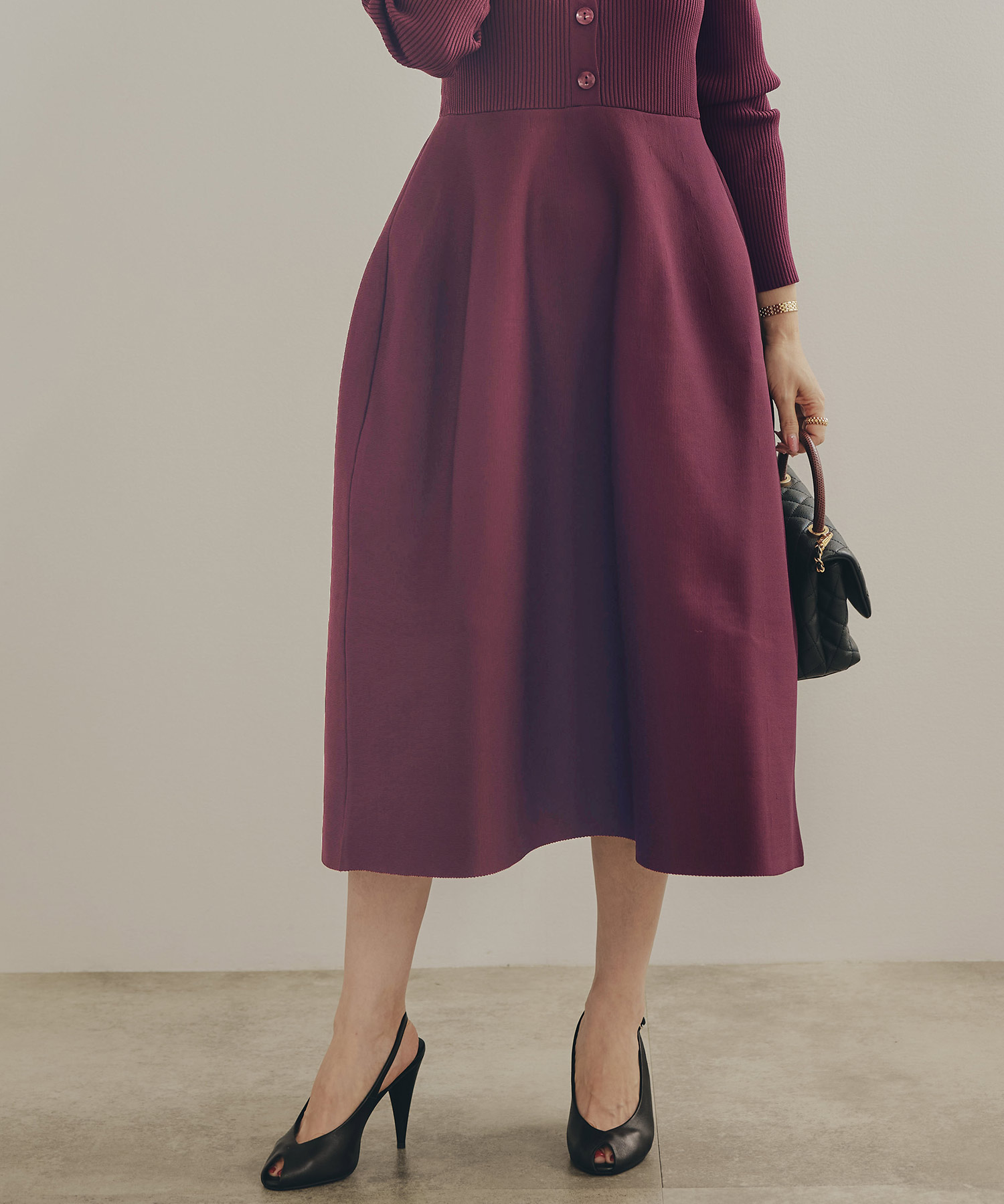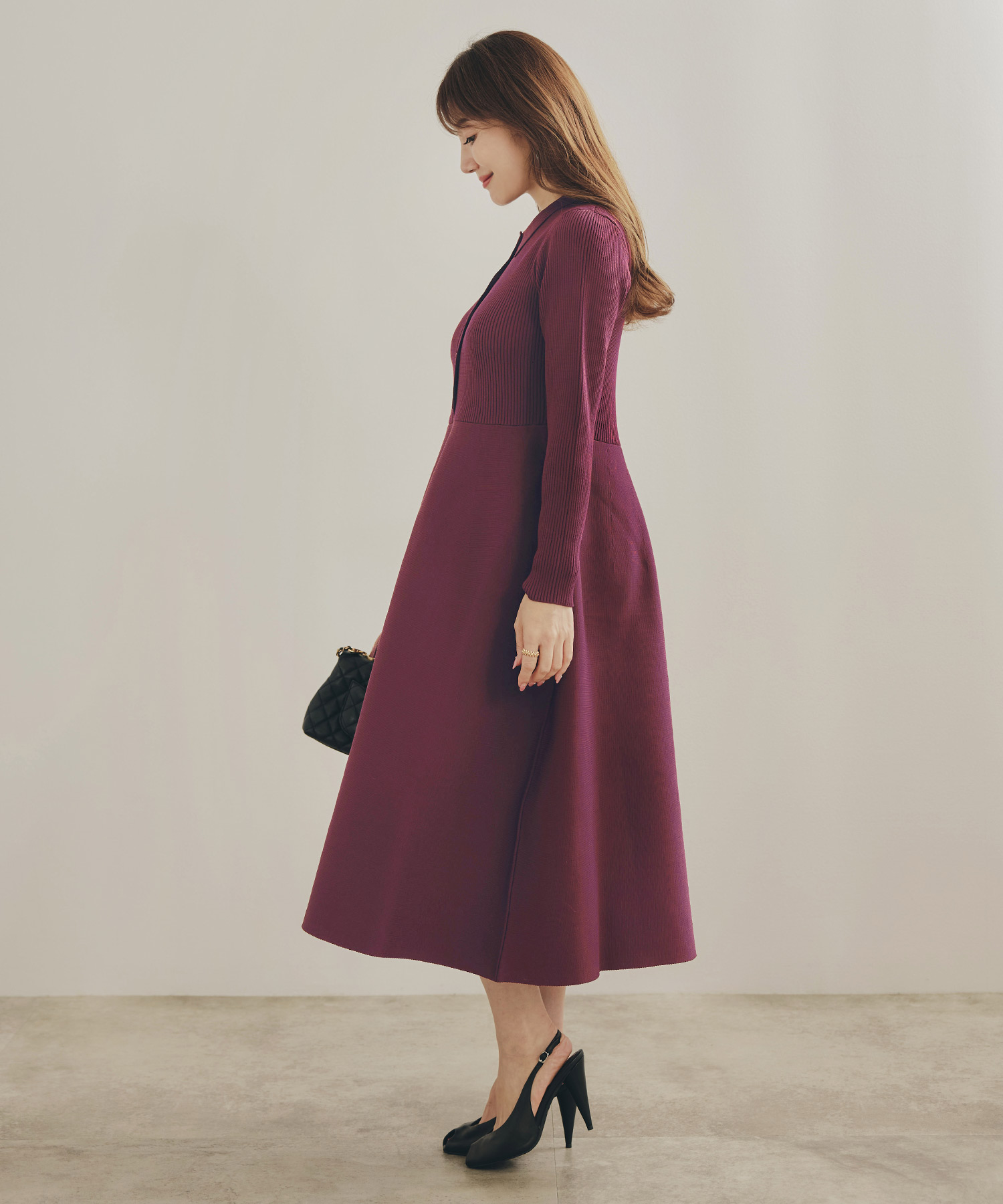 上下で編地を切り替えたこだわりのニットワンピース。伸縮性のある柔らかなニットワンピースで、着心地抜群。自宅で手洗い可能な素材なので気軽に着用できるところも高ポイントです。フロント開きなので着脱のしやすさも◎。