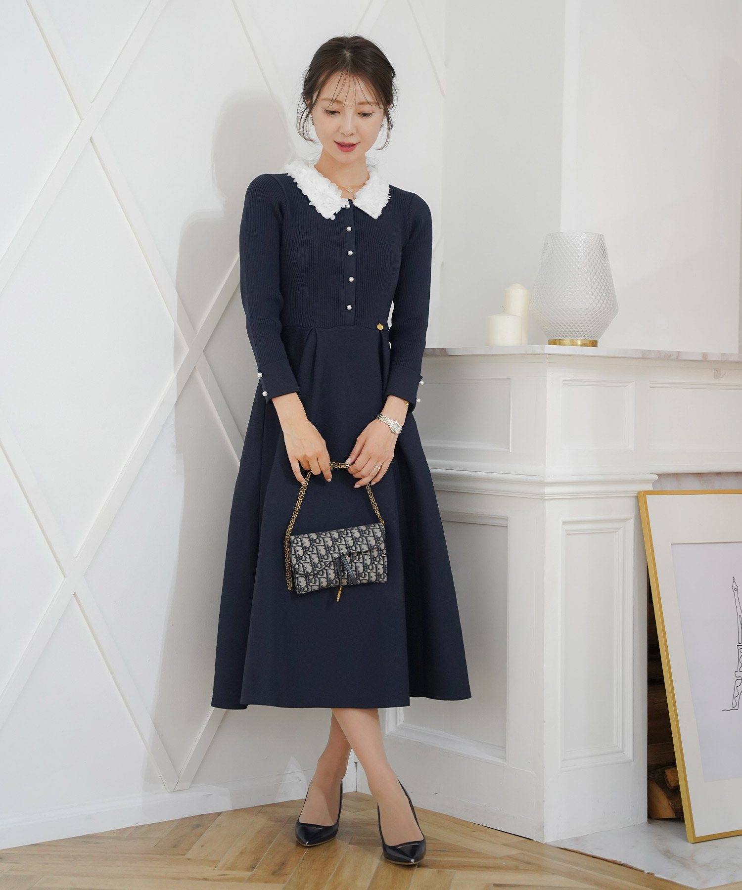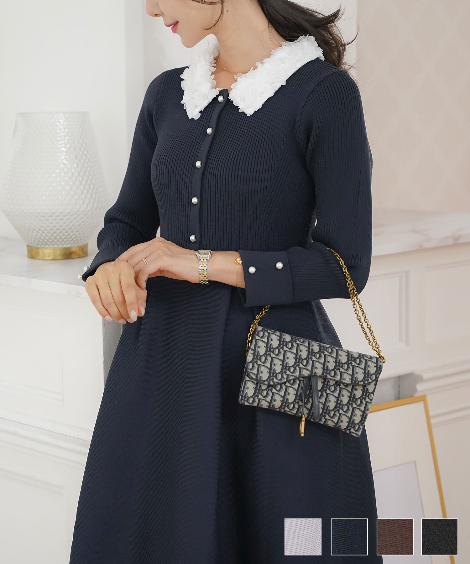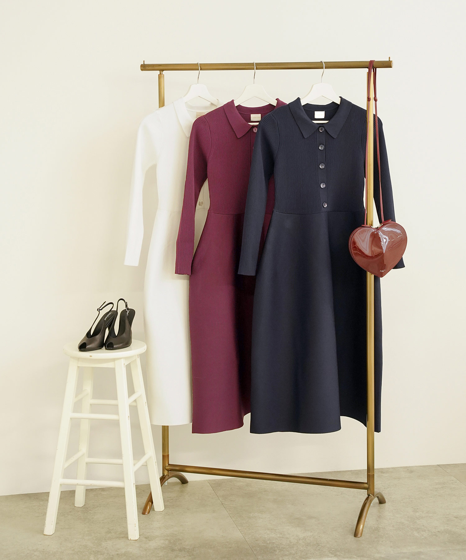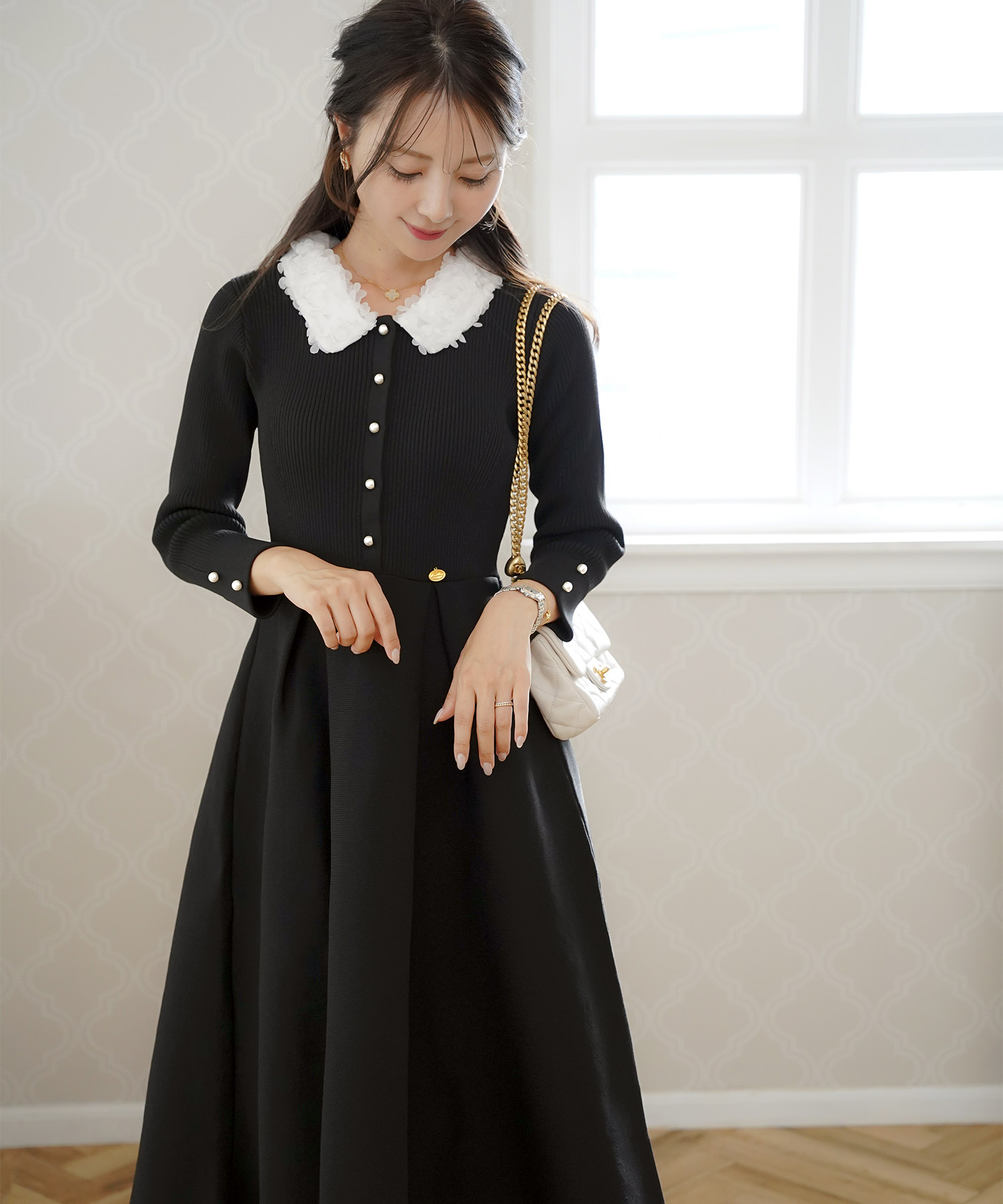 お出かけや華やかなシーンに着用したい、花のモチーフを襟にあしらった、スペシャルなワンピース。アクセサリーいらずで着るだけで華やかさがアップします。ニットはリブ仕様になっているので、程よく体のラインに沿いつつ、フィットアンドフレアでスタイルアップが可能です。