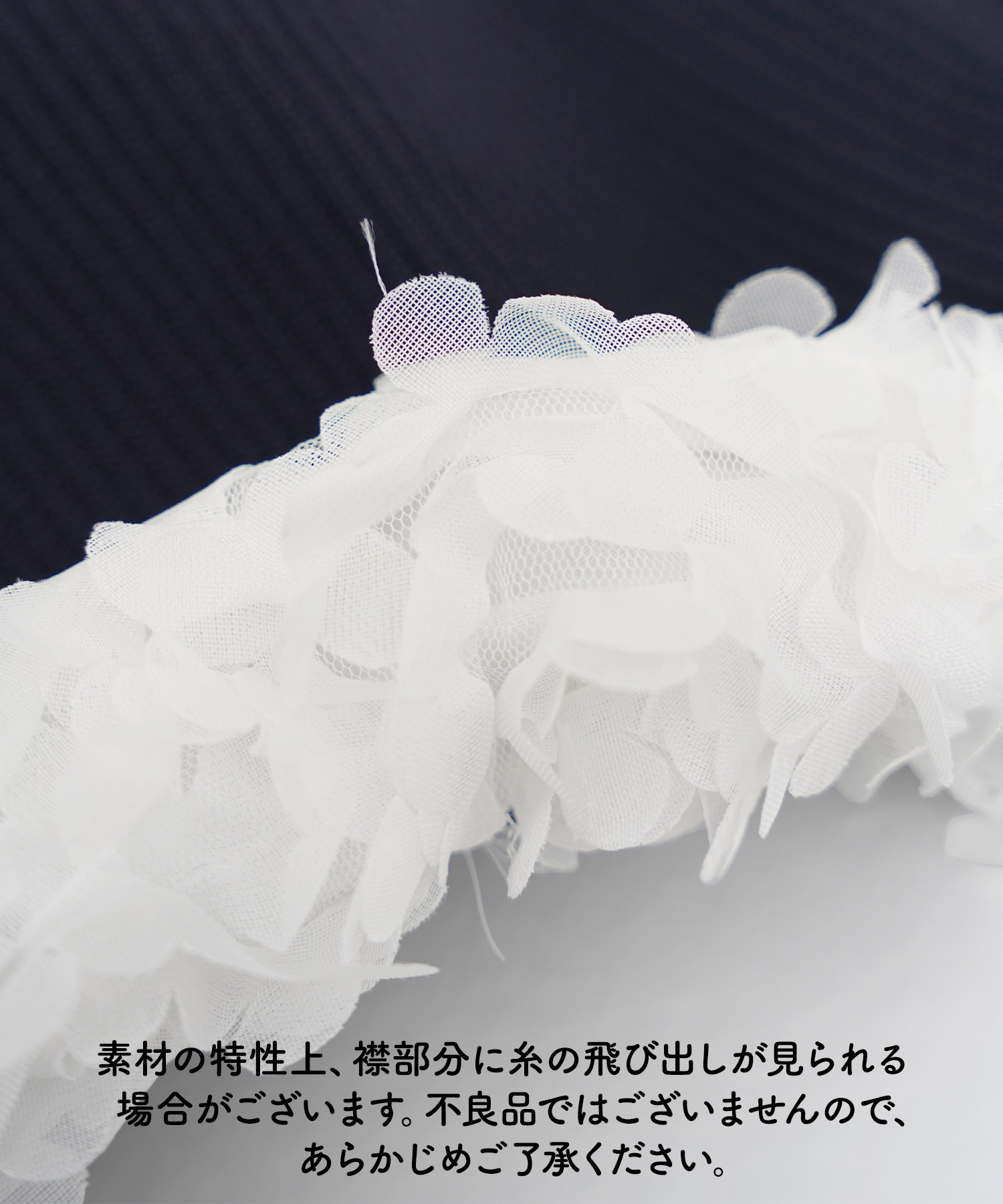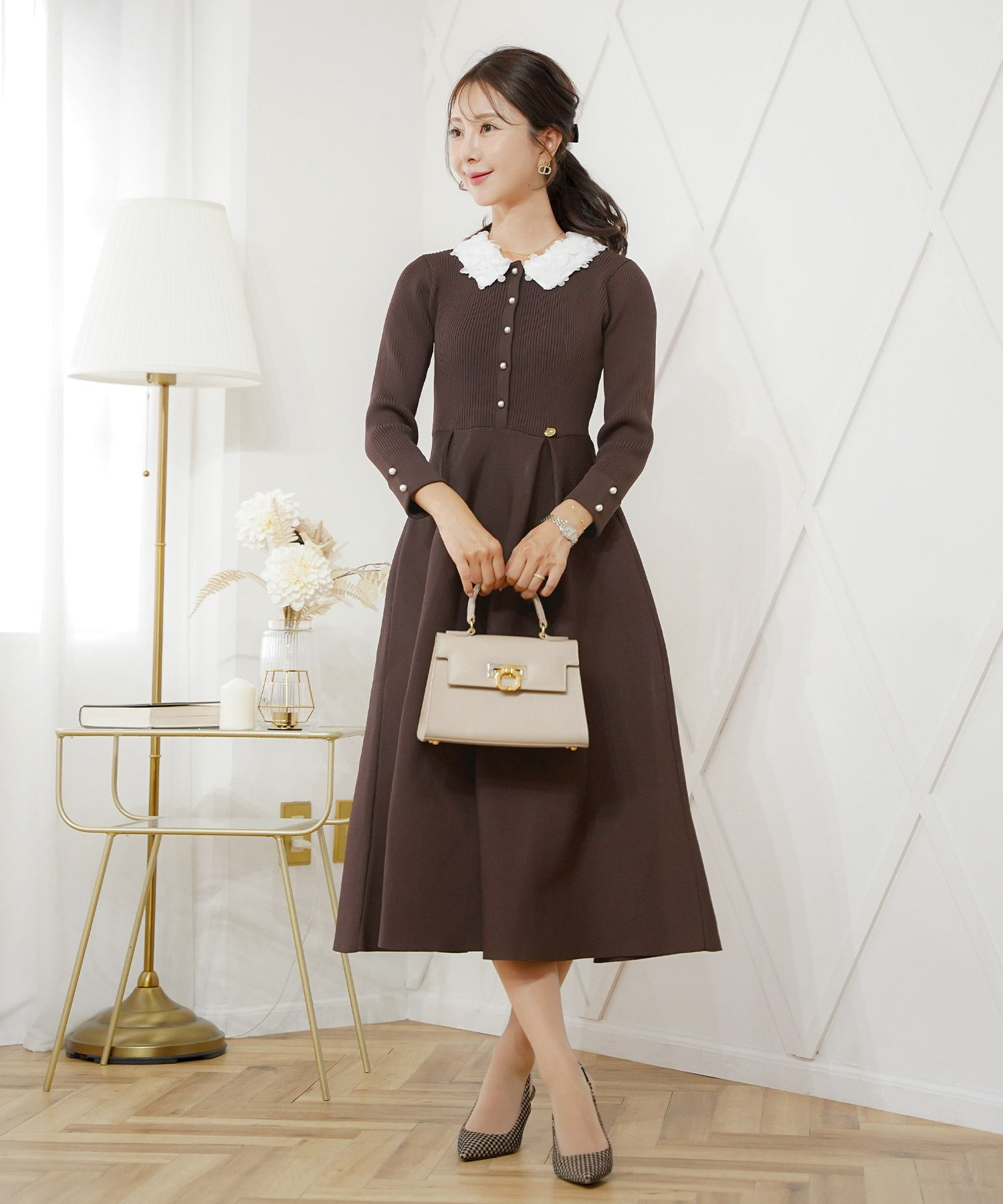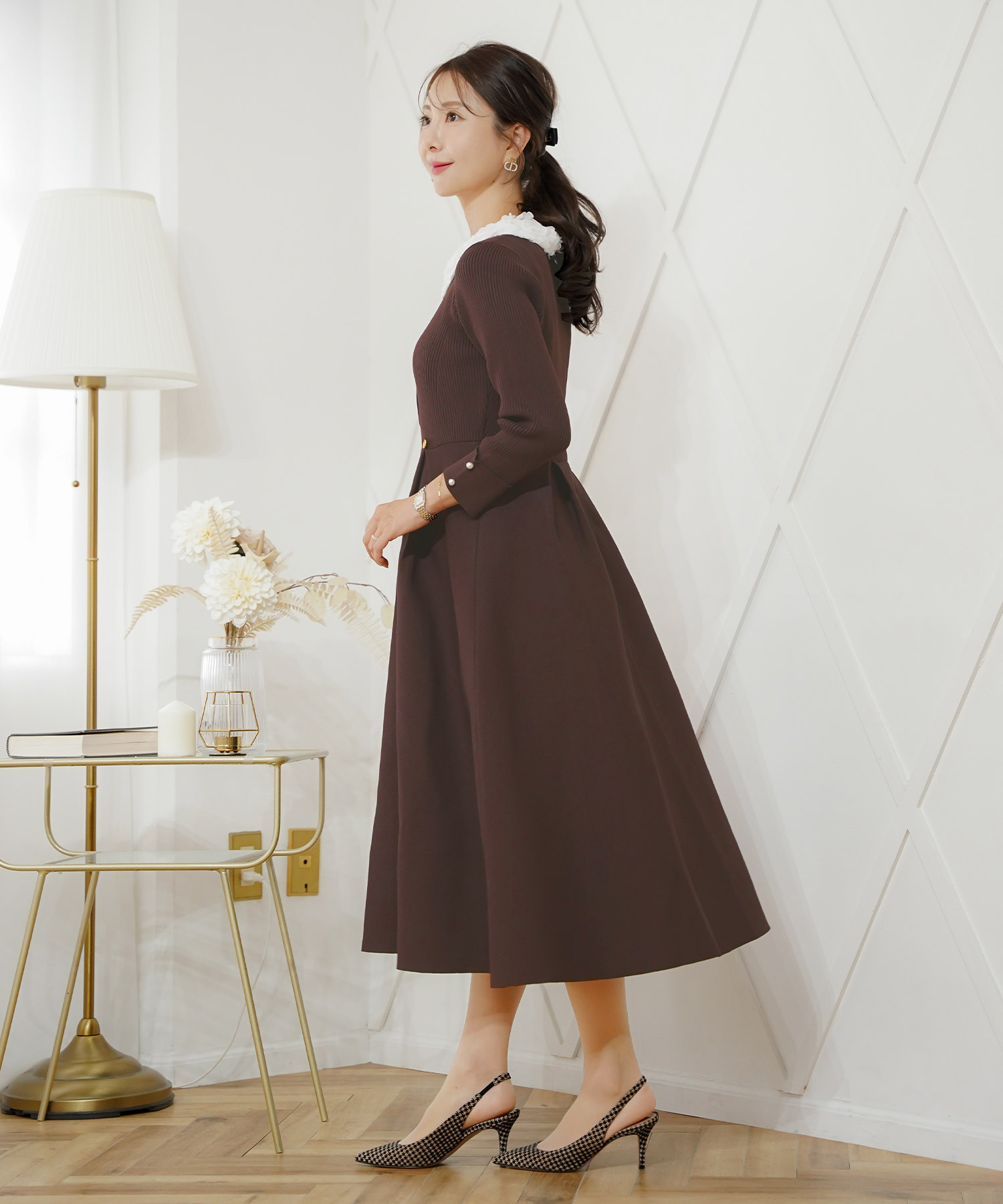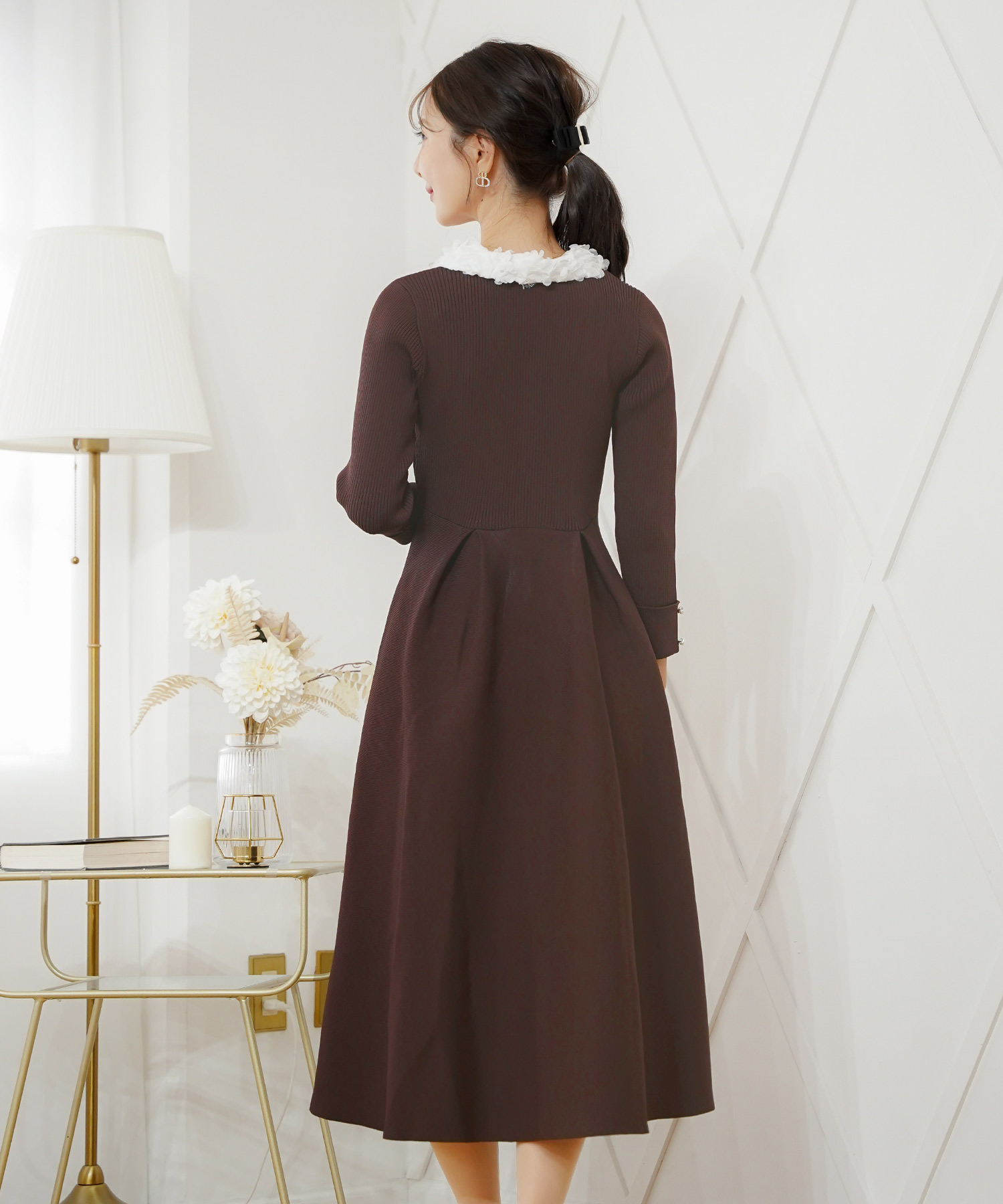 お出かけや華やかなシーンに着用したい、花のモチーフを襟にあしらった、スペシャルなワンピース。アクセサリーいらずで着るだけで華やかさがアップします。ニットはリブ仕様になっているので、程よく体のラインに沿いつつ、フィットアンドフレアでスタイルアップが可能です。