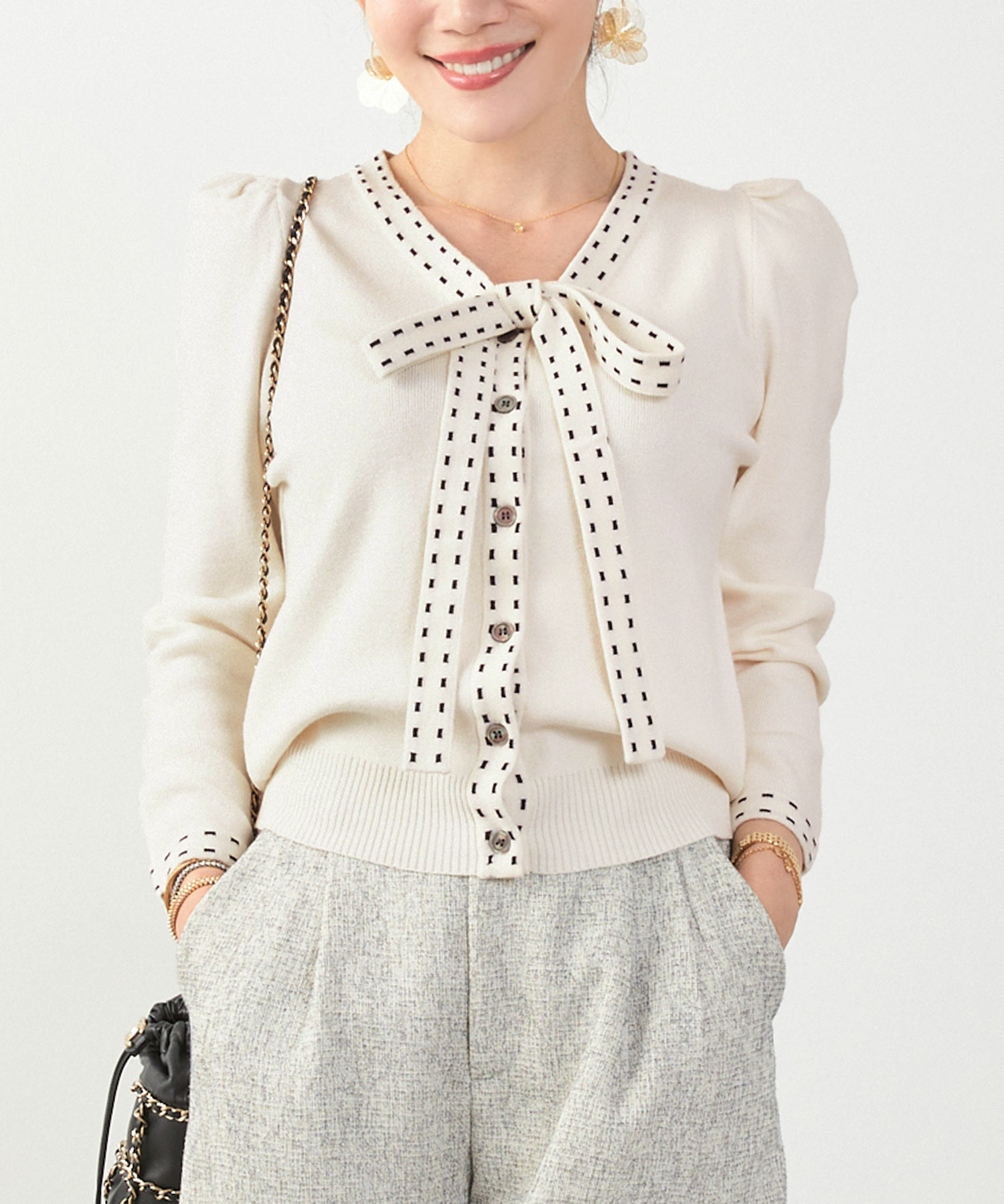 ステッチ柄がポイントのボウタイニットカーディガン。1枚でパッと華やぐデザインで、シンプルな装いのアクセントにぴったりです。首元はVネック形で詰まり過ぎず、顔をすっきり見せてくれます。