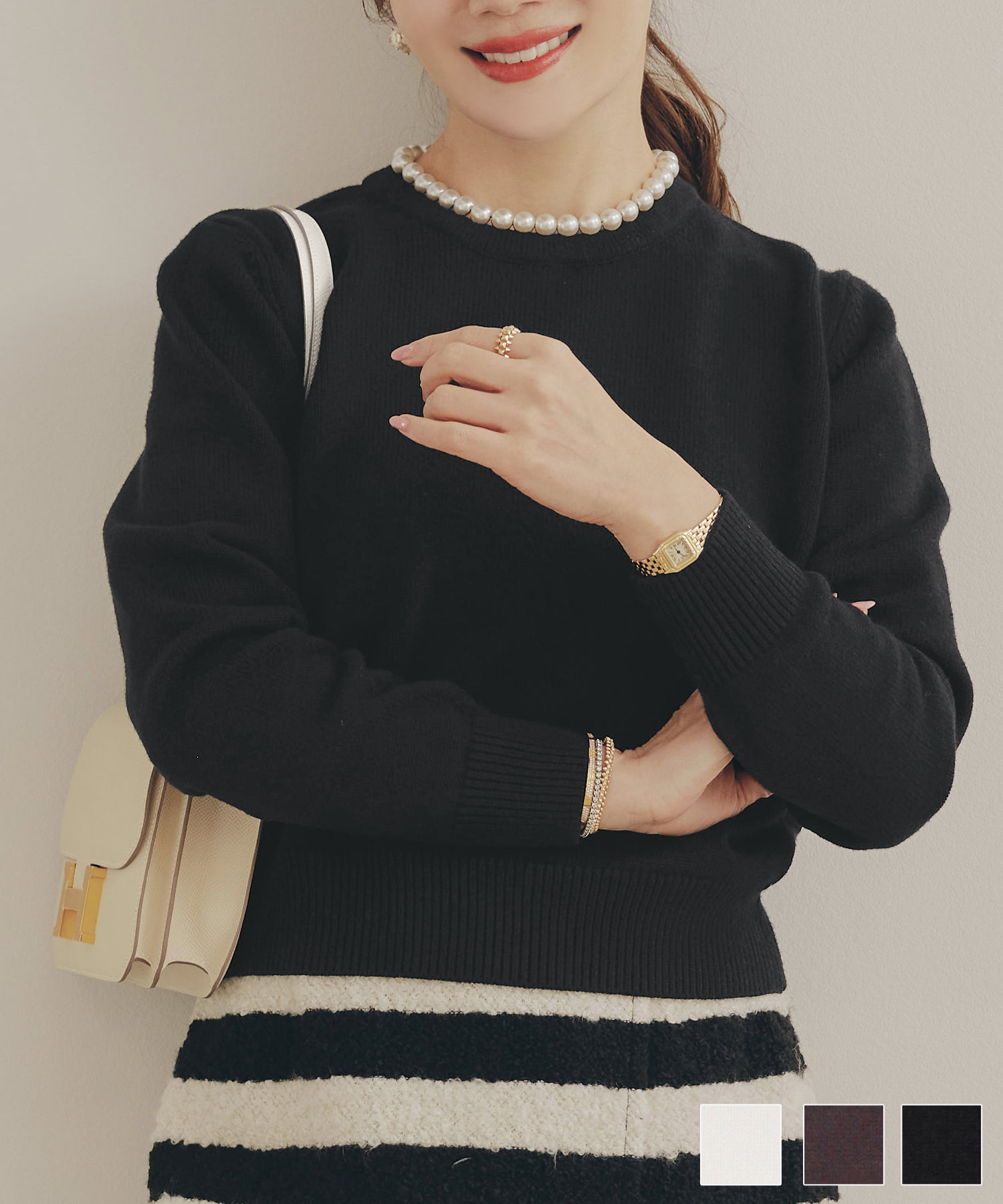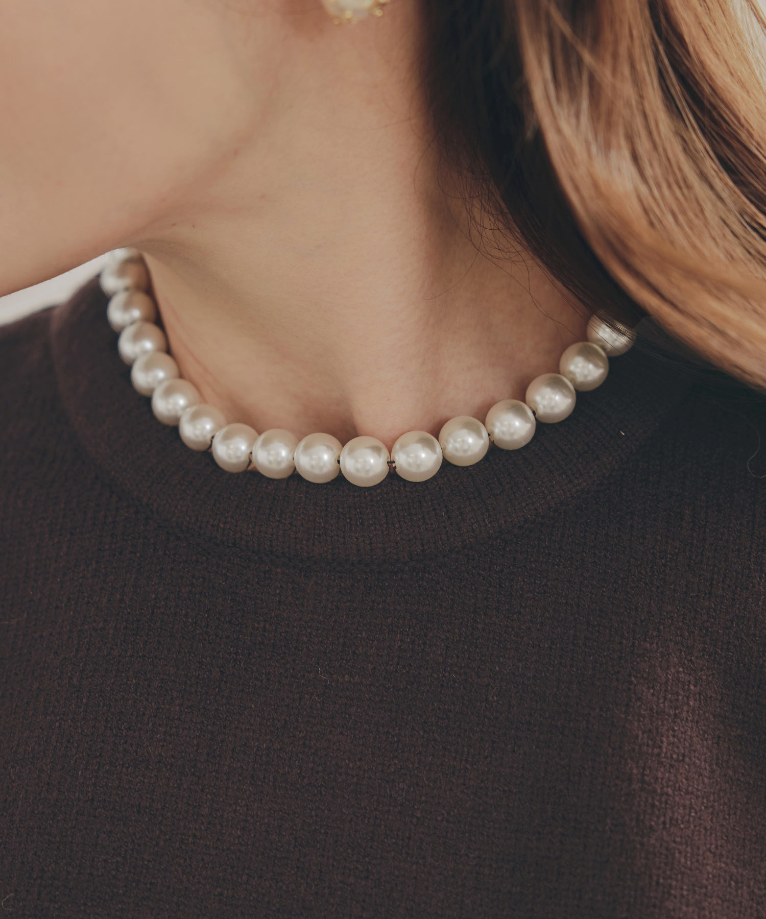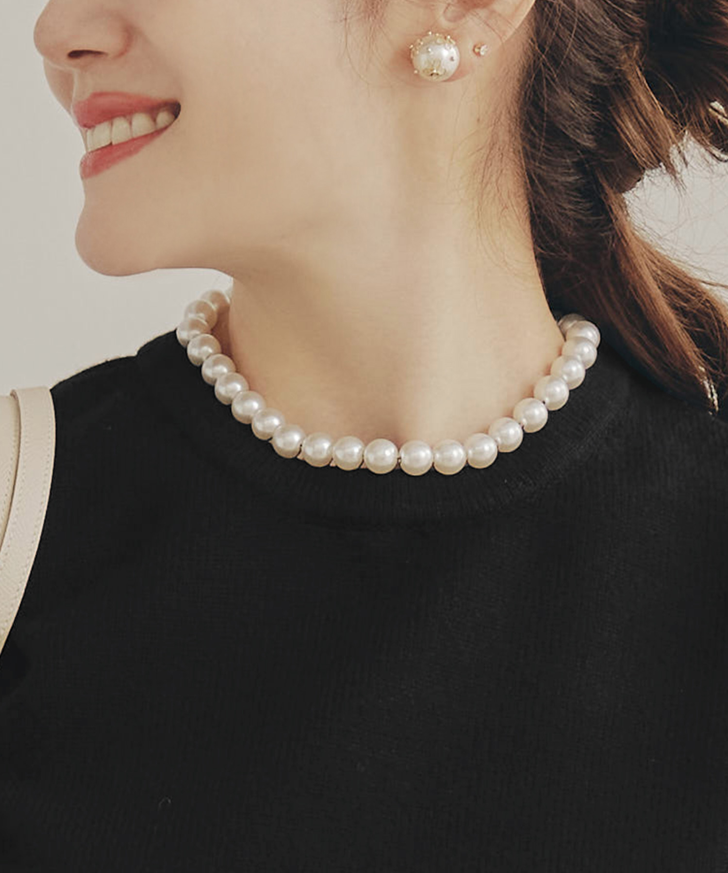 ニットの襟に大ぶりパールをあしらった、シンプルな形ながらアクセサリーいらずの着映えするニットトップス。コンパクトな丈感で、ロングスカートやワイドパンツなどのボトムスとも相性抜群で、着回しやすいアイテムです。通勤はもちろん、サテンのスカートと合わせてディナースタイルを楽しんでも◎。
