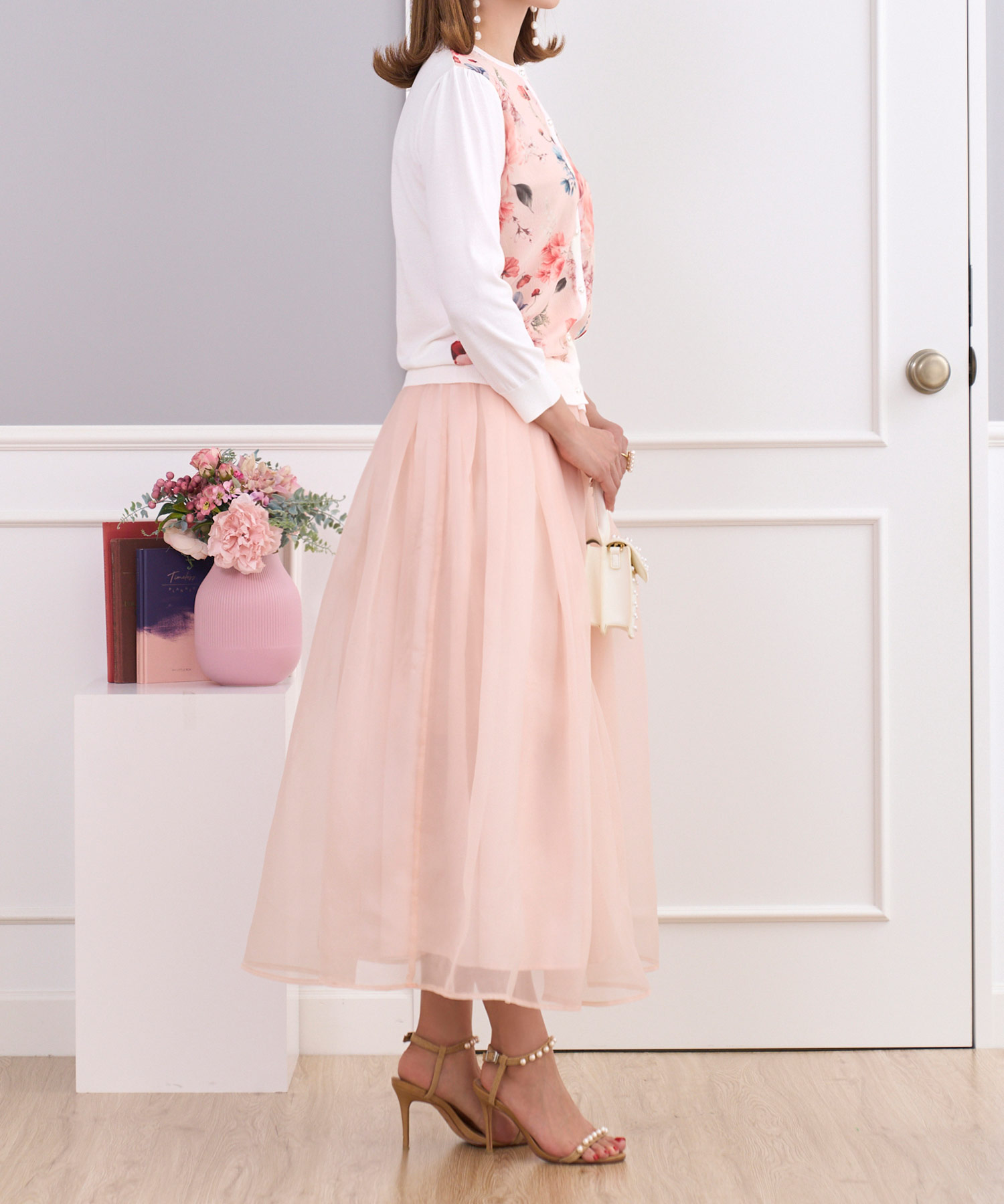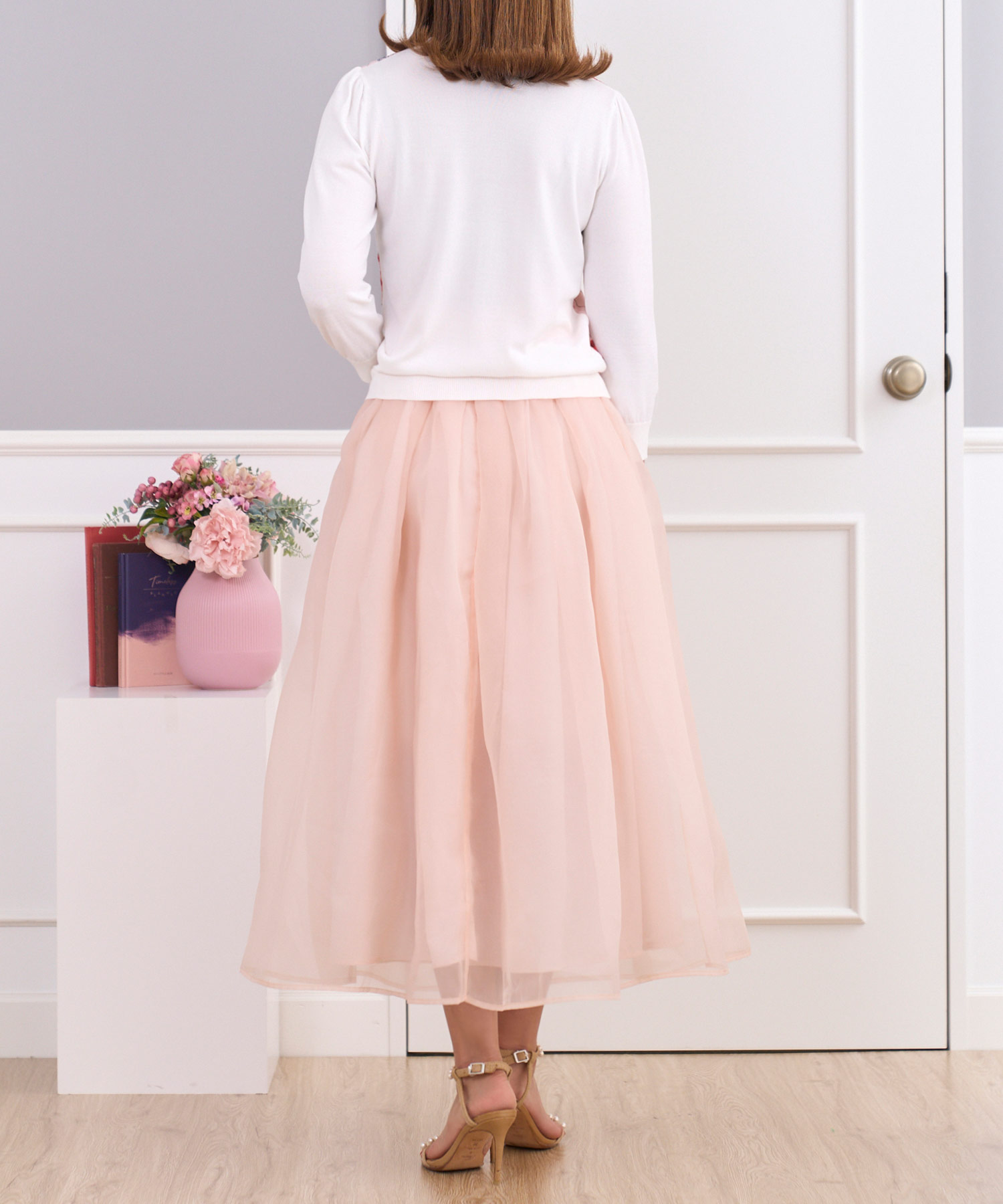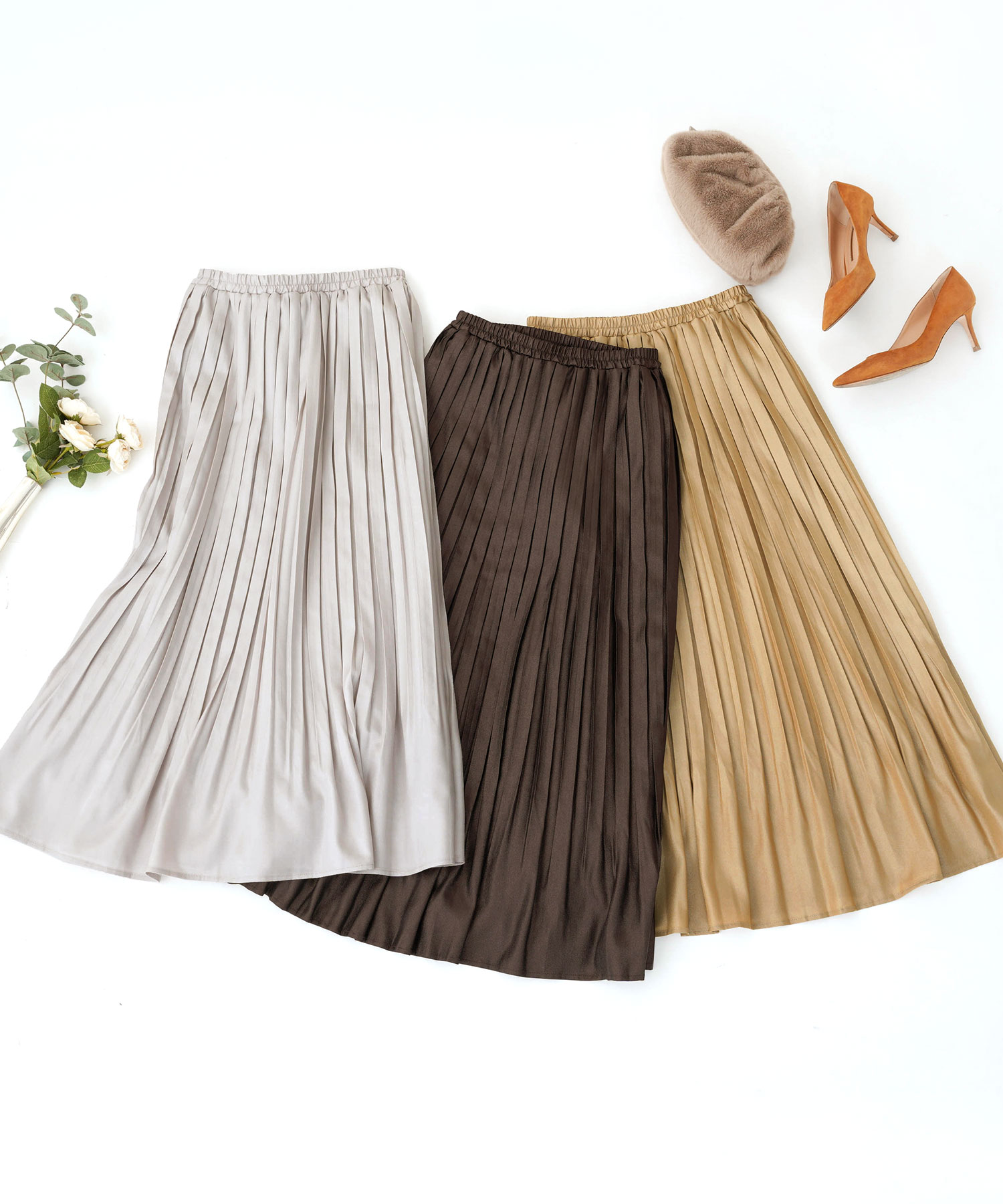 気品漂う淡いピンクベージュのフレアサテンスカートなら着て即エレガント!