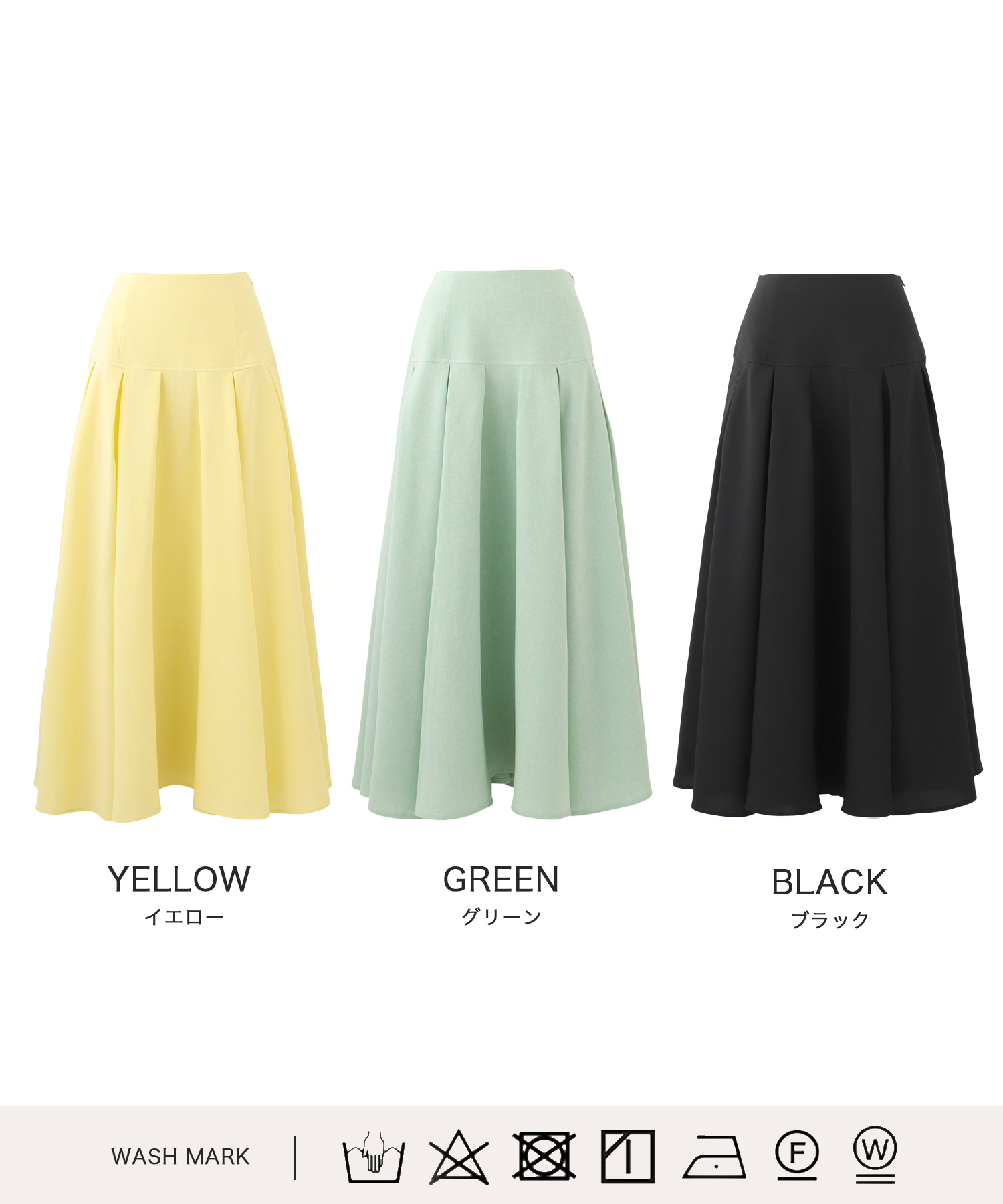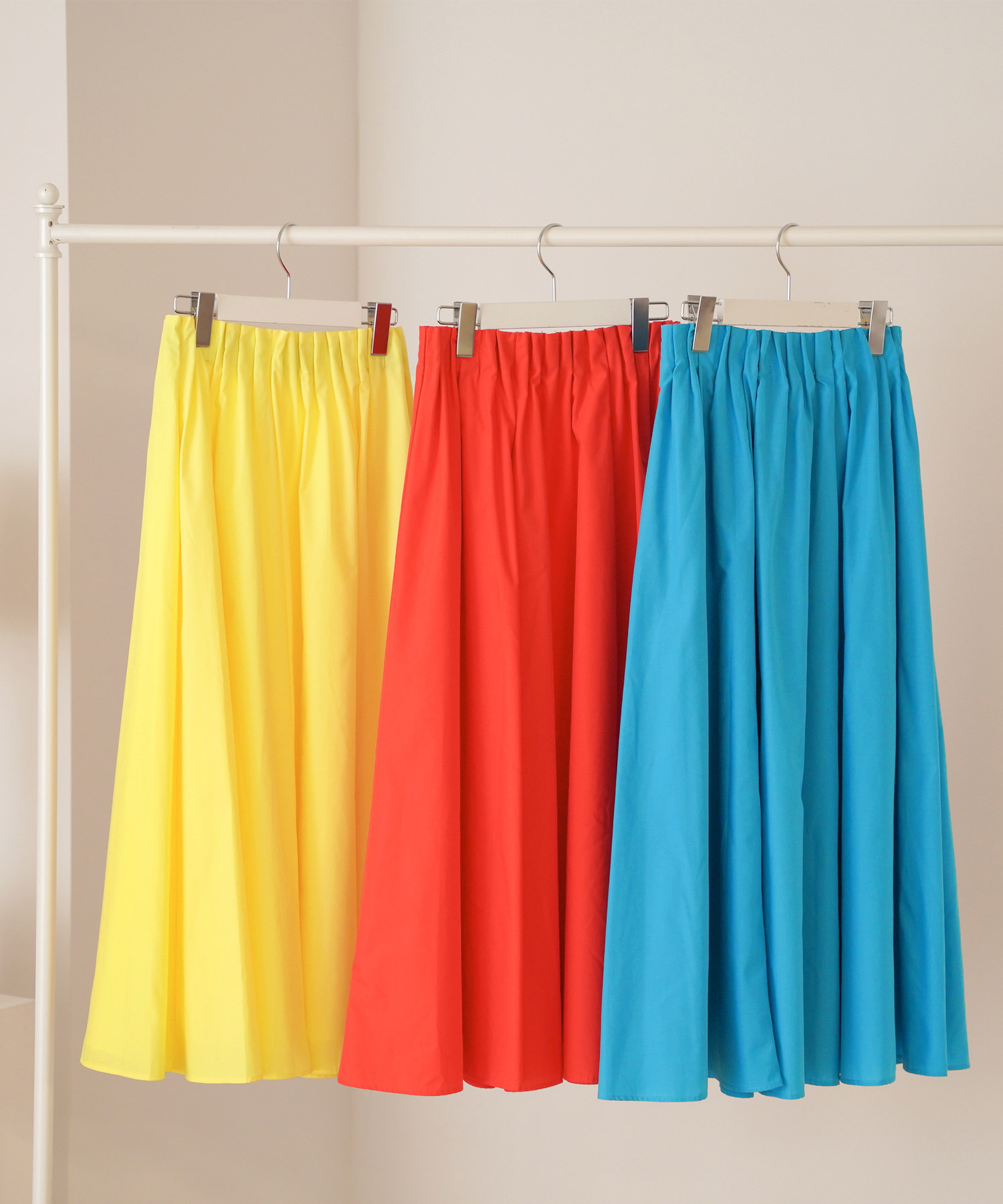 このスカートは華やかな色展開で、レッド、シアンブルー、レモンイエローの3色から選べます。特にシアンブルーはよどみのないすっきりとしたブルーで、シンプルになりがちな夏の装いのアクセントにぴったりです。ウエストは360°ゴム仕様で履き心地抜群。タック入りのウエストデザインで、トップスの裾をインでもアウトでもおしゃれに決まり、着こなしの幅が広がります。ふんわりとしたシルエットで脚にまとわりつきにくく、足さばきも良いです。このスカートで、夏のコーディネートを華やかに彩りましょう。