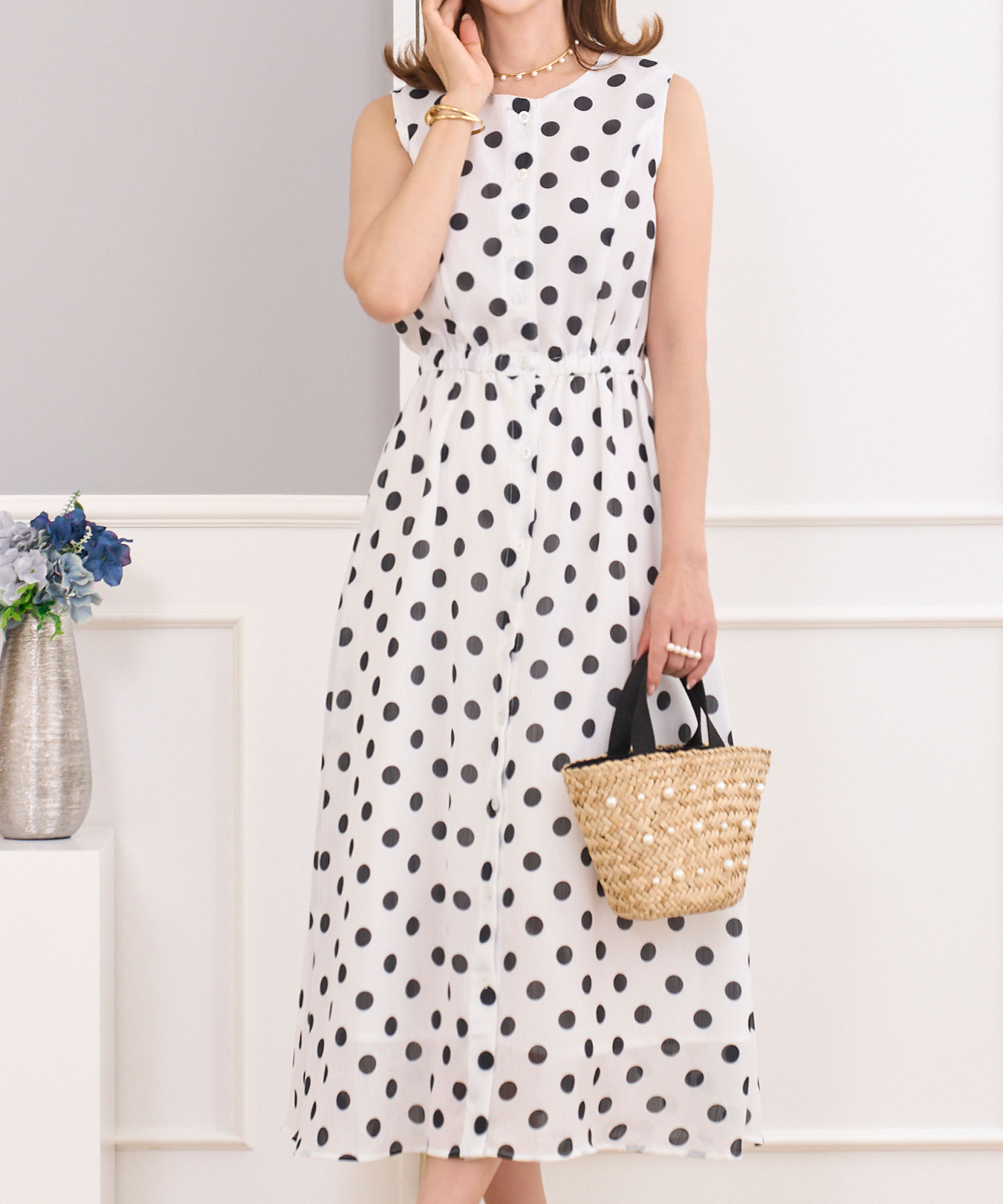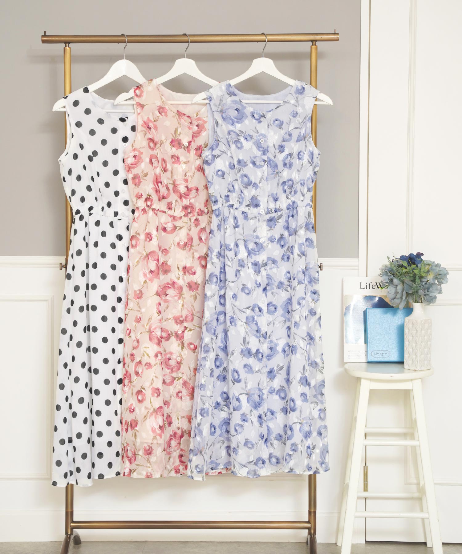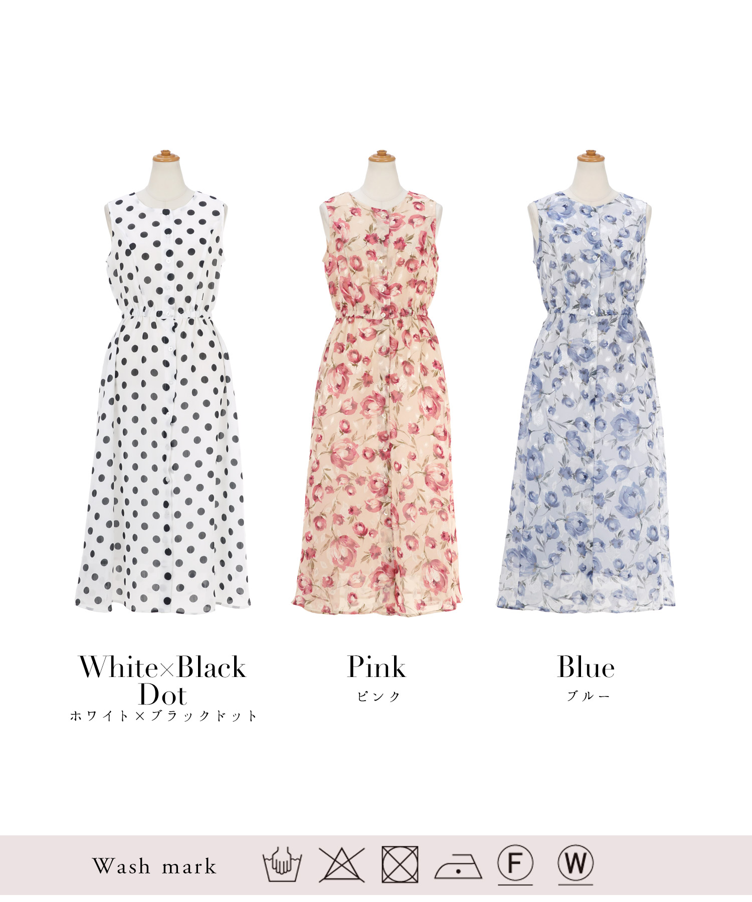 3色展開で、ピンクとブルーは華やかな中花柄、ホワイトはドット柄です。イエベ春タイプの方には、鮮やかなブルーの花柄入りワンピースがおすすめです。涼しげで落ち着いたトーンのデザインが、大人女子にもぴったり。薄くて軽やかな素材で、猛暑の中でも涼しく着用できます。着脱はフロントボタンで簡単にでき、ウエストには一部ゴムが通してあるので、一日中快適に過ごせます。夏を華やかに彩る、このワンピースで快適なおしゃれを楽しんでください。