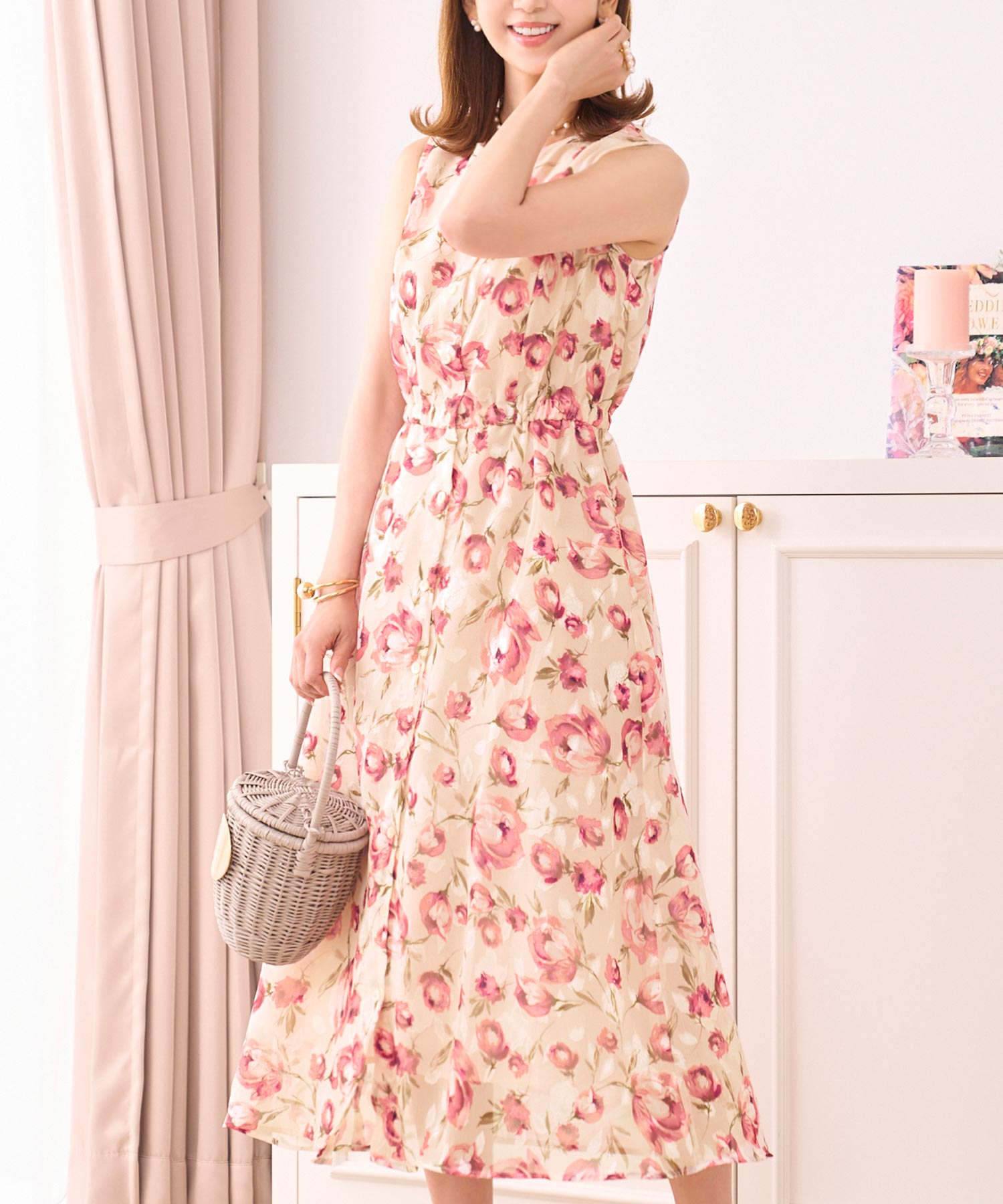 大人女子にも取り入れやすい小花柄で、線画タッチの花柄が幼くならずにエレガントさを演出。バックシャーリングゴムを使用し、ウエストはホールド感がありながらラクチンな着心地です。フロントボタンを採用しているので、乳児ママも授乳しやすい設計になっています。足元はサンダル、パンプス、ローカットスニーカーと相性抜群で、夏のお出かけにぴったりの装いです。イエベ春タイプの方に特におすすめのワンピースで、夏のスタイルを楽しんでください。