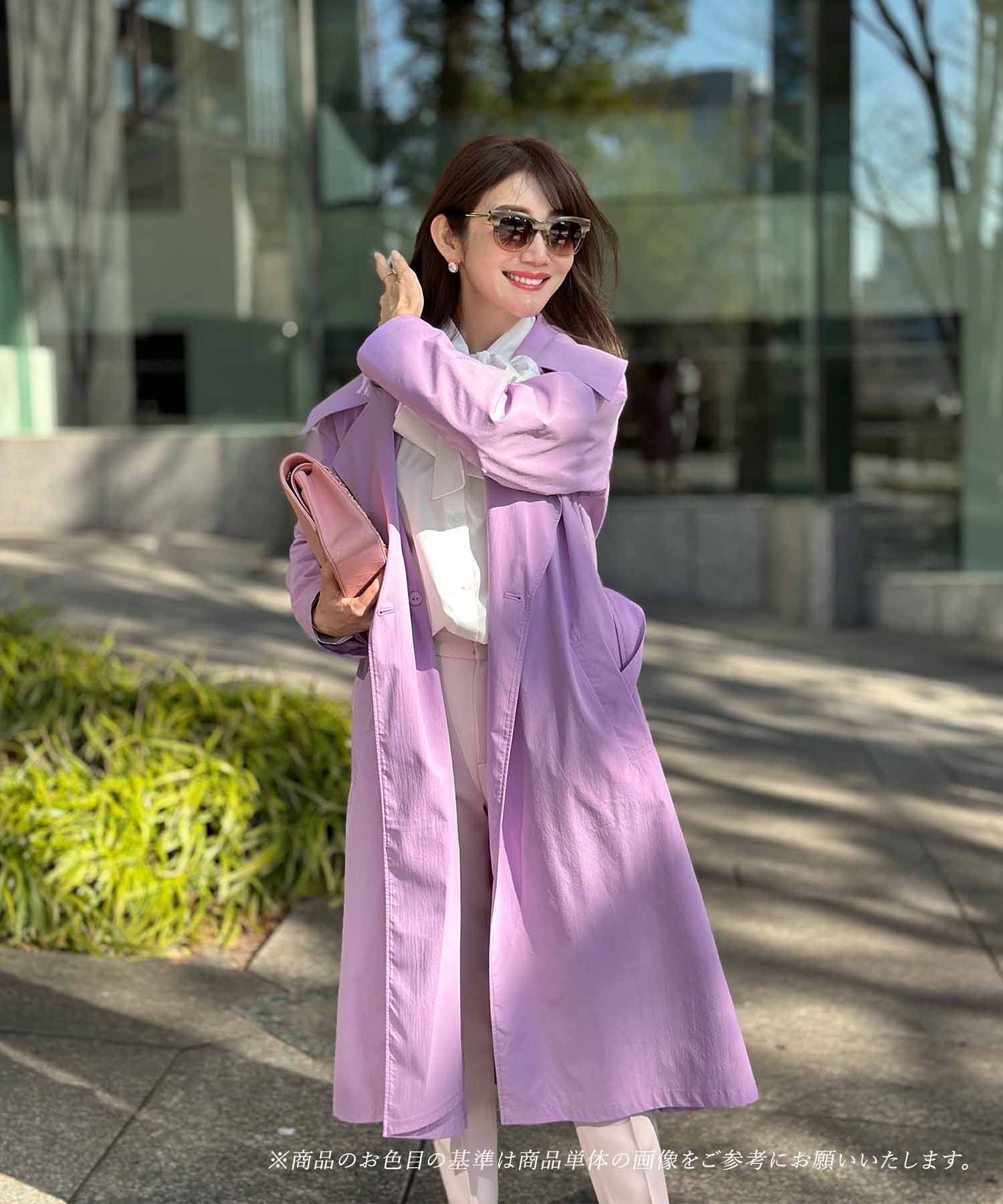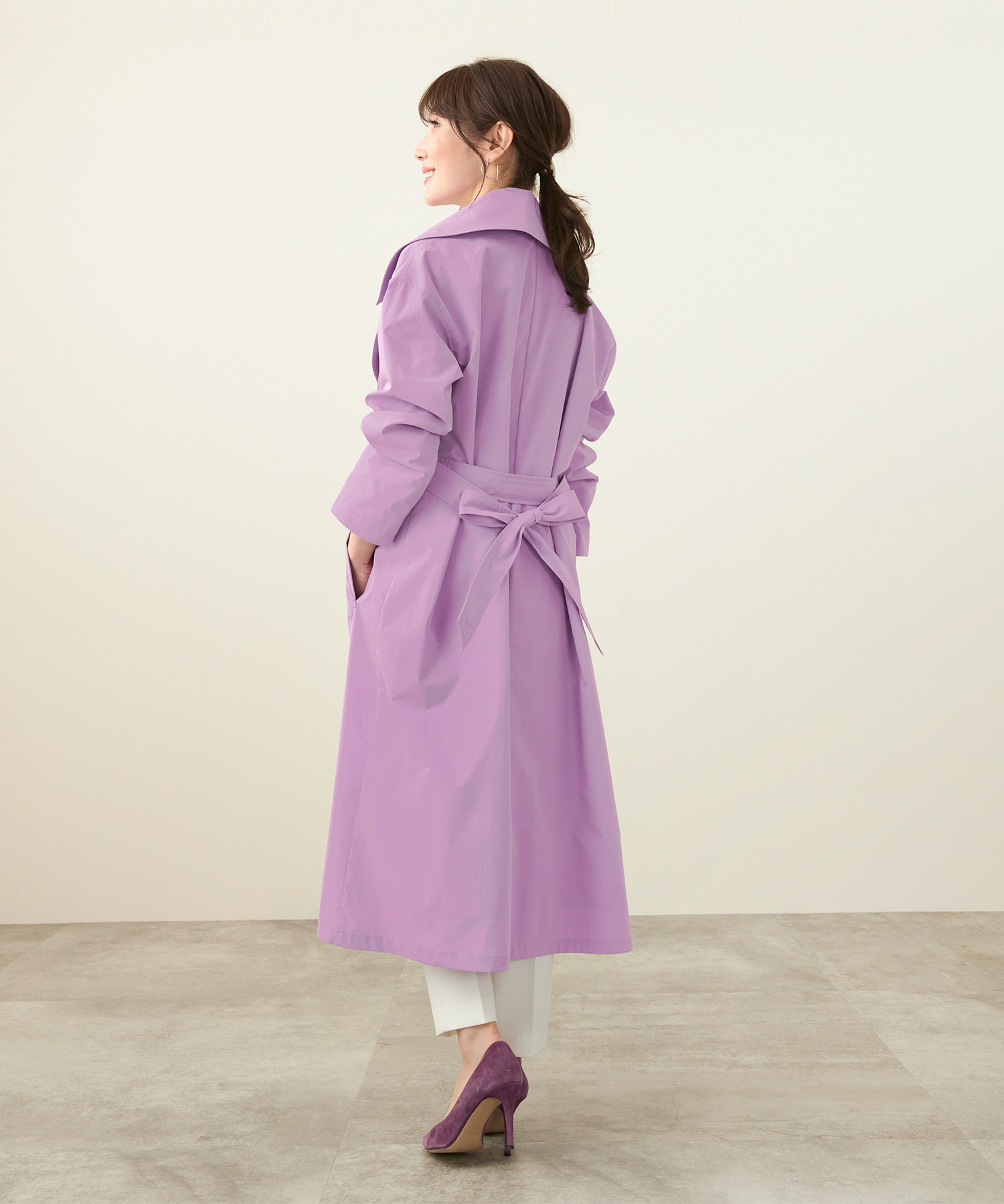 冬から春へのスイッチシーズンにぴったりのスプリングコート。ポイントはカラフルな色展開で、ベーシックなグレージュやネイビーに加え、遊び心の効いたライムイエローとラベンダーの4色から選べます。イエベ春タイプにおすすめなのは肌を明るく華やかに見せるライムイエロー。冬の暗いコーデにサッと羽織るだけで一気に春らしさをアピールできます。テーラードカラーのデザインでウエストベルト付き、マットな光沢とほんのりハリのある生地がきれいなシルエットをキープします。デニムとの相性も抜群で、大人っぽい雰囲気を演出。女子会コーデにもおすすめです。