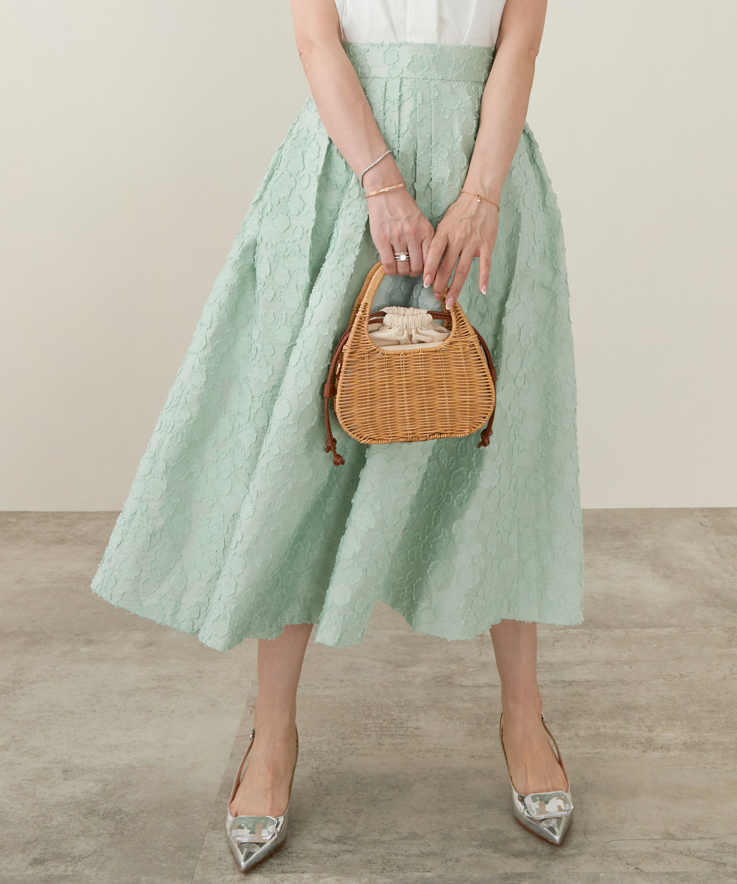 ライトグリーンのジャガードスカートでつくるイエベ春の爽やかな通勤コーデ