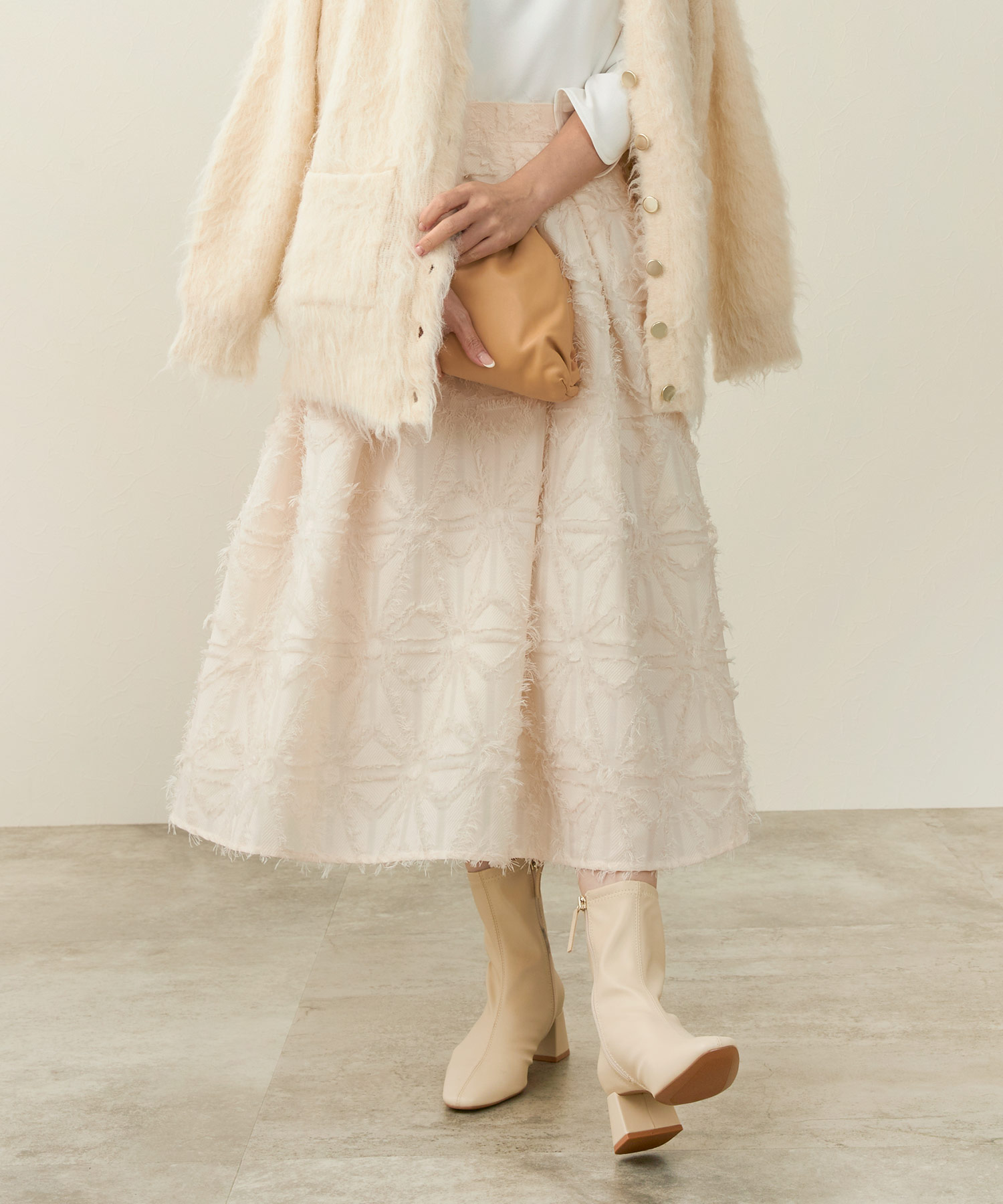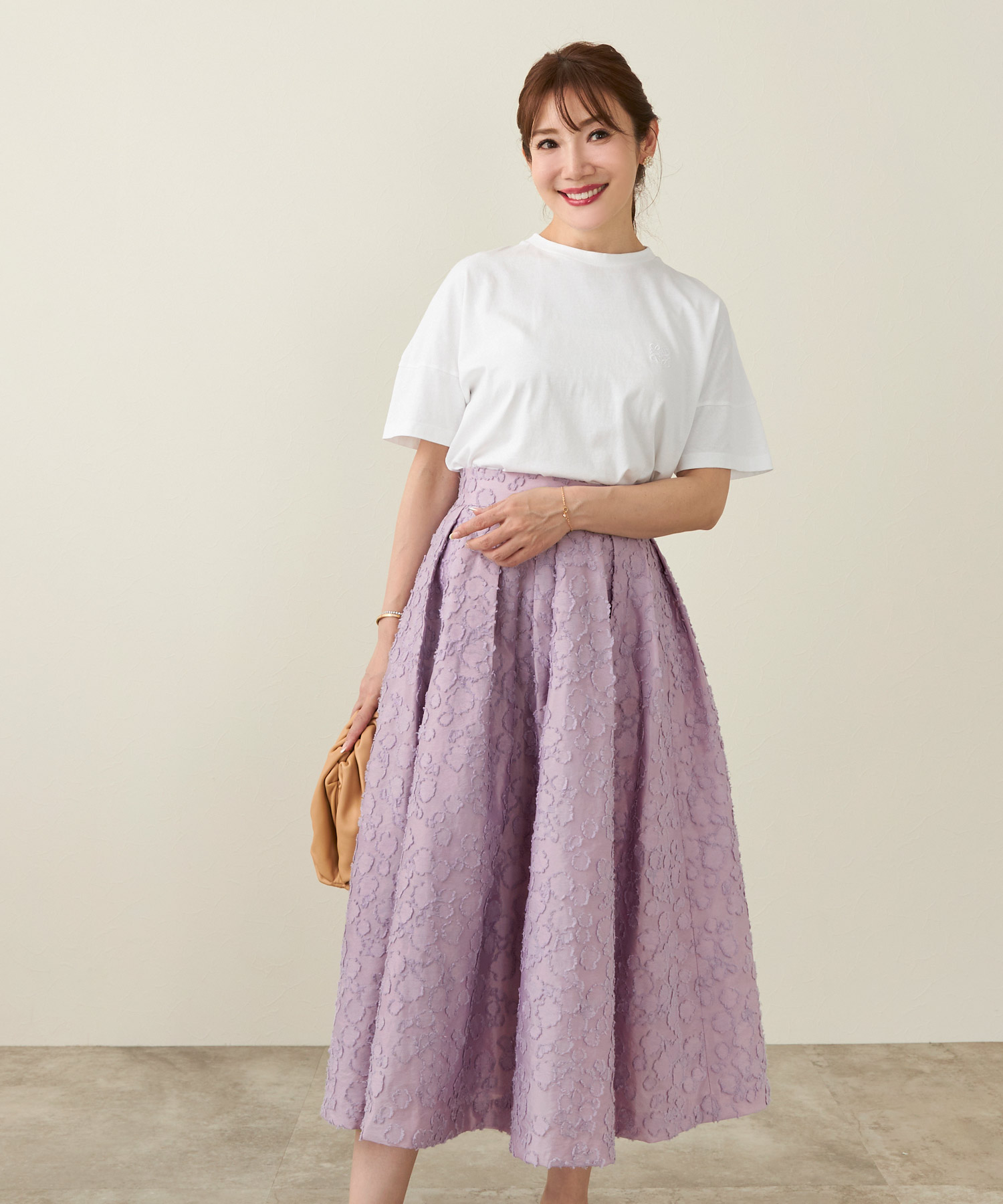 イエベ春の方に最適!シンプルコーデのアクセントにキャメルジャガードスカートが効く!