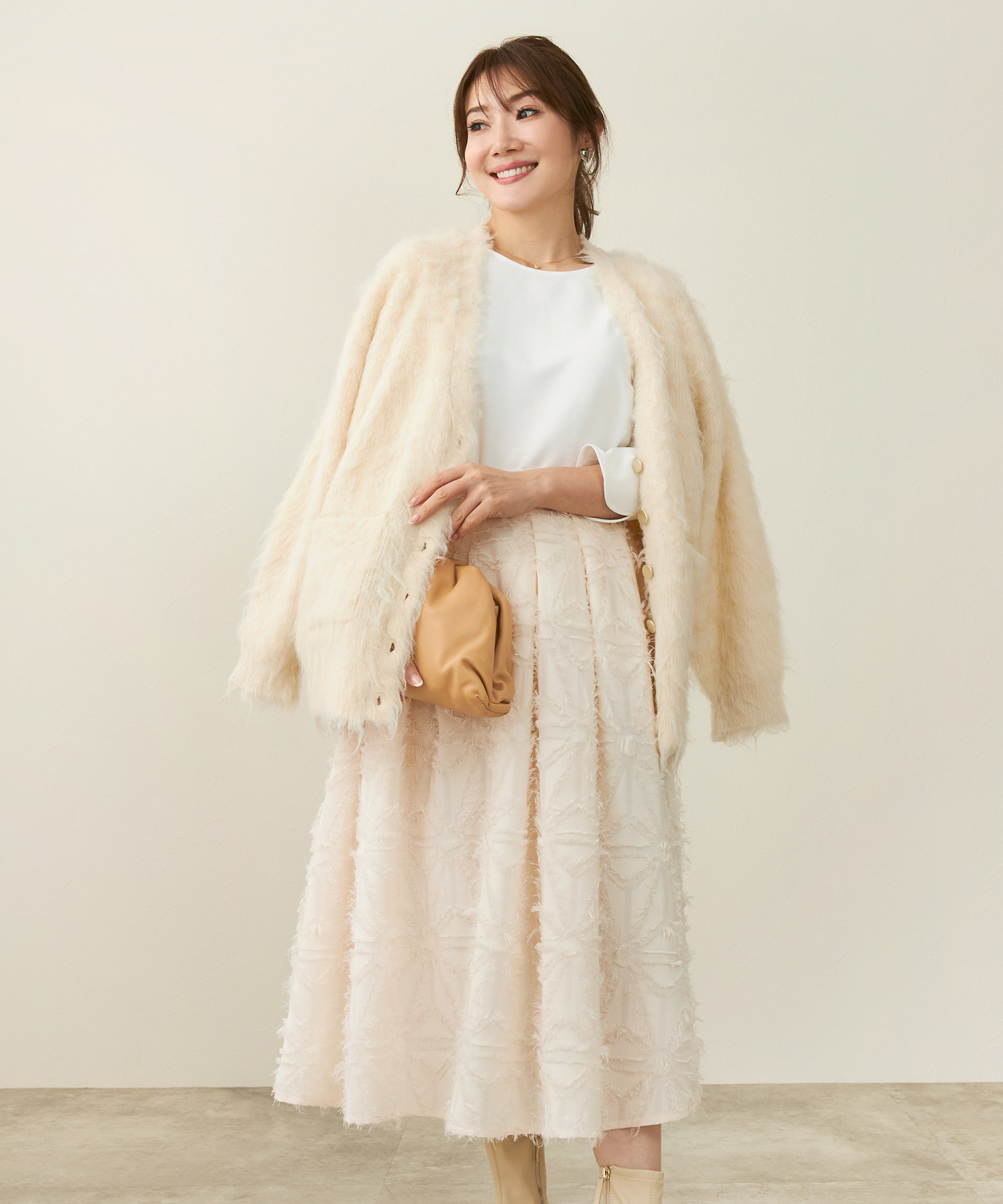 まるでバニラのようなホワイトのニットワンピースでイエベ春さんの冬支度