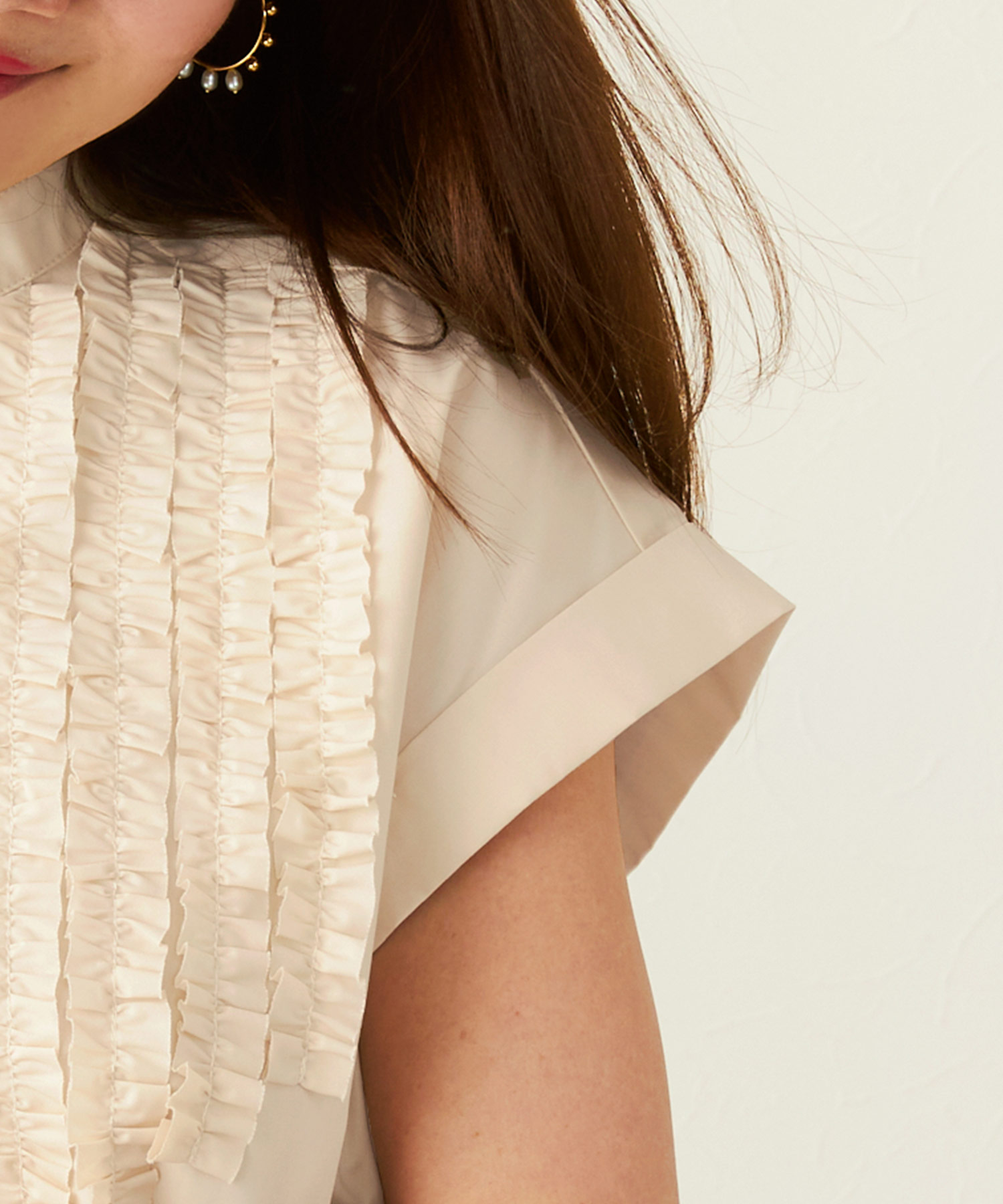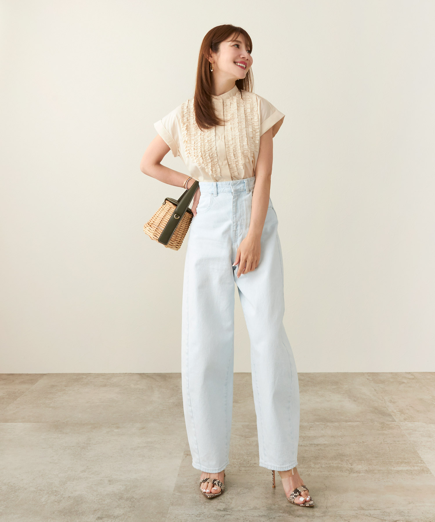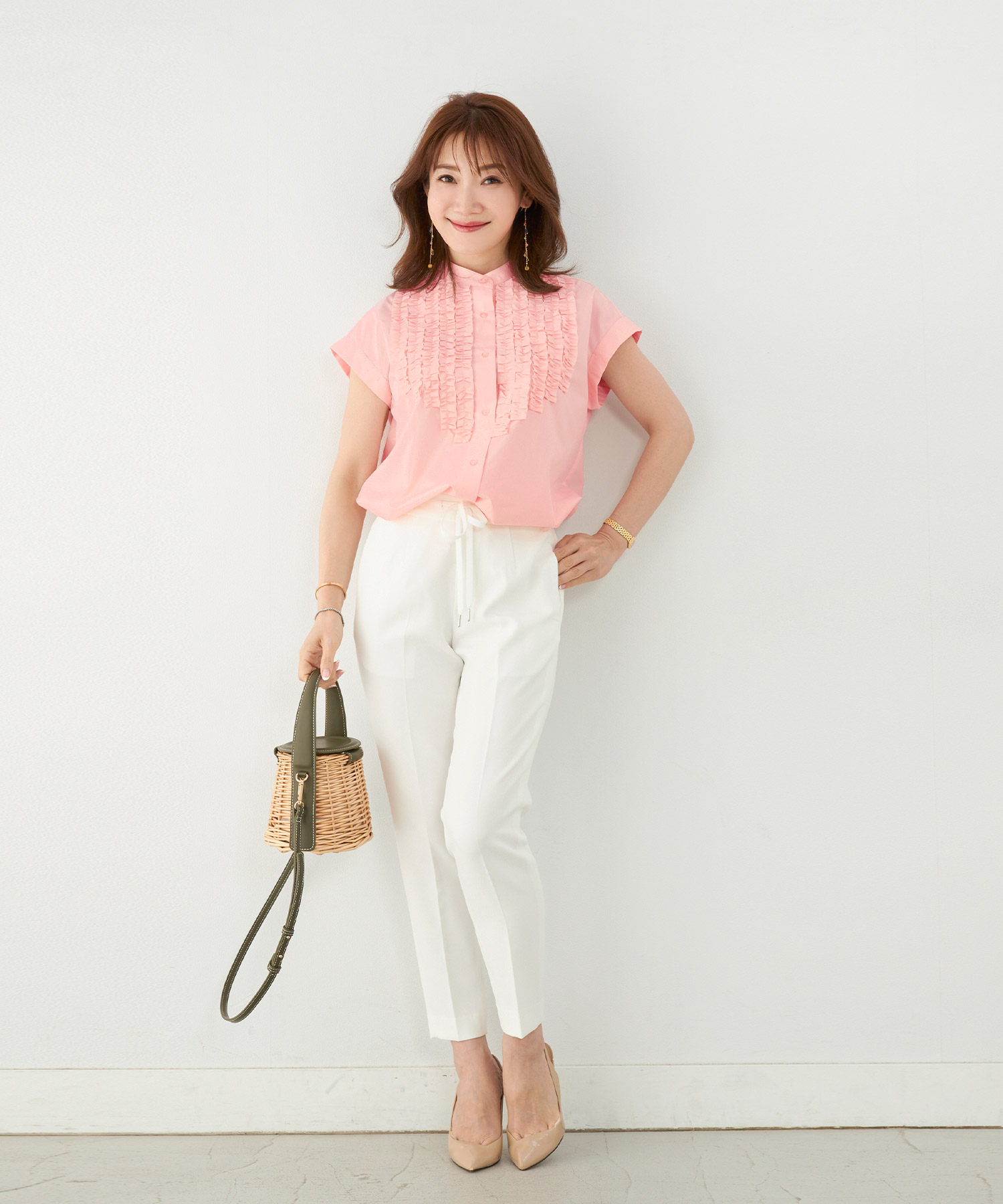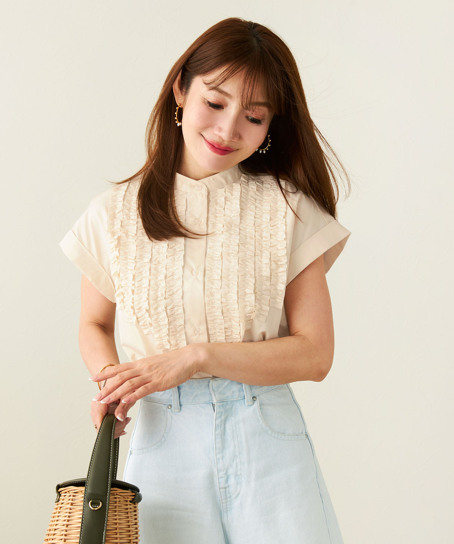 ライトベージュのフロントフリルブラウスで夏コーデを華やかに