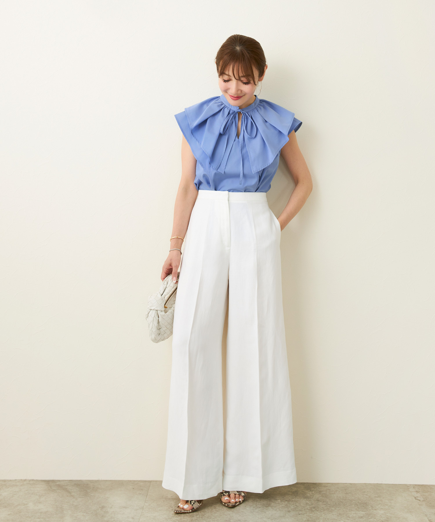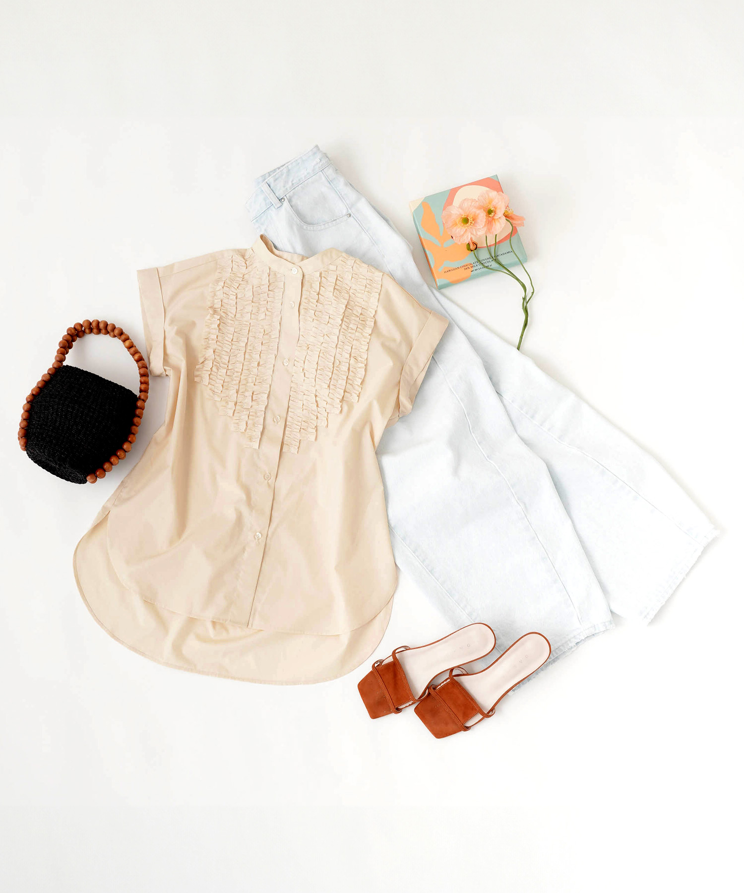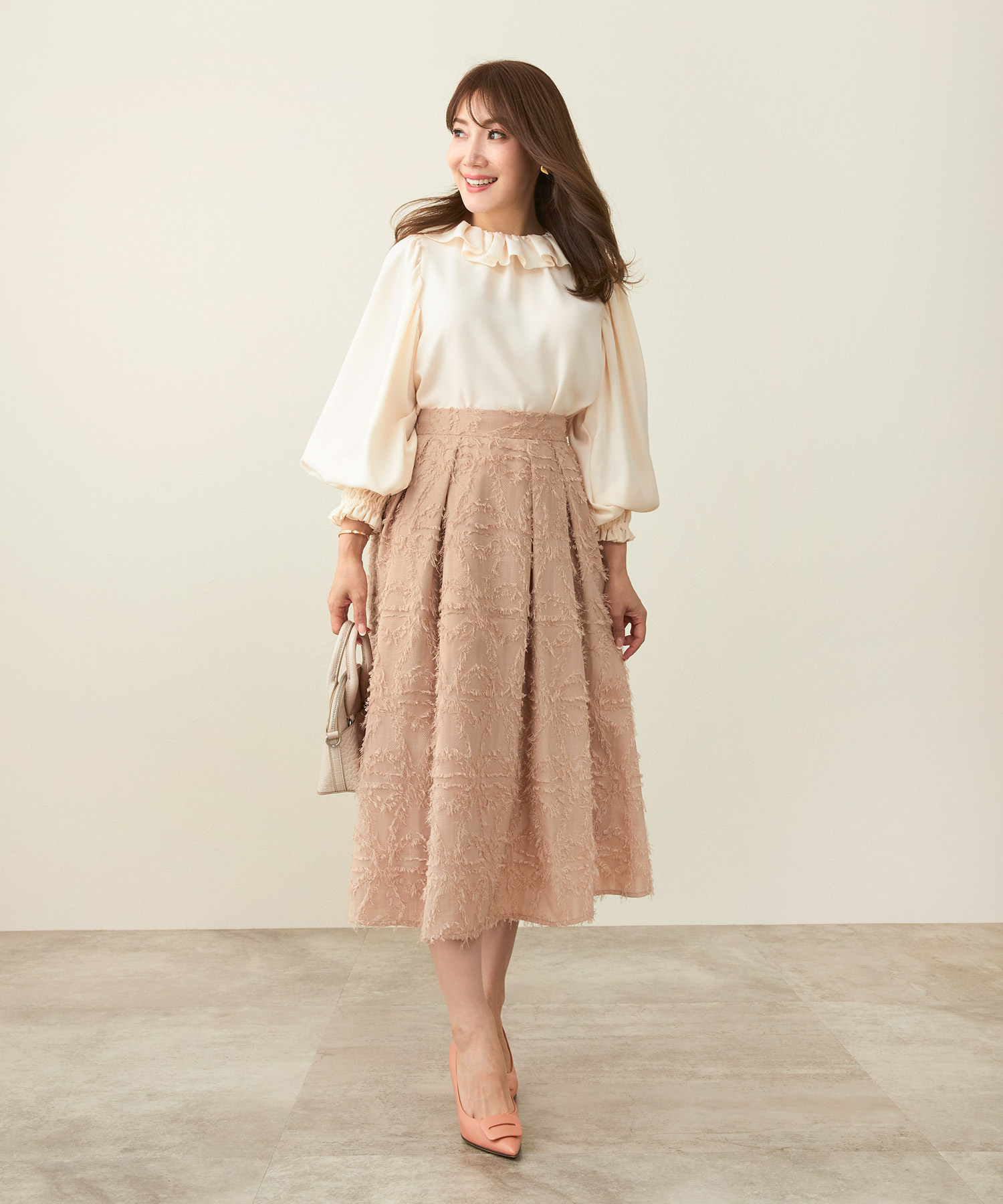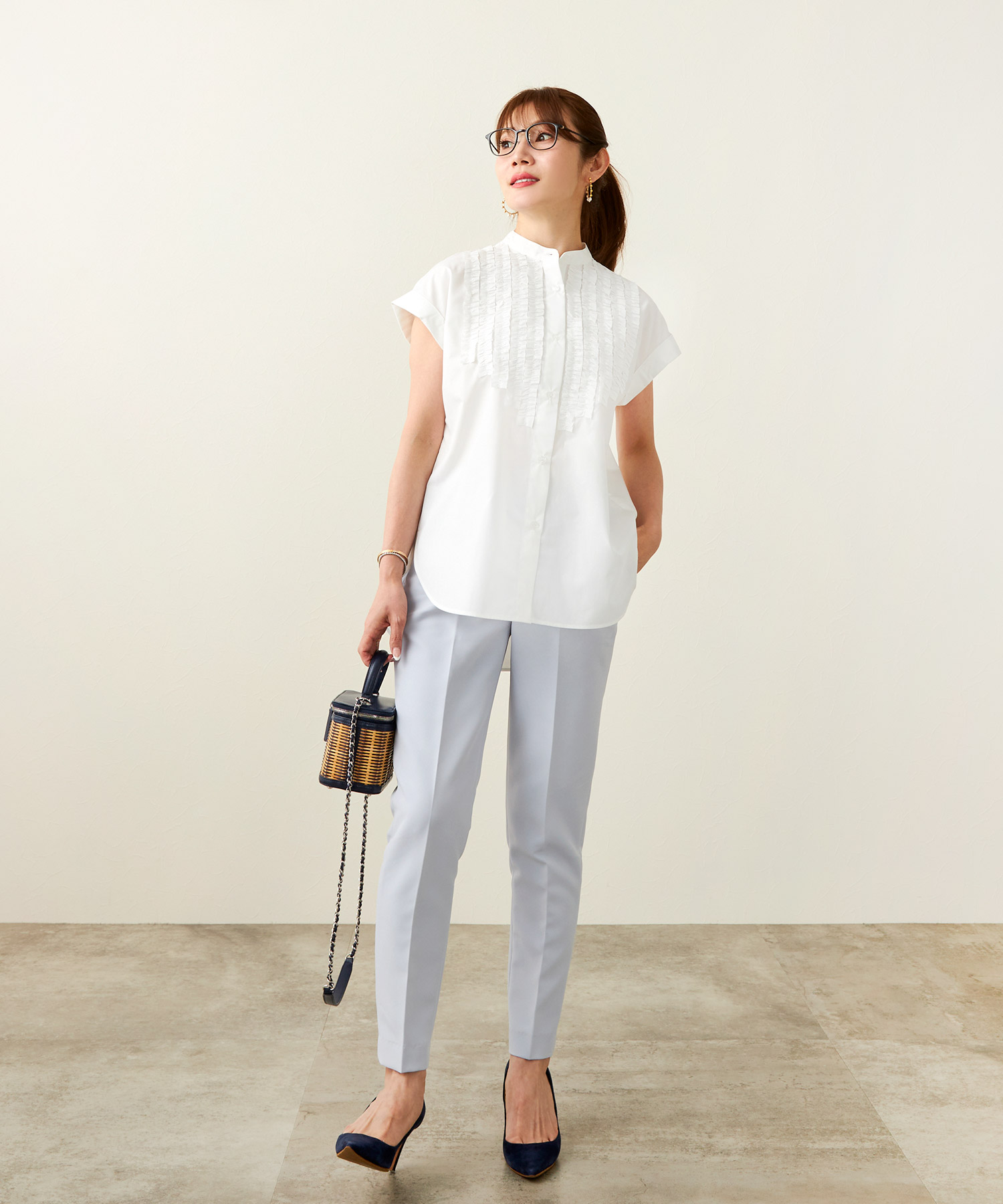 ライトベージュのフロントフリルブラウスで夏コーデを華やかに