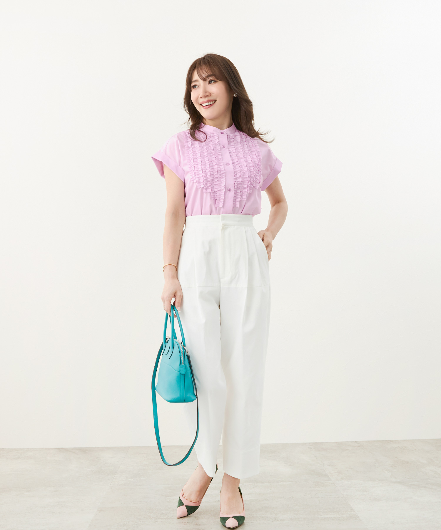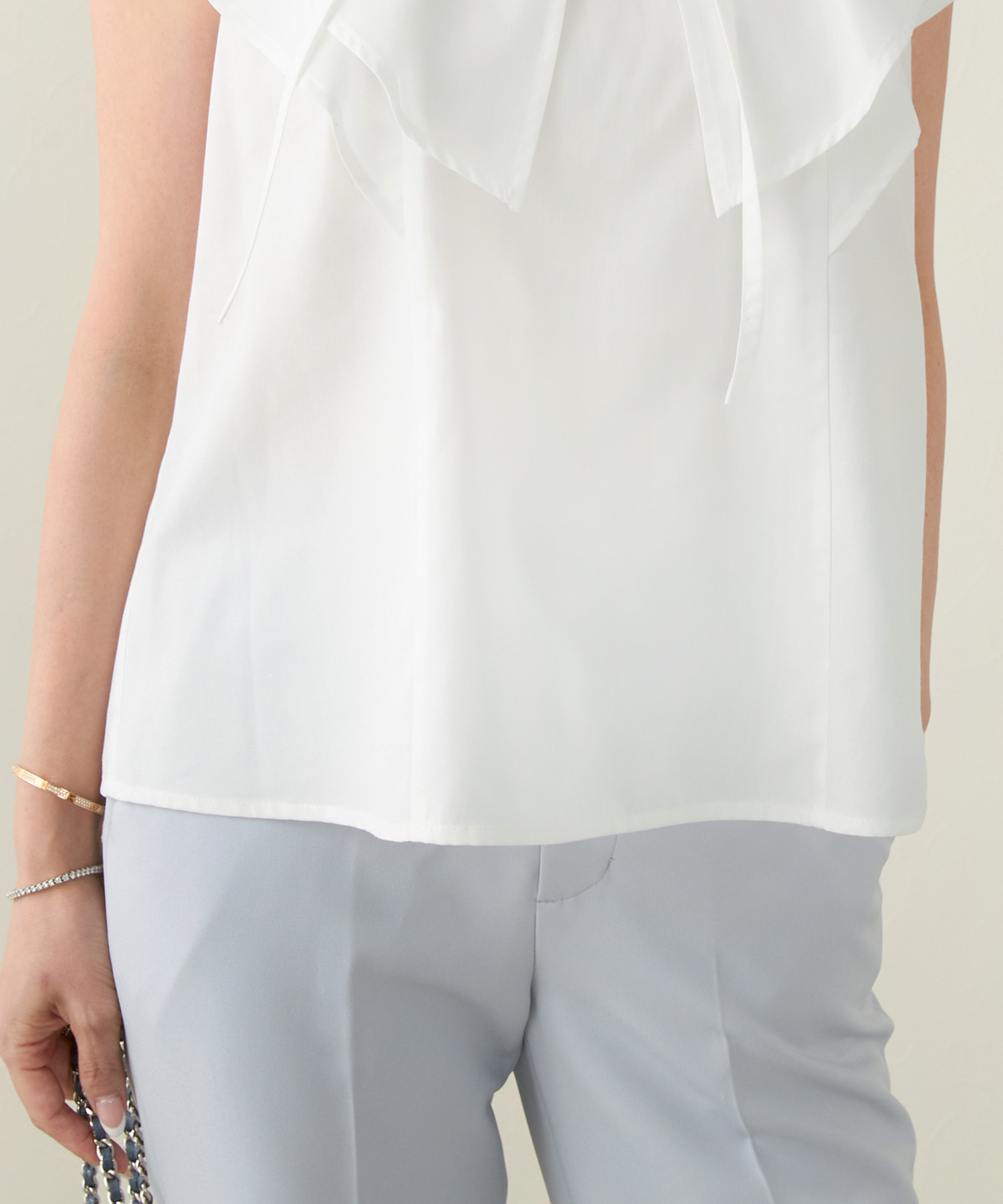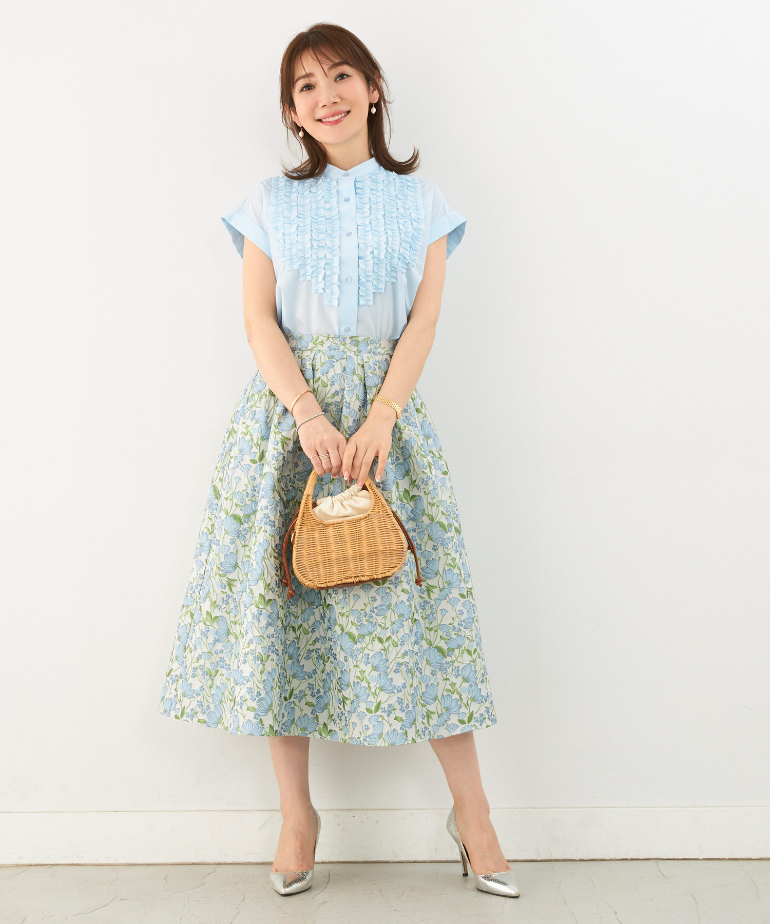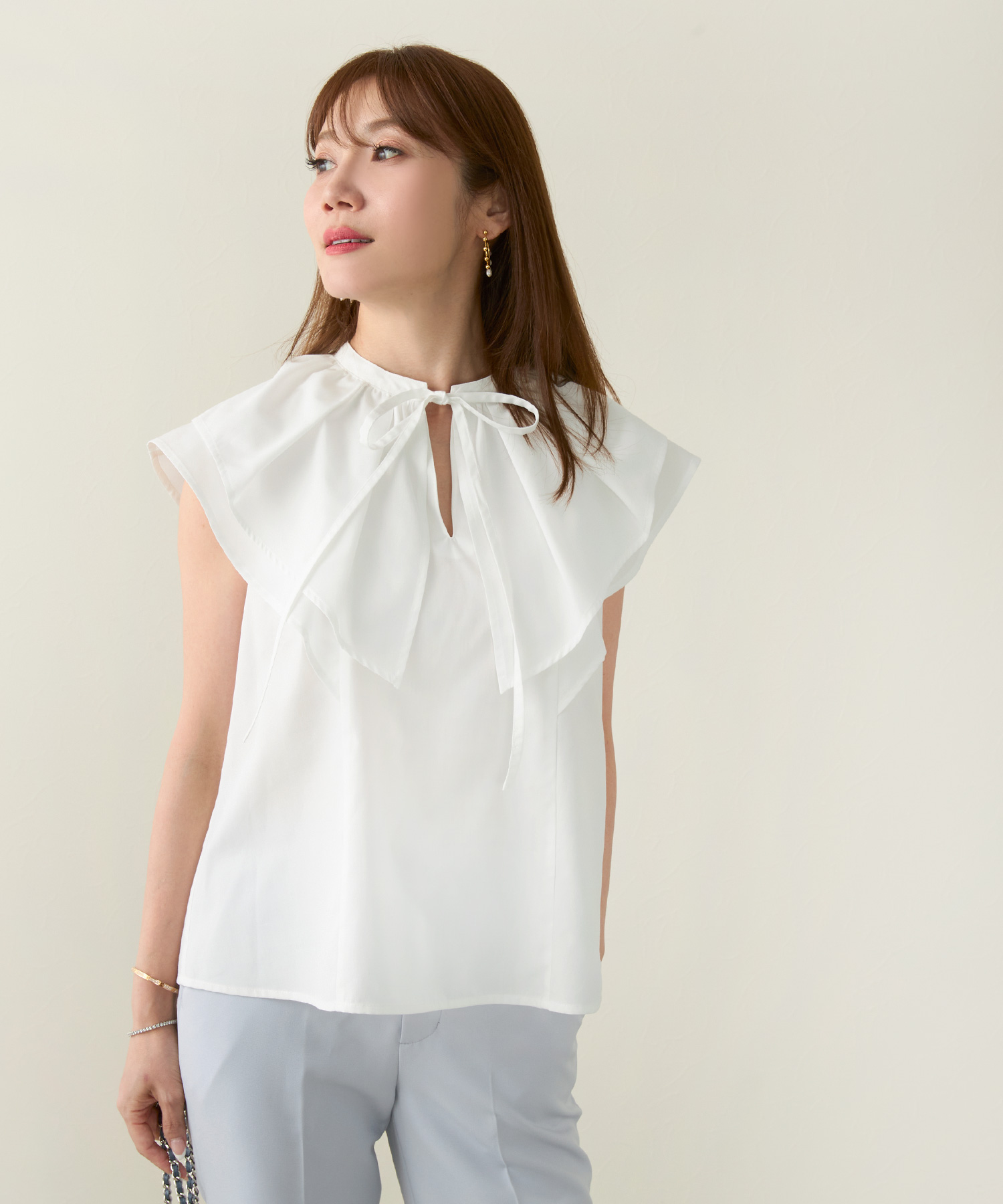 ライトベージュのフロントフリルブラウスで夏コーデを華やかに