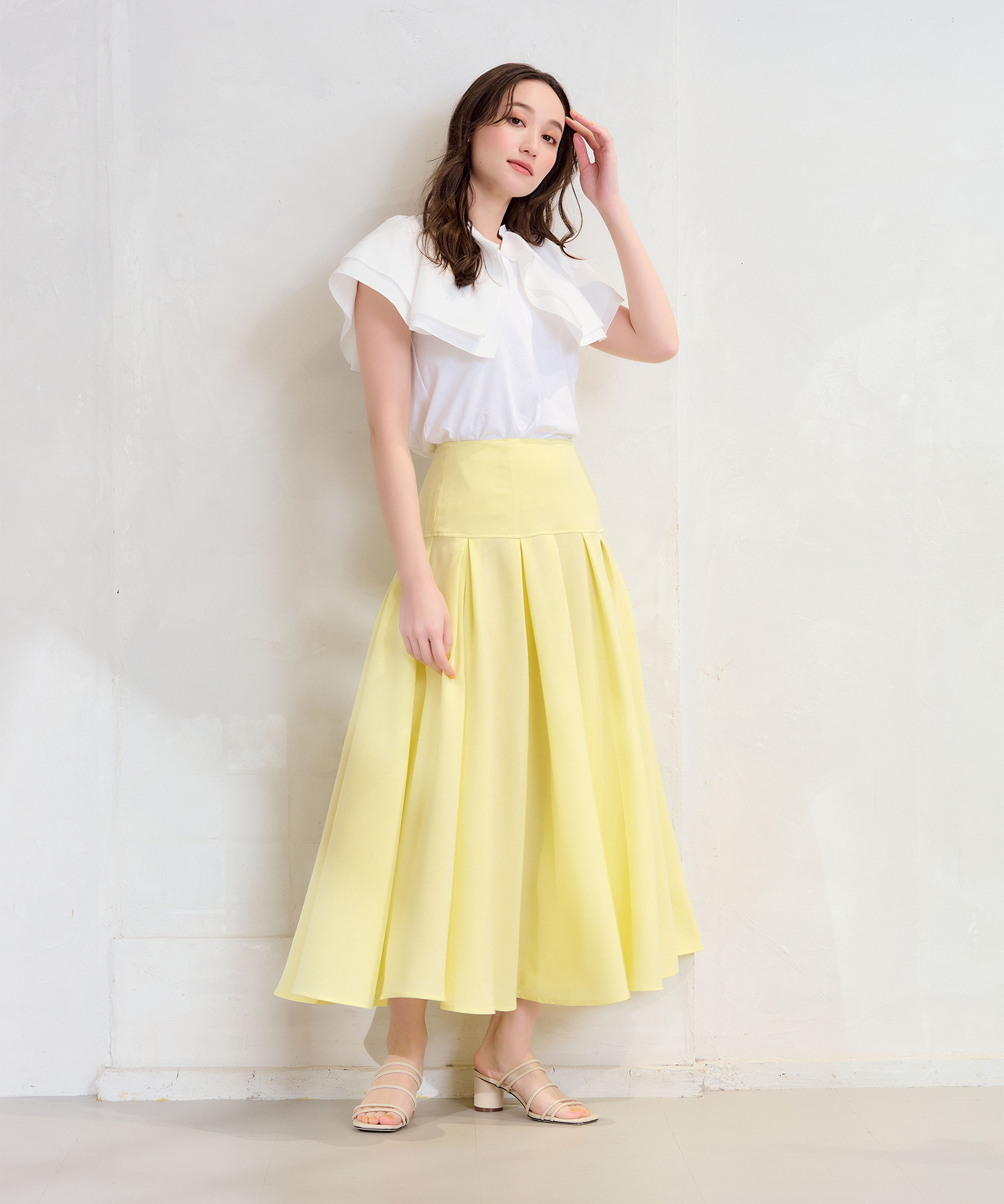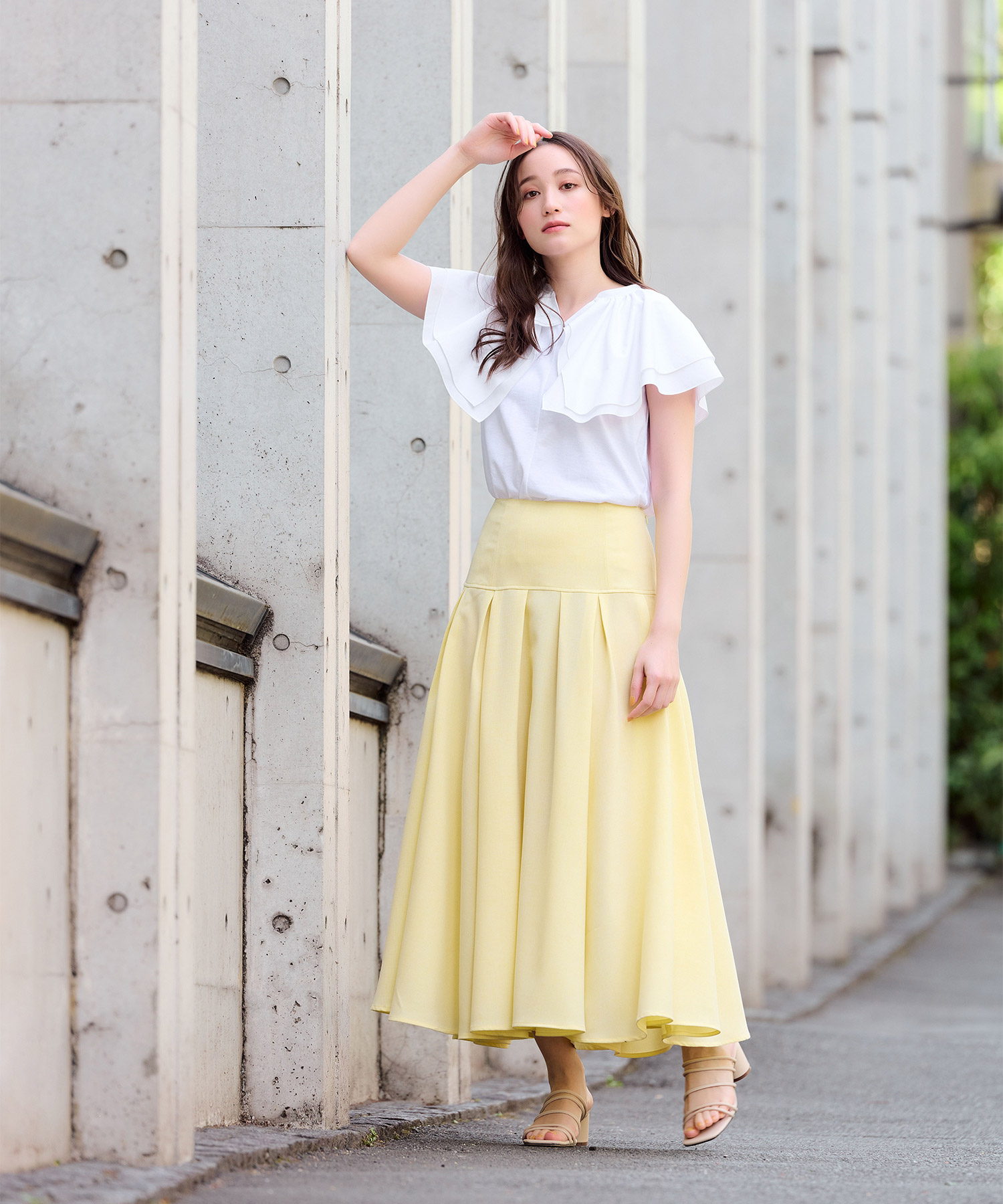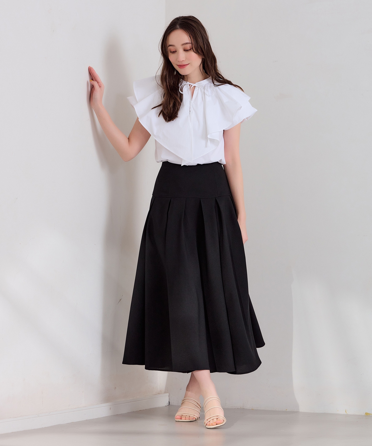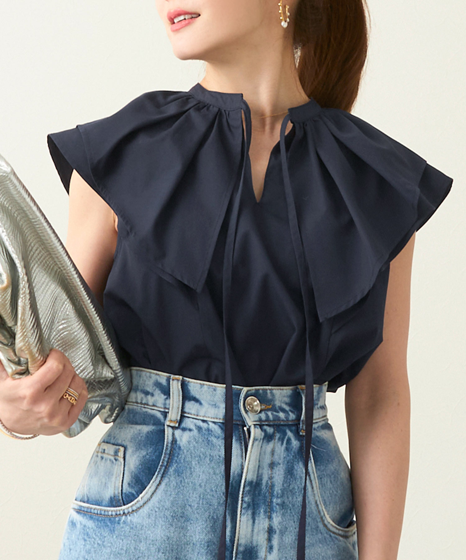 ライトベージュのフロントフリルブラウスで夏コーデを華やかに