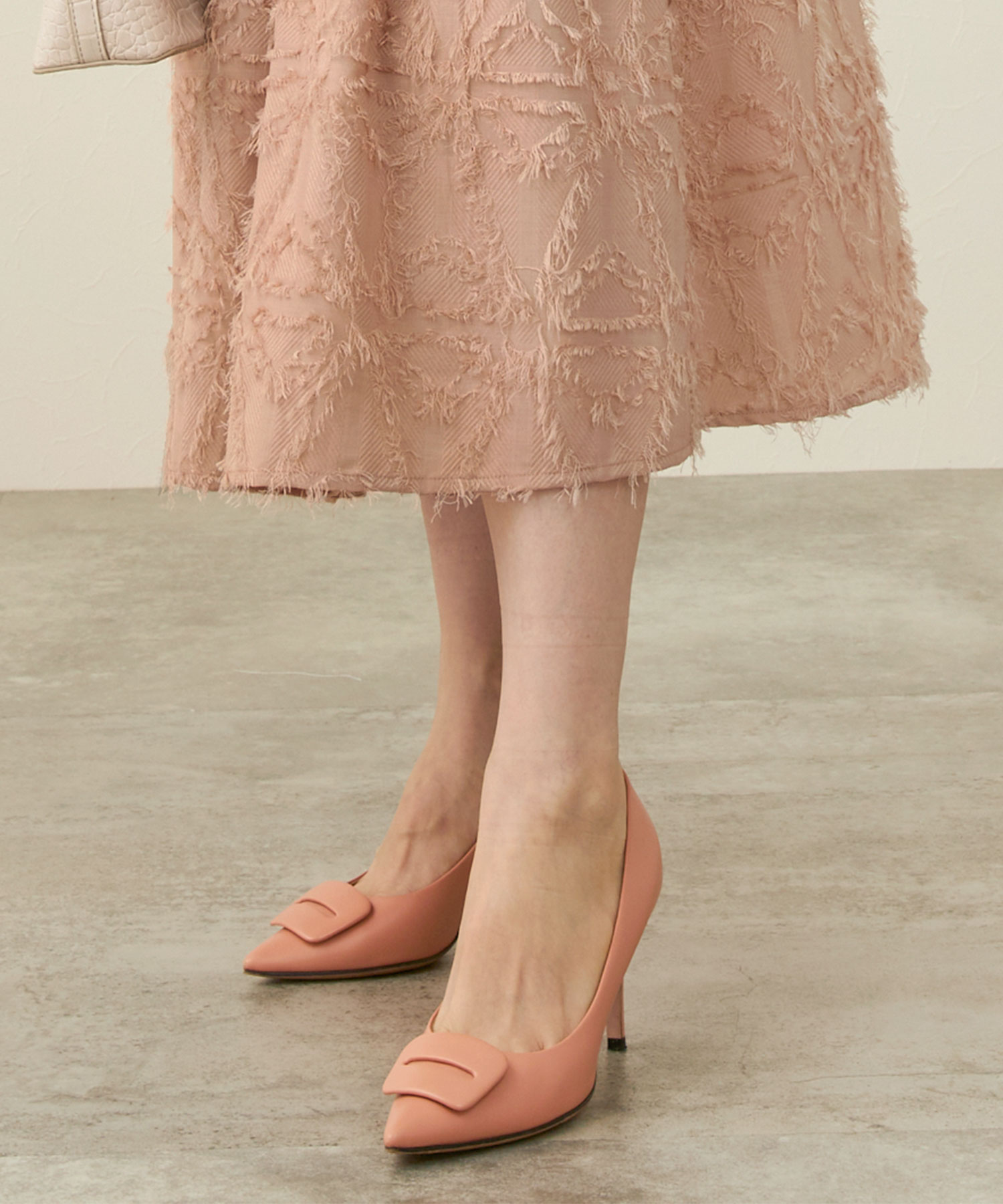 ホテルのアフタヌーンティーにぴったりのエレガントなコーラルピンクのワンピース。微起毛の糸が織り込まれたツイード生地で大人っぽさを演出。襟ぐりにあしらわれた2連パールがアクセサリーなしでも華やかな印象を与えます。フィットアンドフレアのメリハリあるシルエットでスタイルアップ効果も抜群。コーラルピンクのワンピースに、同じくピンクのバッグとスエードピンクのヒールを合わせることで、統一感のある大人っぽくエレガントなコーディネートが完成します。