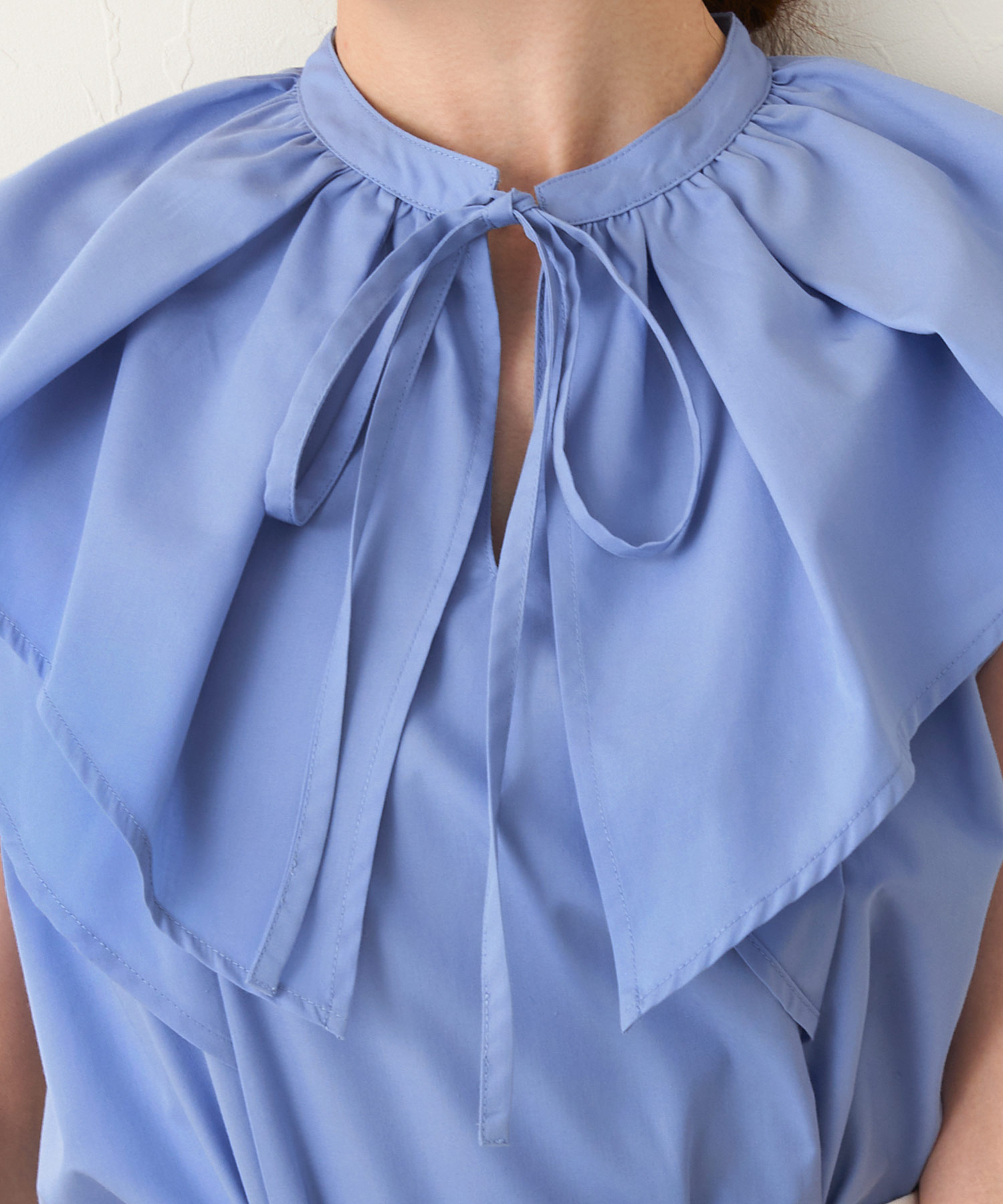 二段襟がポイント!涼し気なサックスカラーのシャツ地を使ったフリルリボンブラウス
