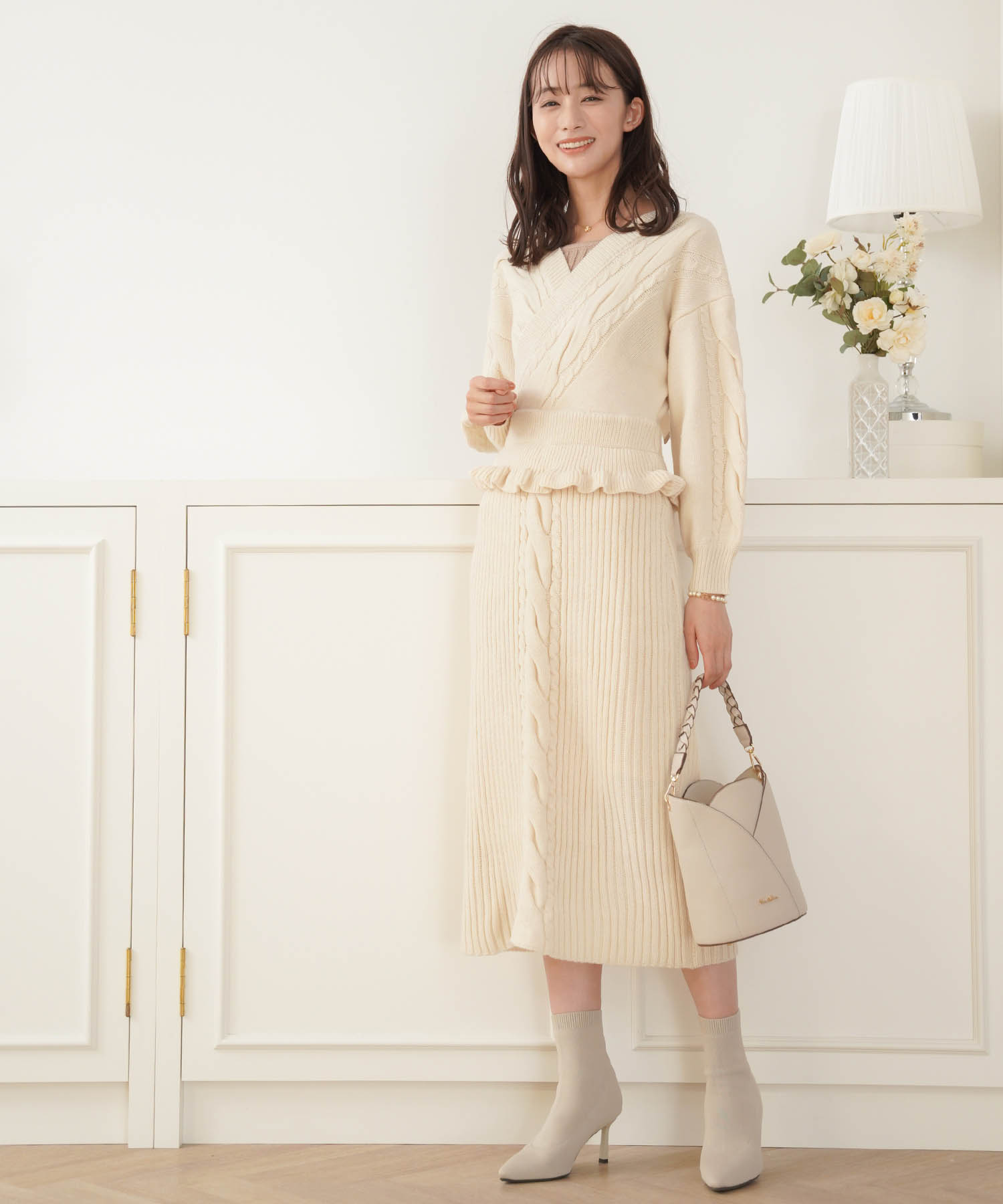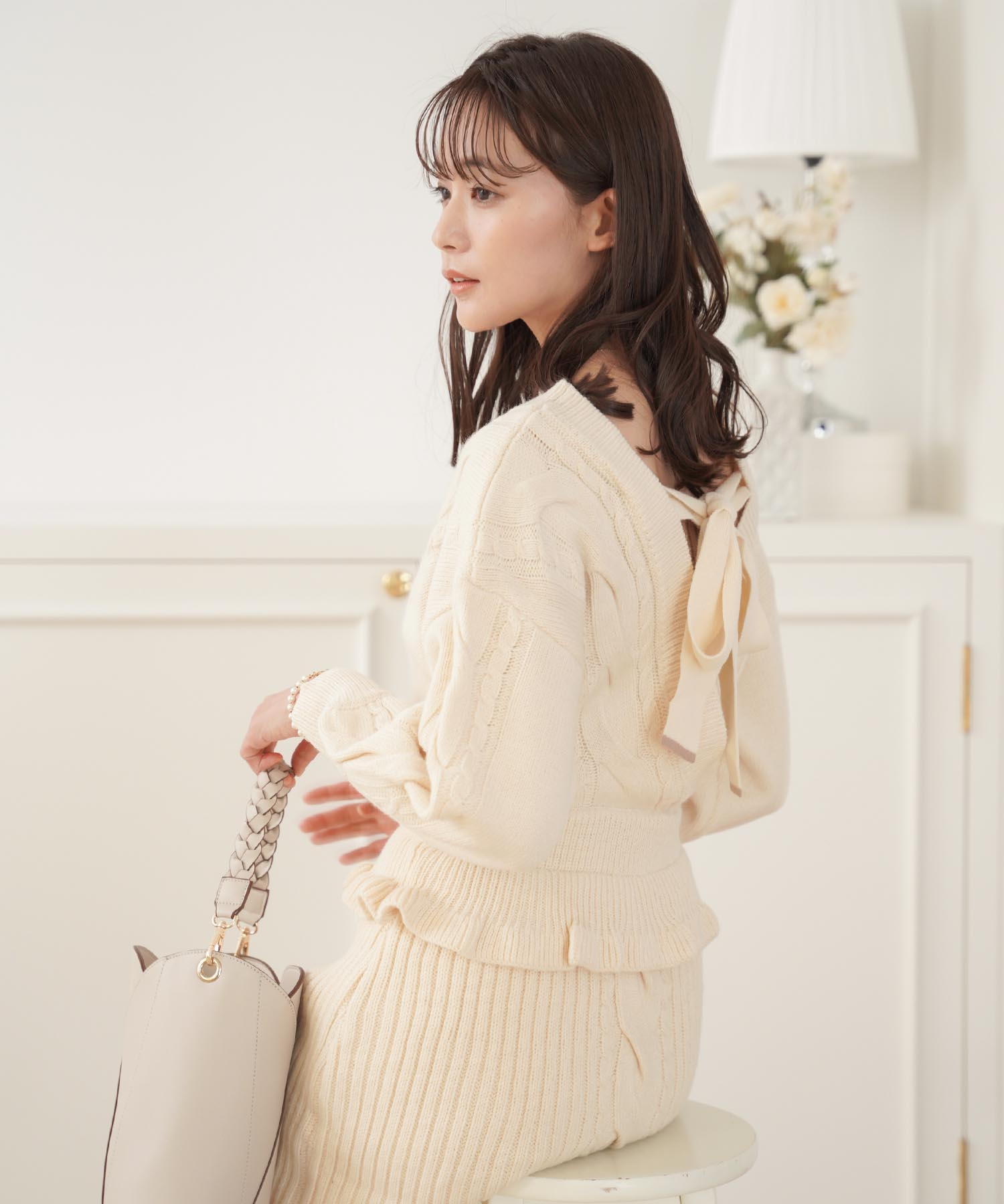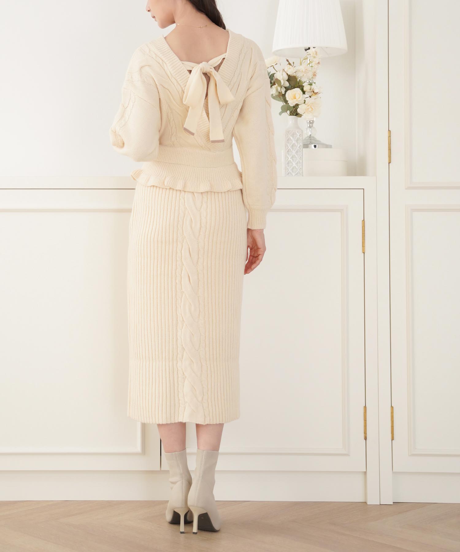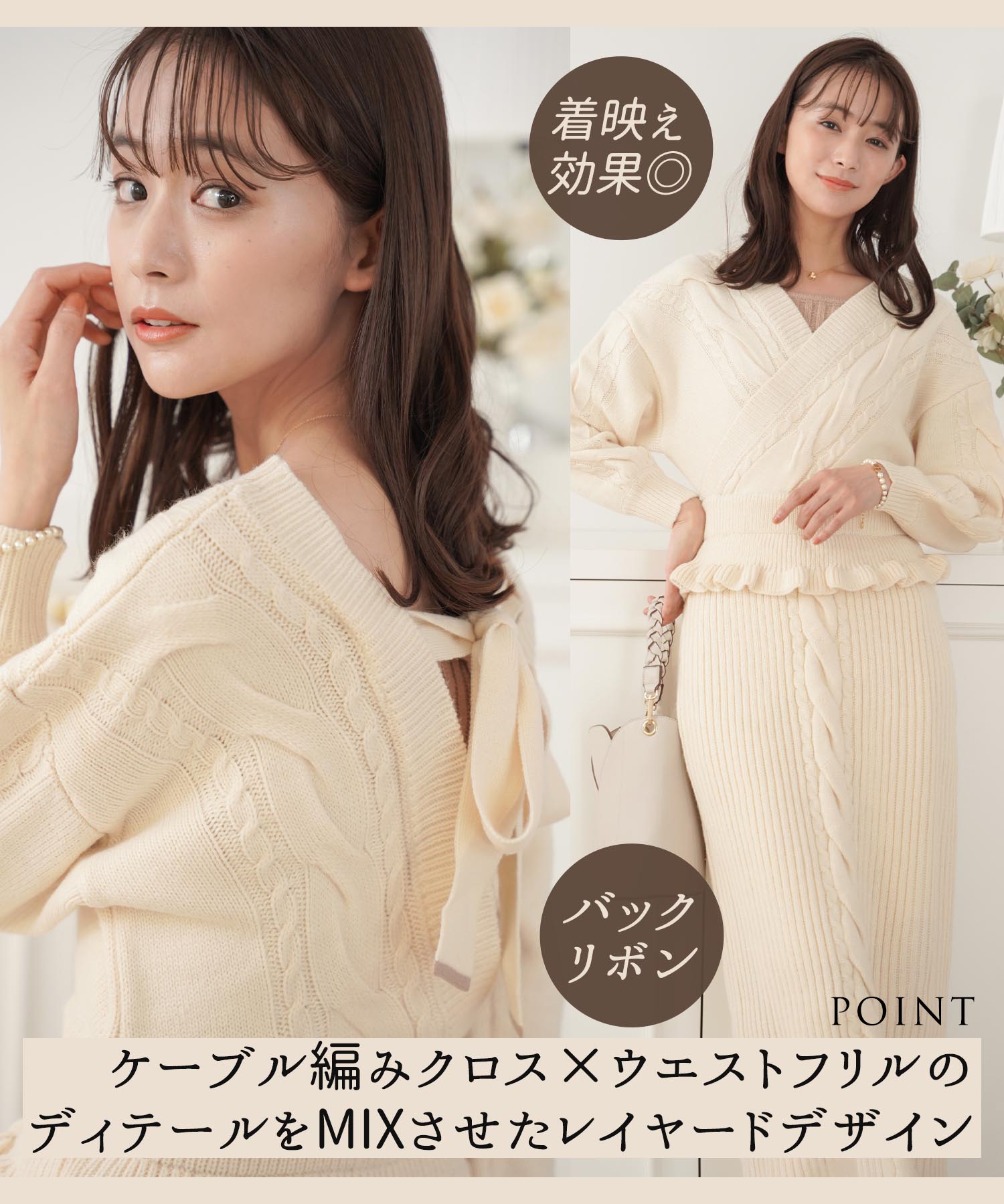 白よりも黄みがかったアイボリーはほっこりとした温かみがあり、冬のニットスタイルをさらに素敵にしてくれます。ケーブル編みのデザインでシンプル過ぎず、コーディネートのアクセントに。バックのリボン仕様で後ろ姿も美人に仕上がります。スカート部分は伸縮性のあるリブ編みで動きやすく、胸元にはモカのニットをチラ見せさせてアクセントに。ホームクリーニング可能なニットなので、気軽に着用できるのもうれしいポイントです。