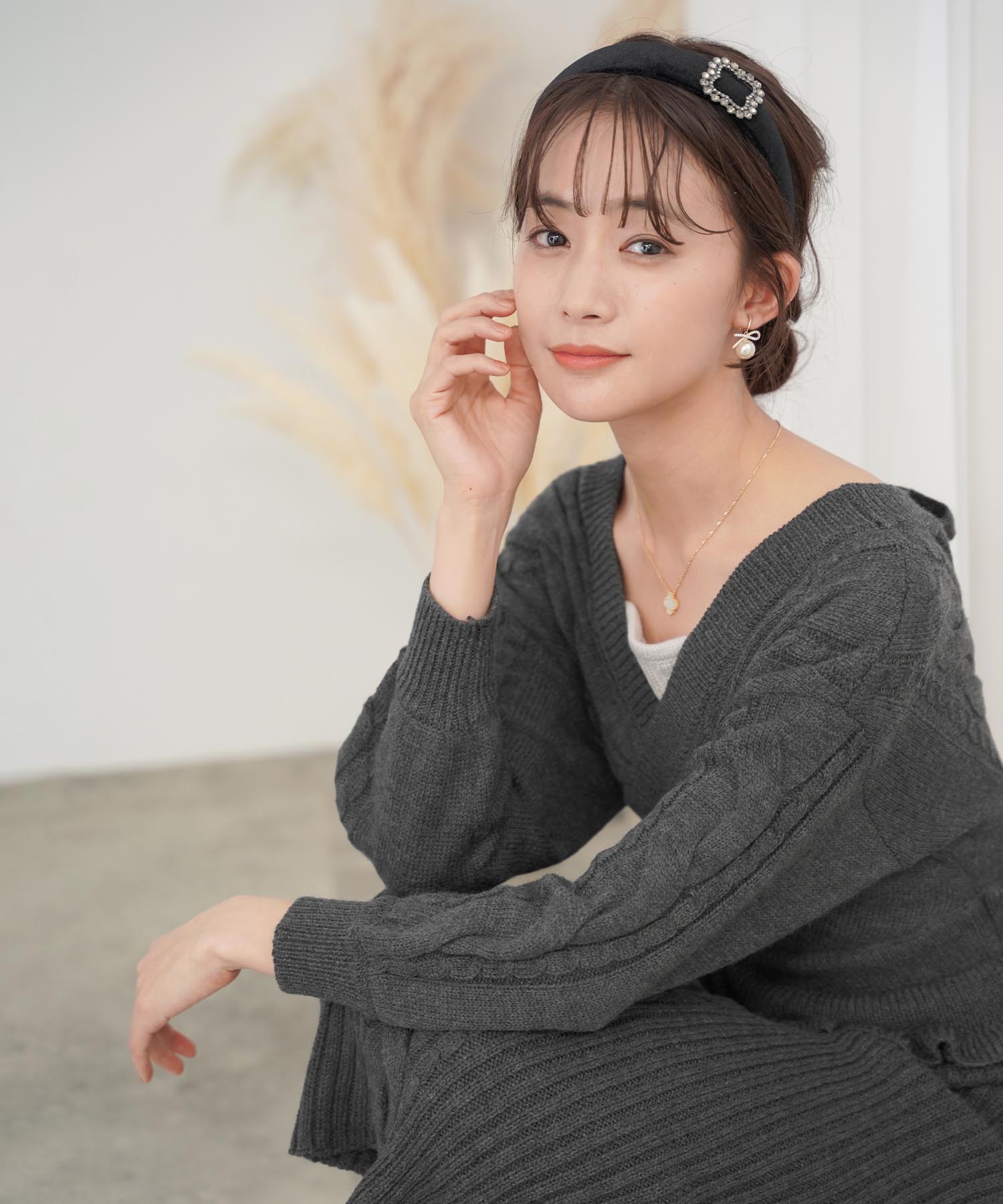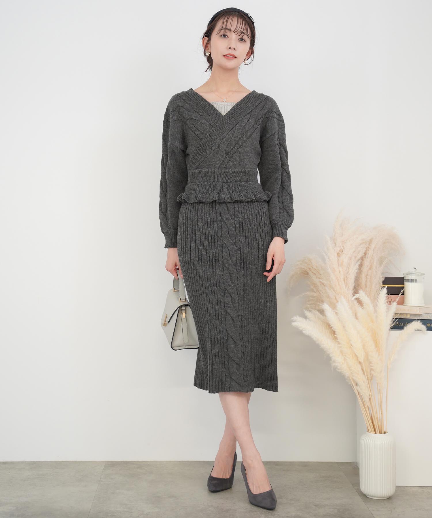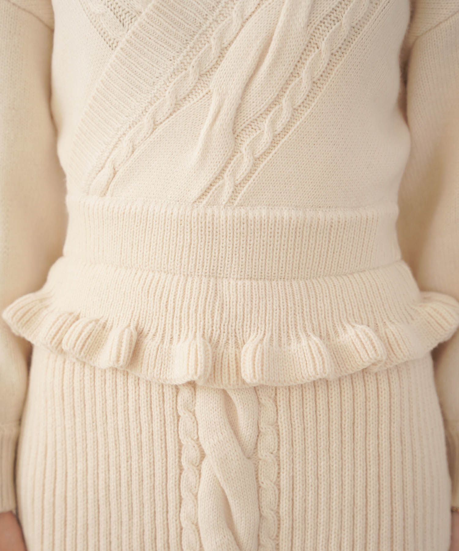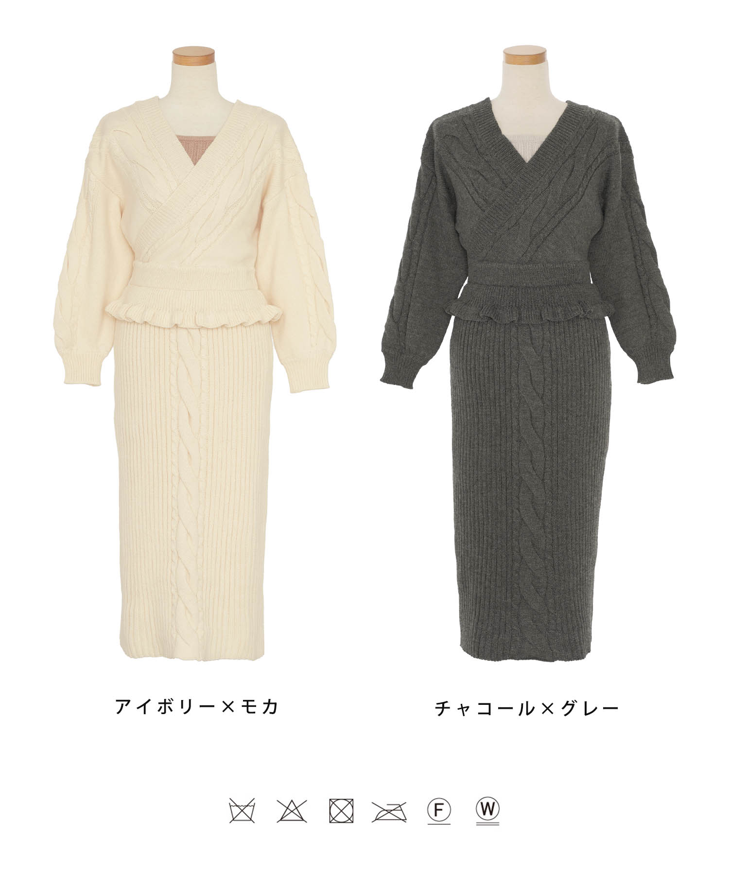 白よりも黄みがかったアイボリーはほっこりとした温かみがあり、冬のニットスタイルをさらに素敵にしてくれます。ケーブル編みのデザインでシンプル過ぎず、コーディネートのアクセントに。バックのリボン仕様で後ろ姿も美人に仕上がります。スカート部分は伸縮性のあるリブ編みで動きやすく、胸元にはモカのニットをチラ見せさせてアクセントに。ホームクリーニング可能なニットなので、気軽に着用できるのもうれしいポイントです。