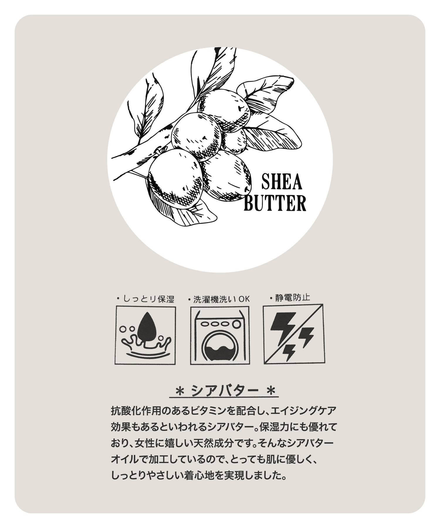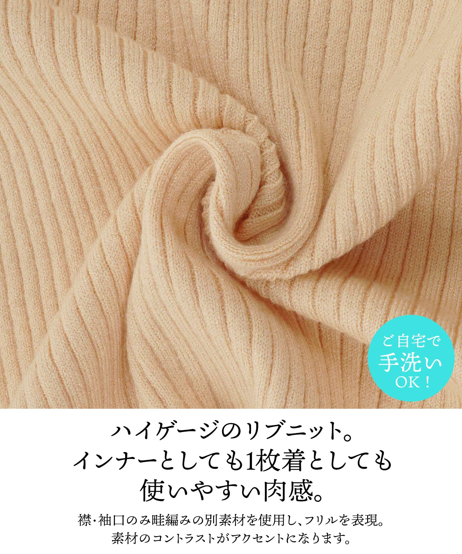 コートの下にも合わせやすい中肉素材のニットインナー。ニットは三色展開で、中でもイエベ春の方におすすめしたいのは「アプリコットカラー」です。フルーツのアプリコットにミルクを注いだような柔らかい色合いが、イエベ春の方の肌を明るく引き立てます。リブ編みで伸縮性があり着心地も抜群。さらに、ニット糸にはシアバター加工が施されており、乾燥しがちな冬の肌にしっとりと寄り添います。