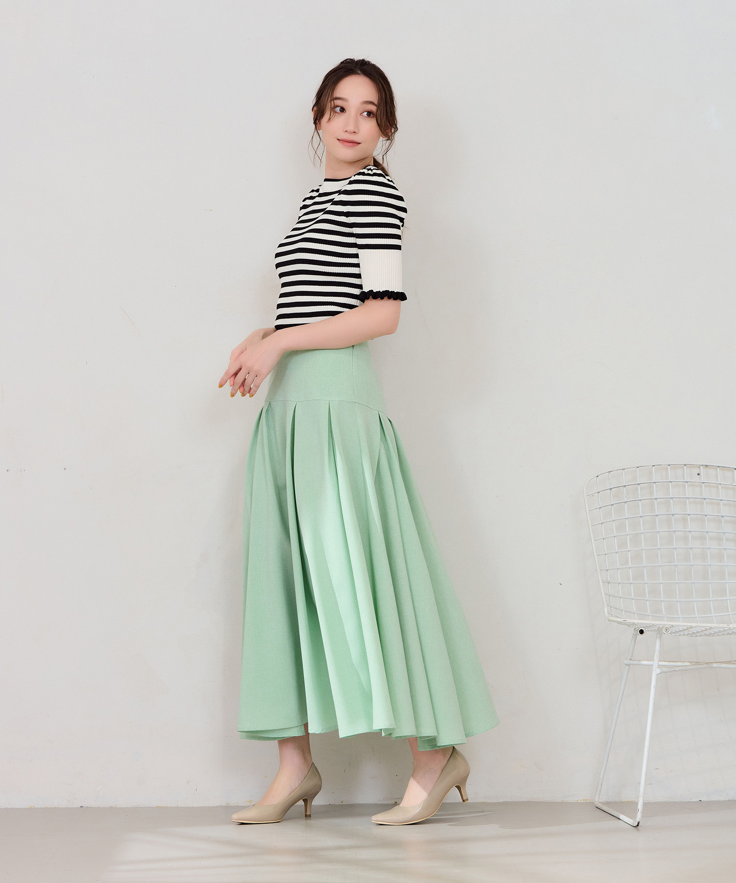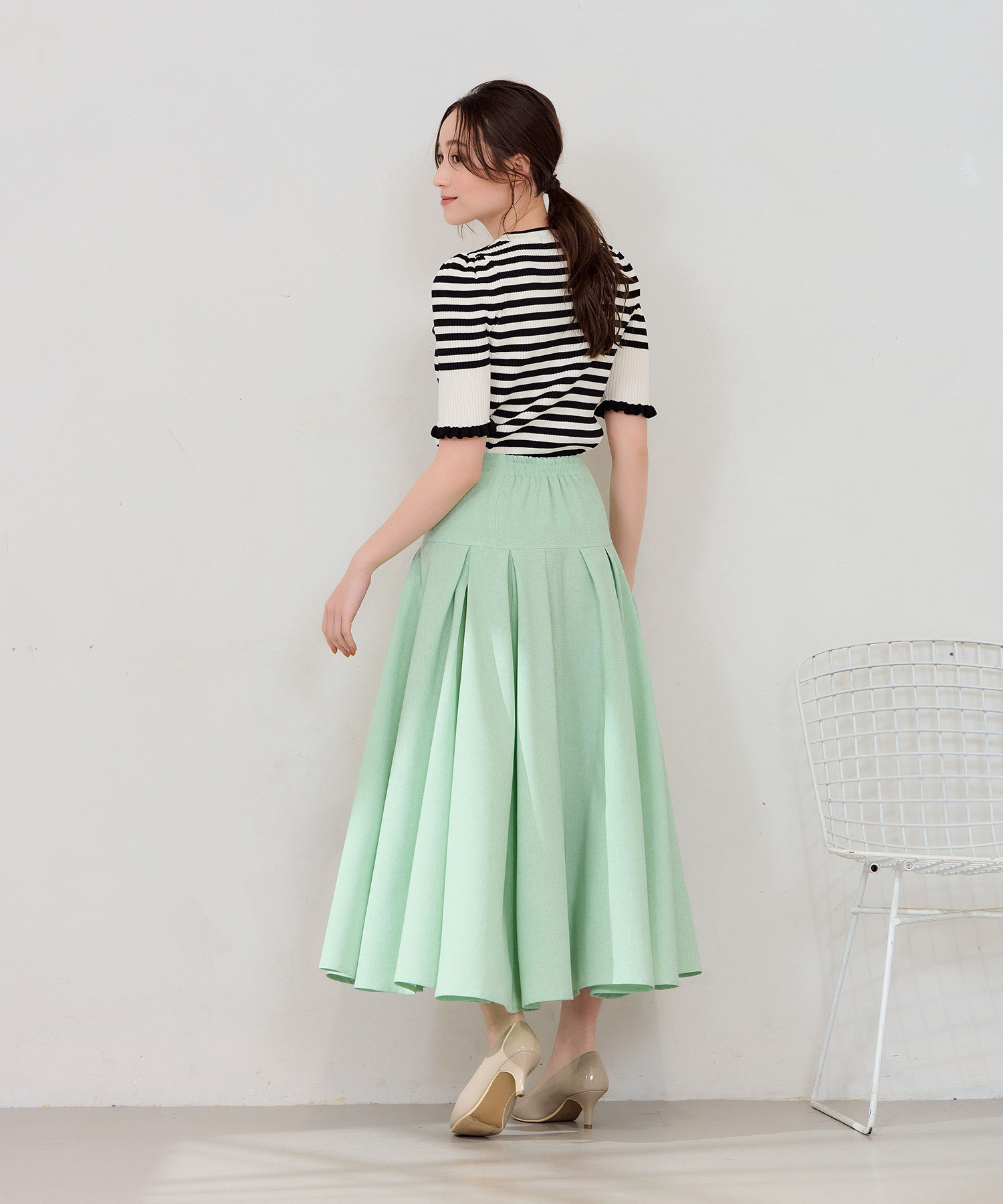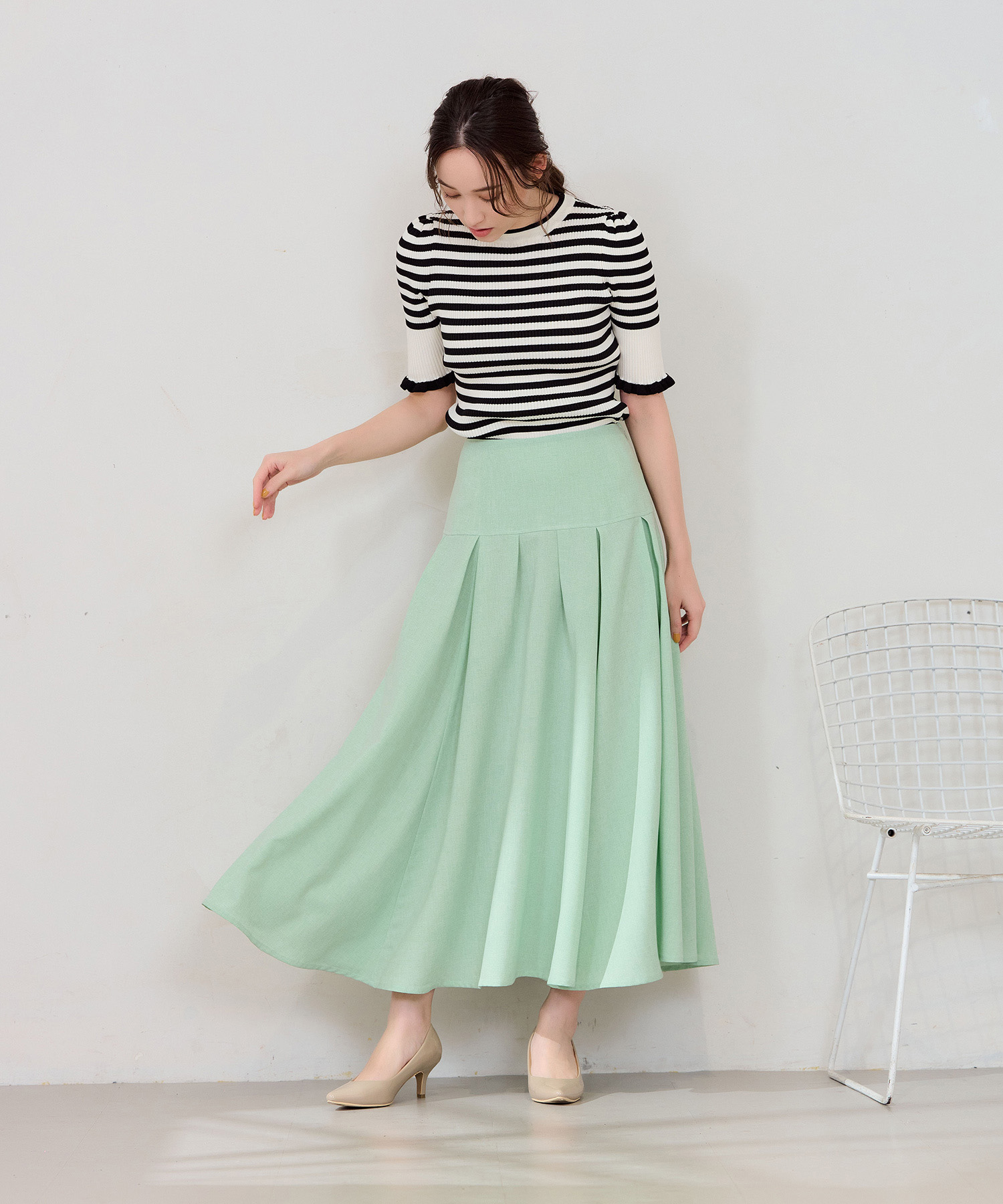 春のコーデにぴったりなリネンライクスカート。イエベ春タイプにおすすめしたいカラーはグリーンアップルのようにフルーティで爽やかなミントグリーンです。ボーダーの半袖ニットトップスと合わせ、程よくフェミニンでカジュアルな仕上がりにしました。足元はヌーディーなベージュのパンプスで大人っぽさをプラス。涼やかなリネンライク素材は春夏に大活躍し、腰回りはすっきりと、裾にかけてふんわり広がるドラマティックなシルエットが特徴です。イエベ春のあなたにぴったりのミントグリーンコーデをぜひお試しください。