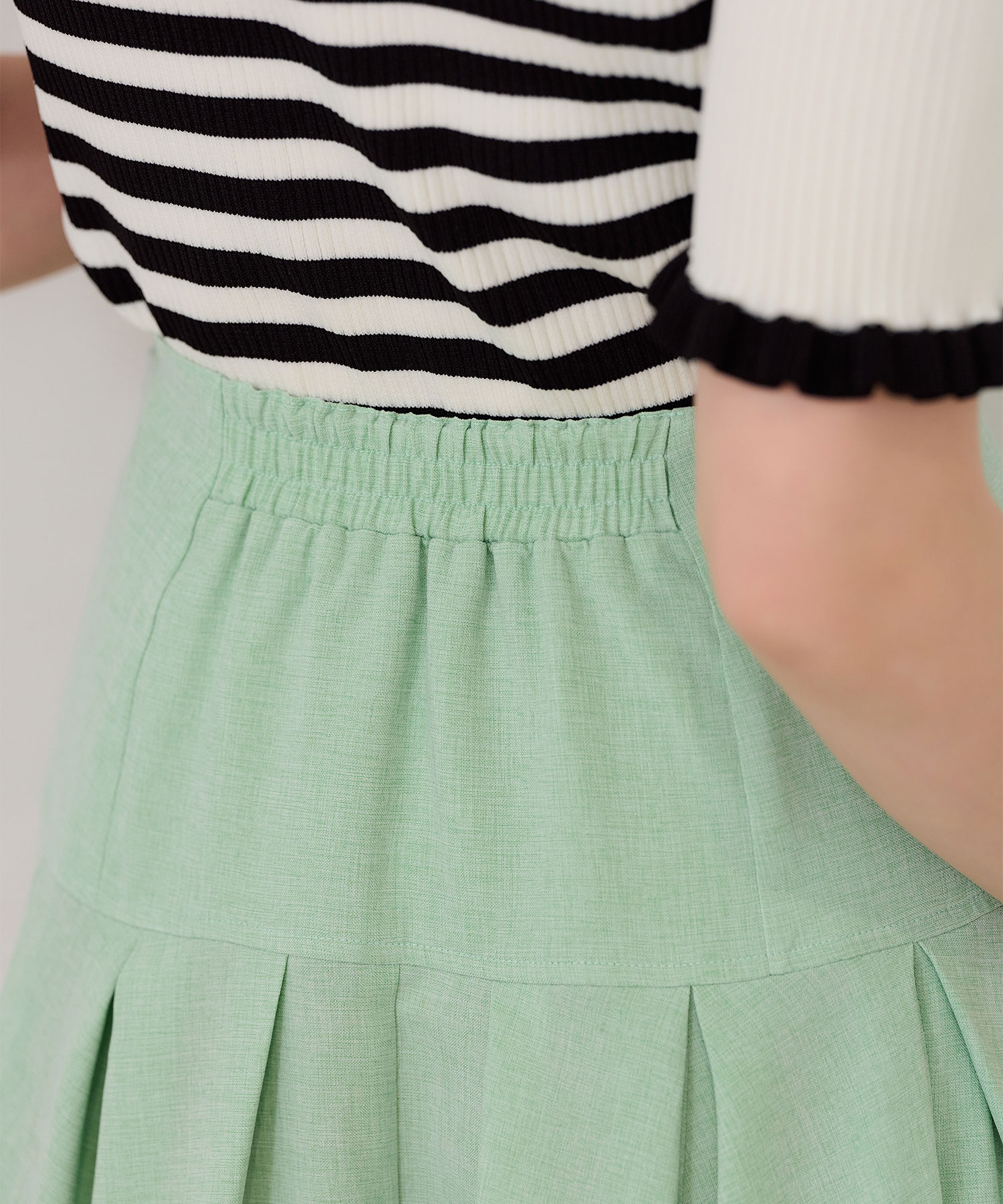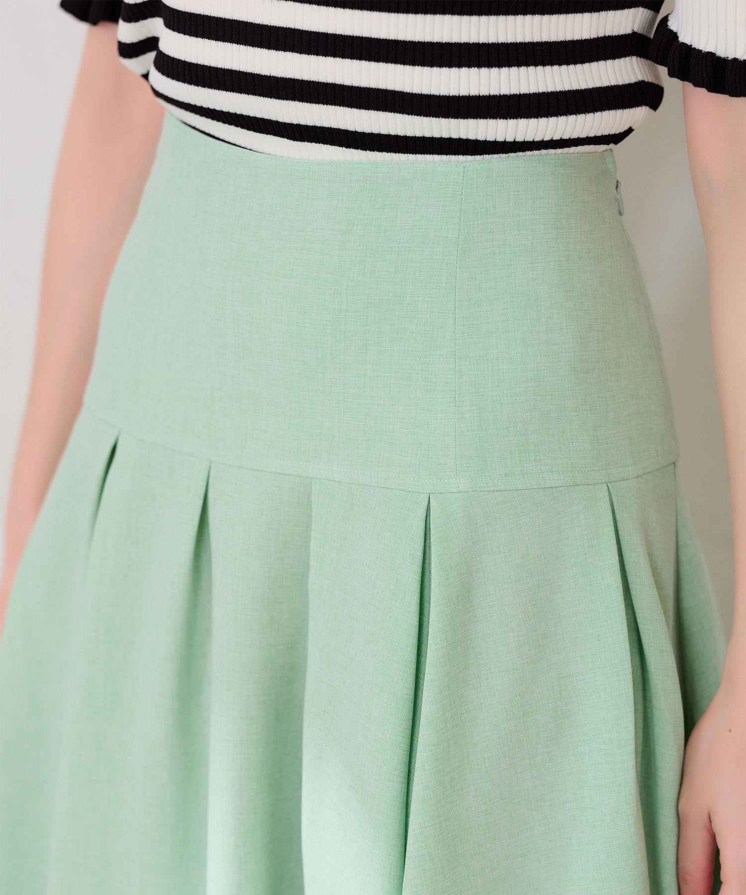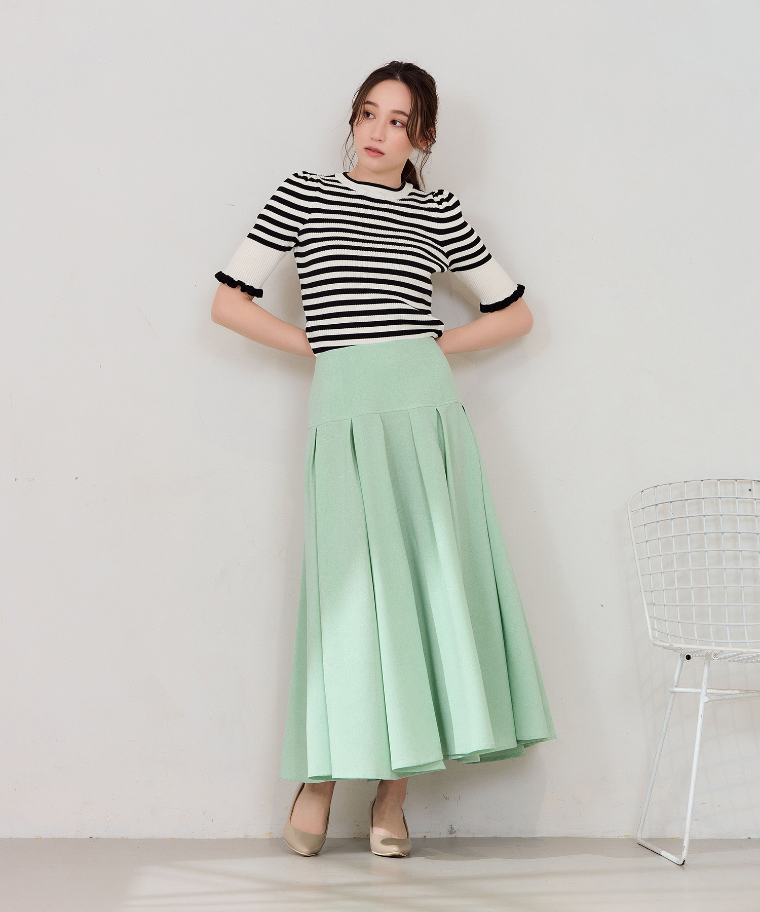 春のコーデにぴったりなリネンライクスカート。イエベ春タイプにおすすめしたいカラーはグリーンアップルのようにフルーティで爽やかなミントグリーンです。ボーダーの半袖ニットトップスと合わせ、程よくフェミニンでカジュアルな仕上がりにしました。足元はヌーディーなベージュのパンプスで大人っぽさをプラス。涼やかなリネンライク素材は春夏に大活躍し、腰回りはすっきりと、裾にかけてふんわり広がるドラマティックなシルエットが特徴です。イエベ春のあなたにぴったりのミントグリーンコーデをぜひお試しください。