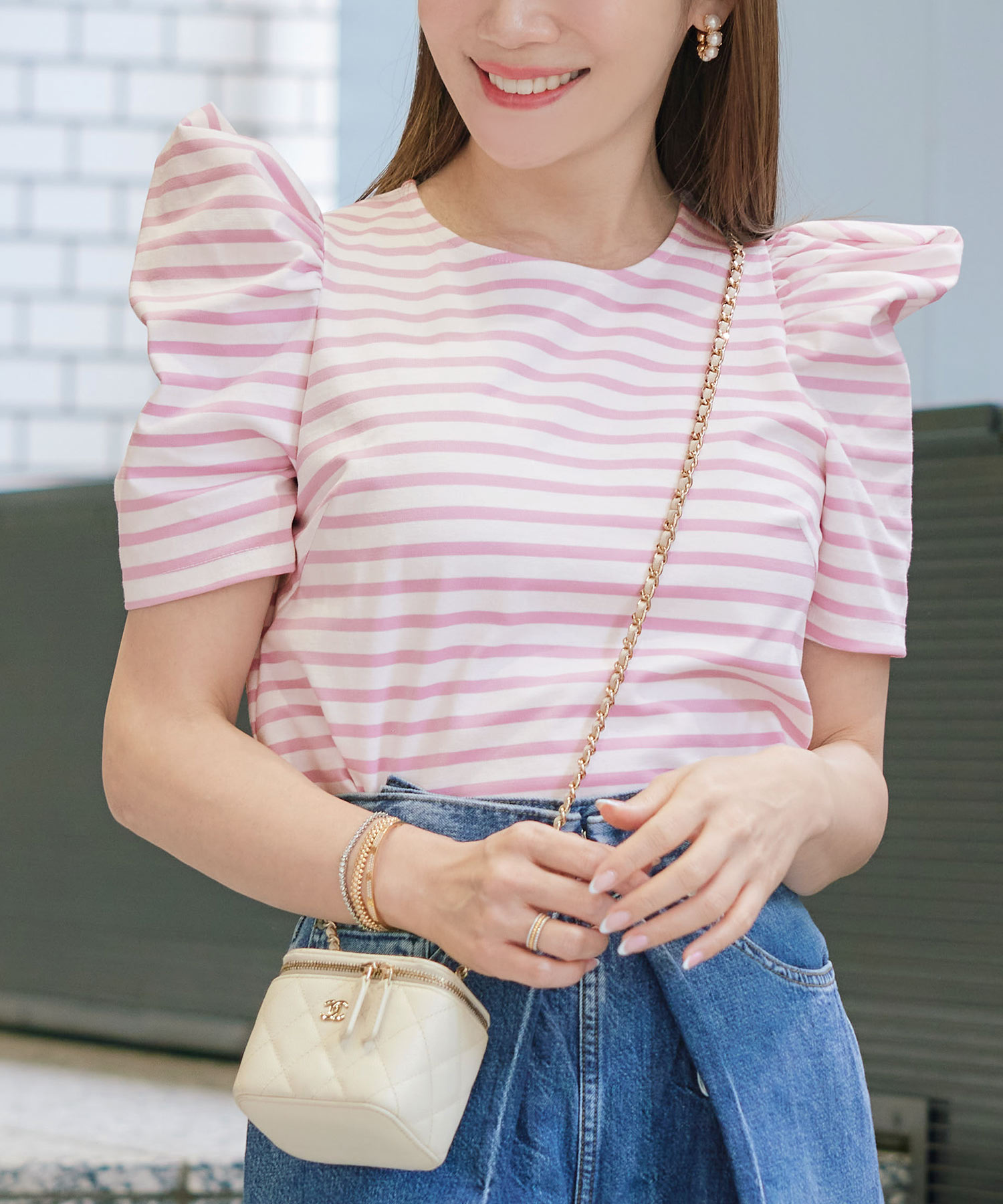 猫耳風のギャザースリーブがアクセントの半袖カットソー。イエローミックスはフレッシュに、ピンクミックスはやわらかく華やかに着こなせます。ハリと伸縮性のある上品な素材で、手洗いOKなのも嬉しいポイント。