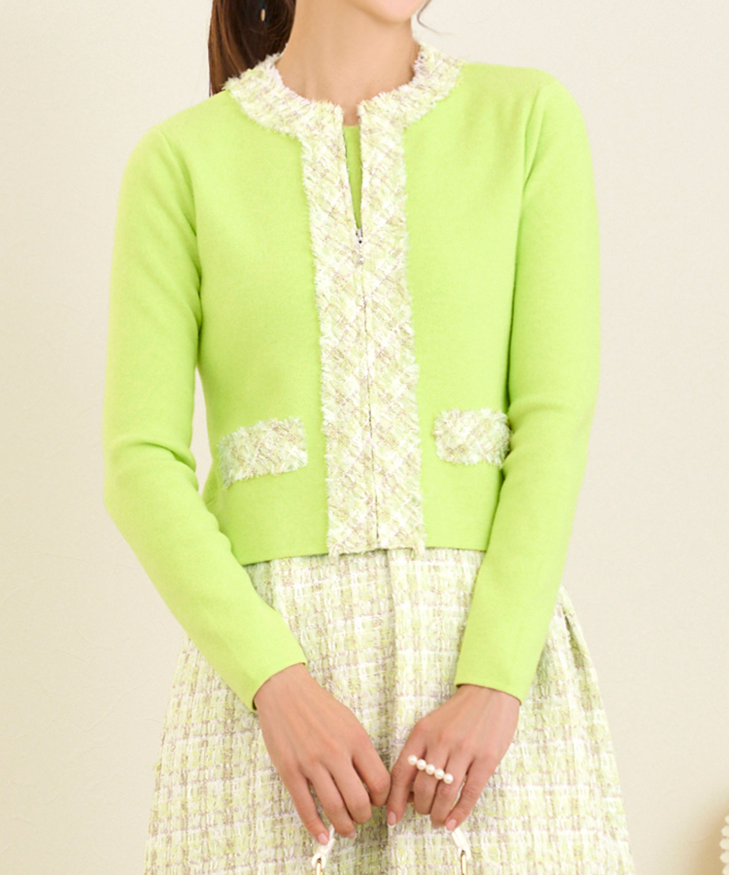 果実のようにフレッシュなカラーが目を引くニットカーディガン。前立てや襟、ポケットにツイードをあしらい、羽織るだけで上品見えが叶います。Tシャツとデニムのシンプルコーデに、さっと肩掛けするだけでも大人のきれいめデニムスタイルに仕上がります。