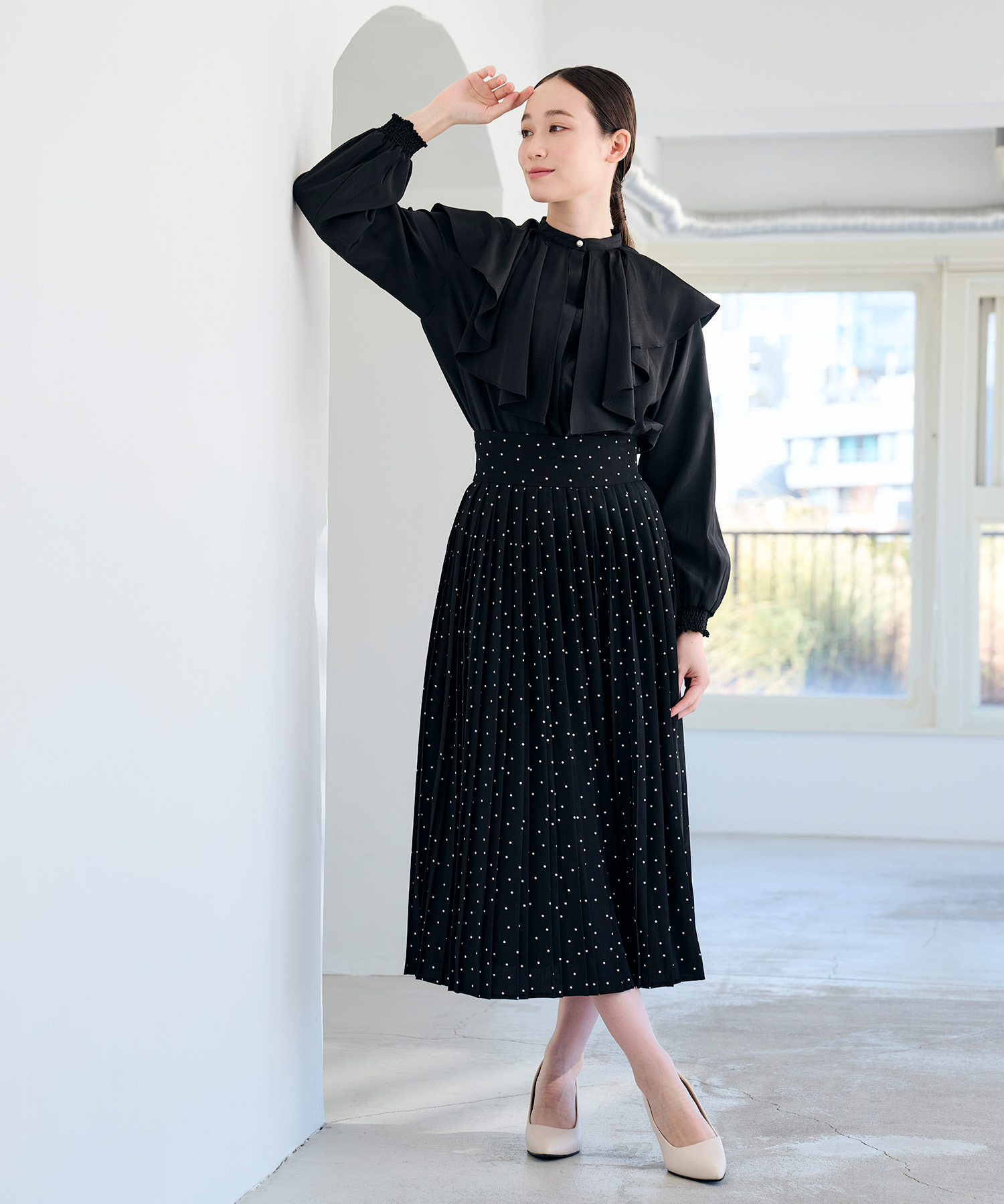 こちらも襟に大きめラッフルを挟み込んだデコラティブなブラウス。トップのボタンはパール素材になっているので上品で洗練された表情に仕上がります。一緒に合わせたプリーツスカートはドット柄でブラックスタイルに抜け感を演出。ハイウエスト仕様でメリハリのあるスタイリングを楽しんで。