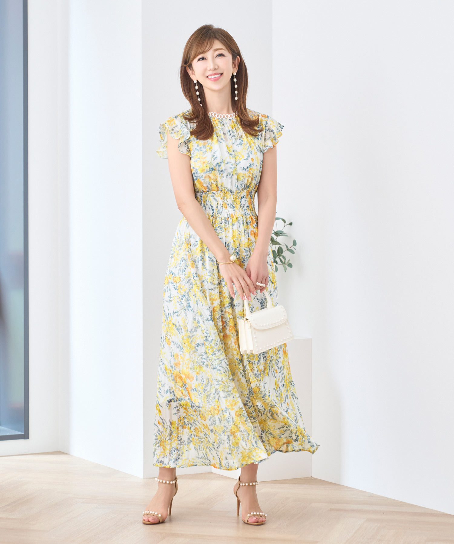 春の陽気を感じる!イエロー花柄プリントワンピースでシーズンムード満点