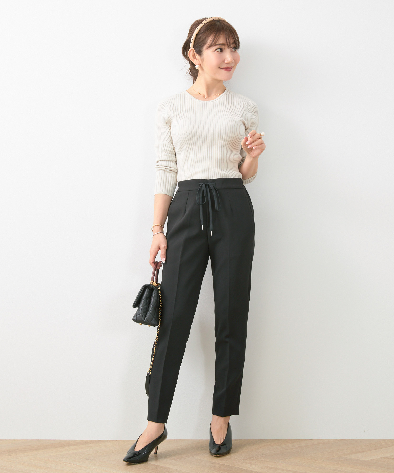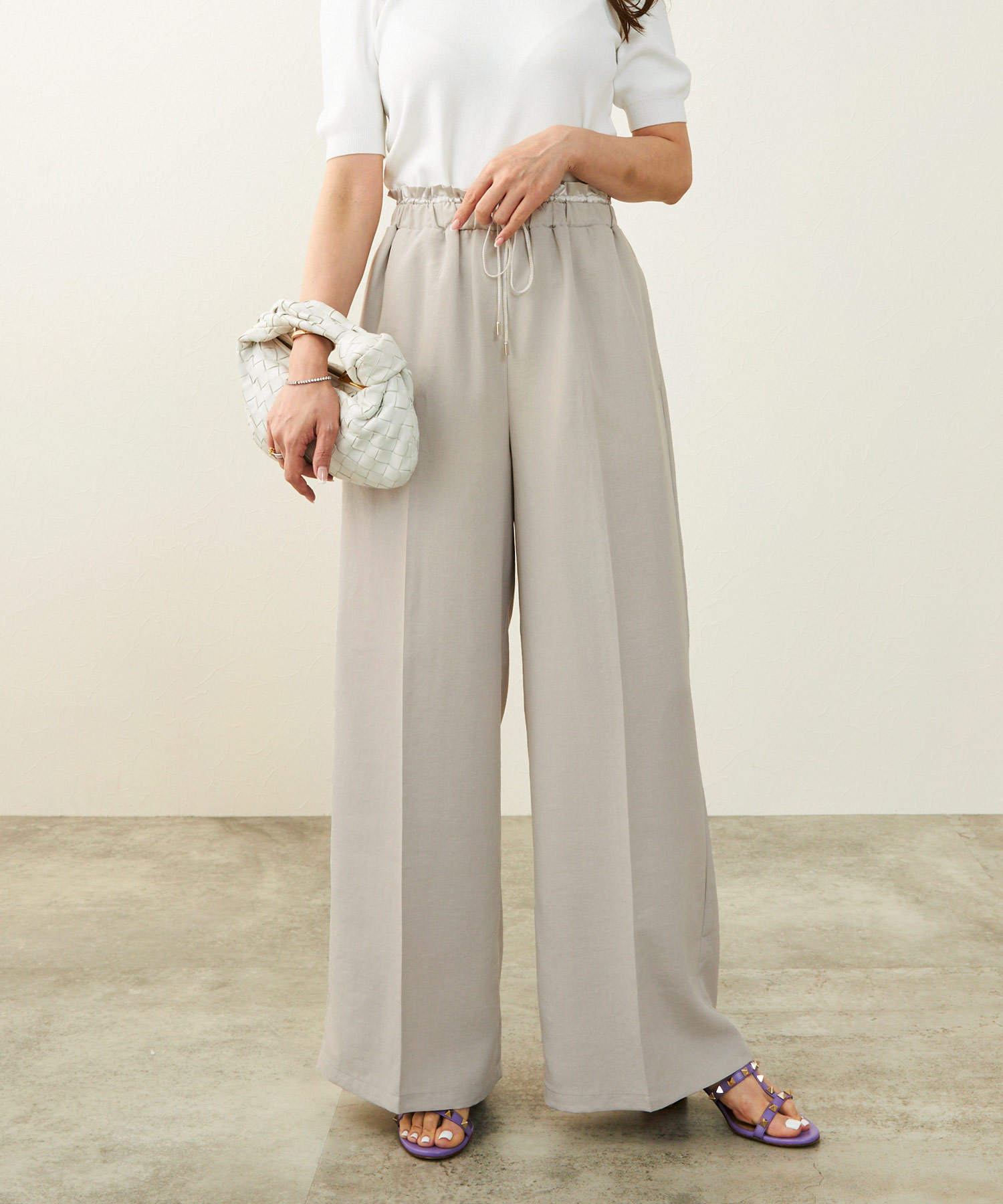 旬のパステルブルーをスタイリッシュに合わせるならパンツで取り入れるのが正解。シンプルなホワイトのブラウスやTシャツと合わせるだけで、爽やかで女性らしい大人のカジュアルスタイルが完成します。ウエストは紐で調整できるドロスト仕様になっており、バックウエストはゴムでリラックスした履き心地が特徴です。さらっとした肌触りとシャリ感のある素材で、春から秋まで快適に着用いただけるパンツです。
